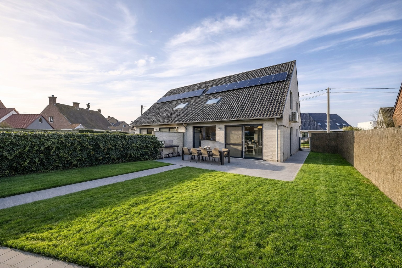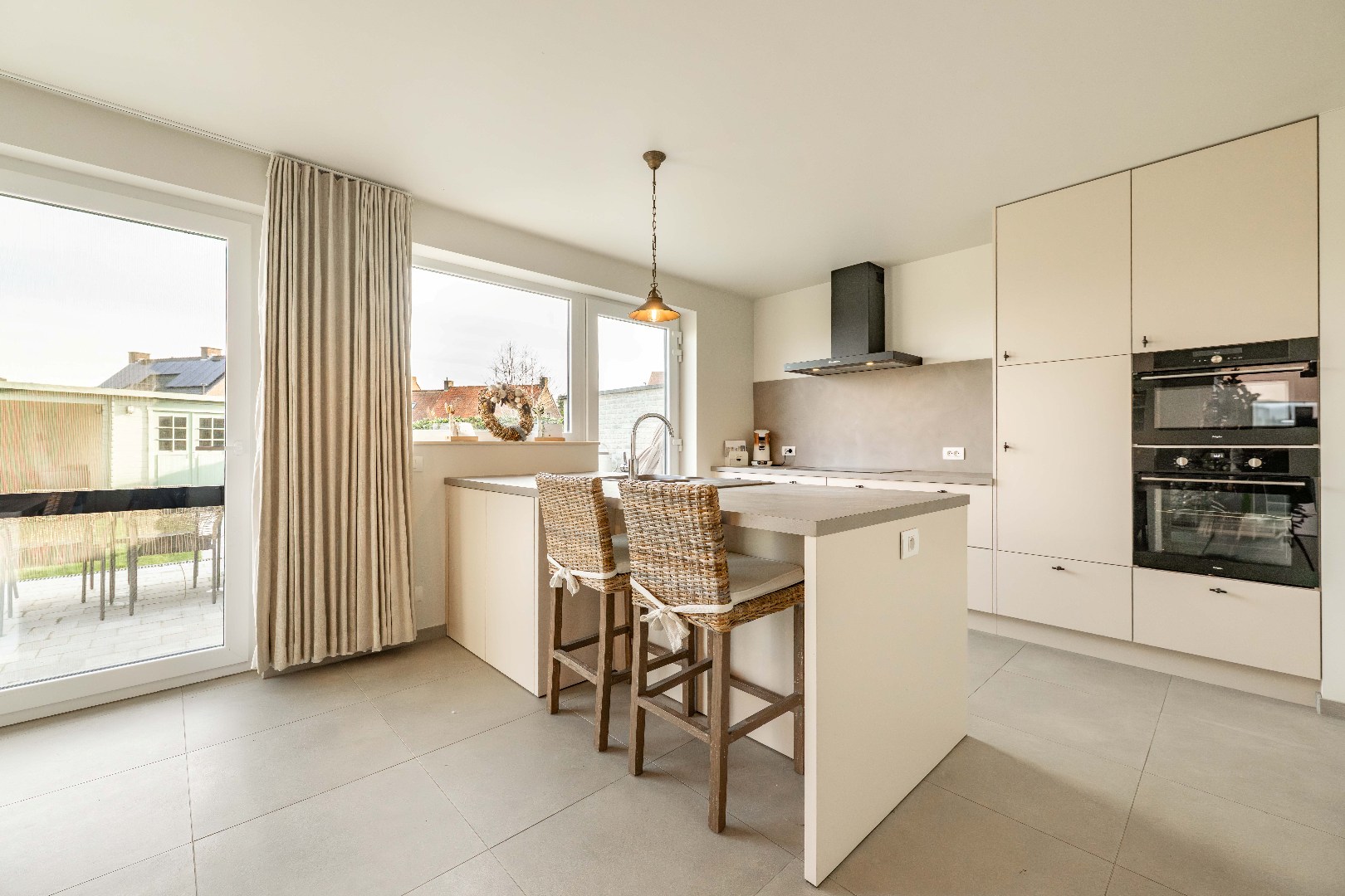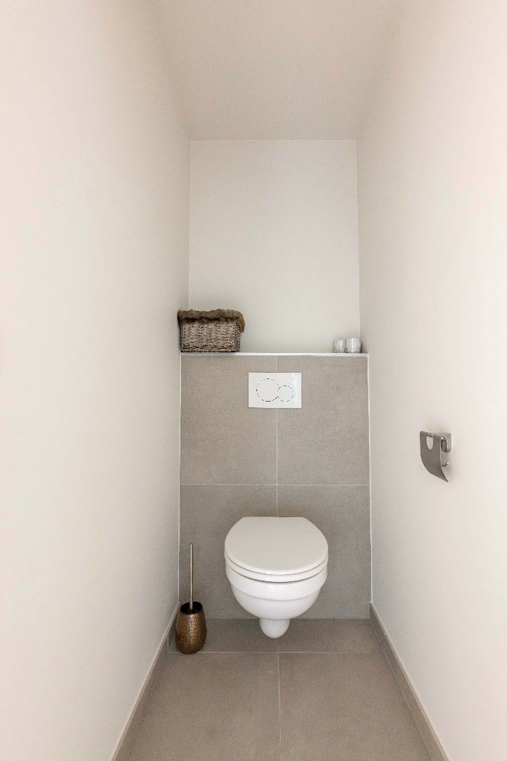 Bij het betreden van de woning komt u binnen in de inkomhal met een apart gastentoilet. De lichtrijke leefruimte met zit- en eethoek sluit naadloos aan op de open, volledig ingerichte keuken, uitgerust met kookplaat, dampkap, dubbele spoelbak, vaatwasmachine, koelkast, microgolf en oven. Vanuit de keuken heeft u rechtstreekse toegang tot de tuin.