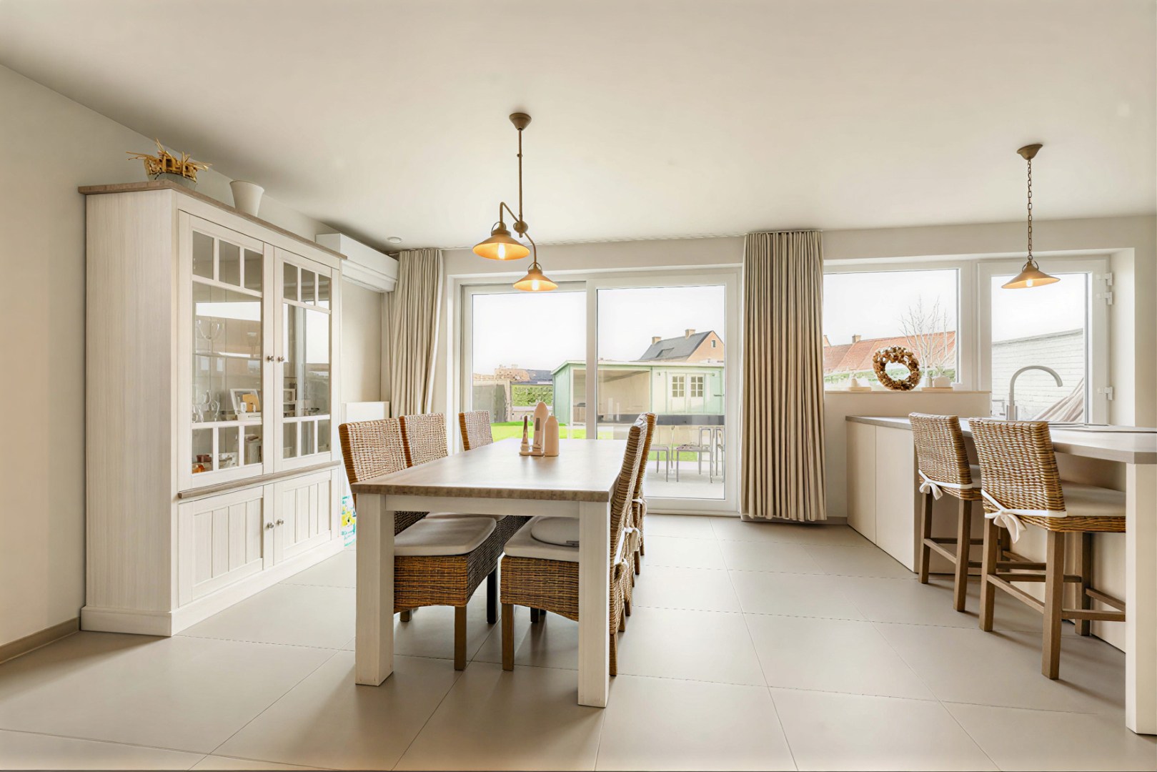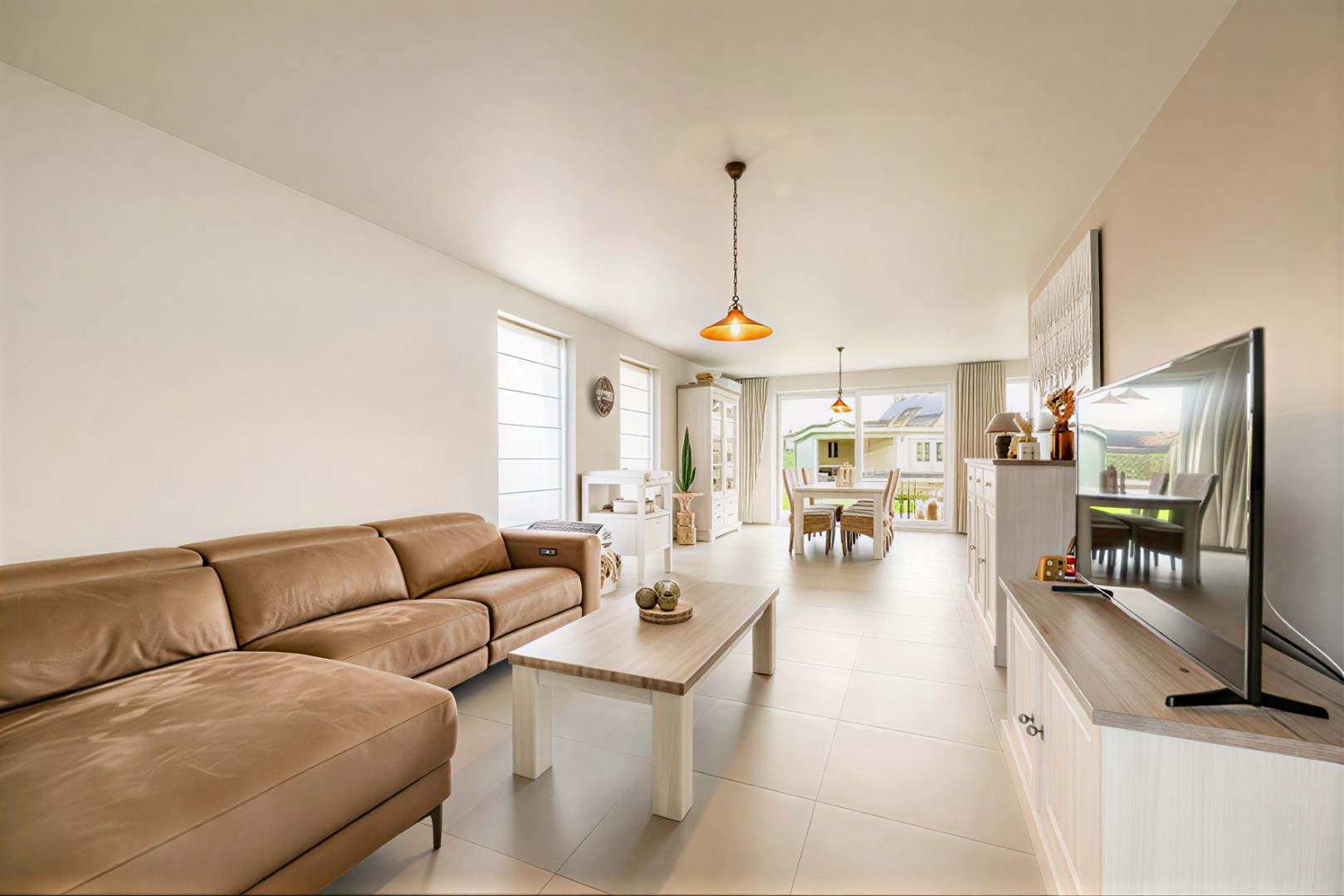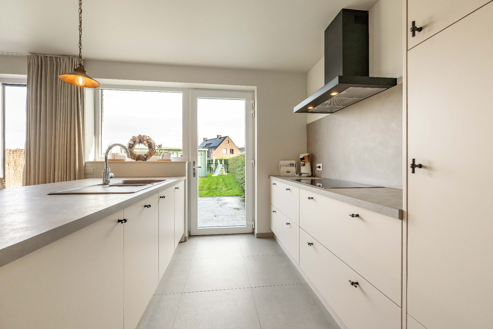 Bij het betreden van de woning komt u binnen in de inkomhal met een apart gastentoilet. De lichtrijke leefruimte met zit- en eethoek sluit naadloos aan op de open, volledig ingerichte keuken, uitgerust met kookplaat, dampkap, dubbele spoelbak, vaatwasmachine, koelkast, microgolf en oven. Vanuit de keuken heeft u rechtstreekse toegang tot de tuin.
