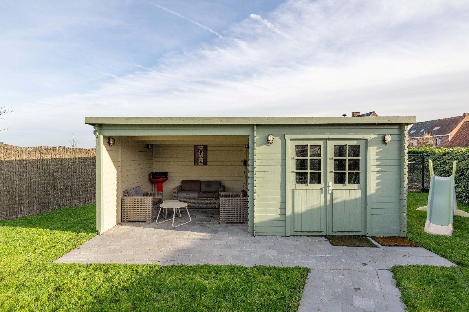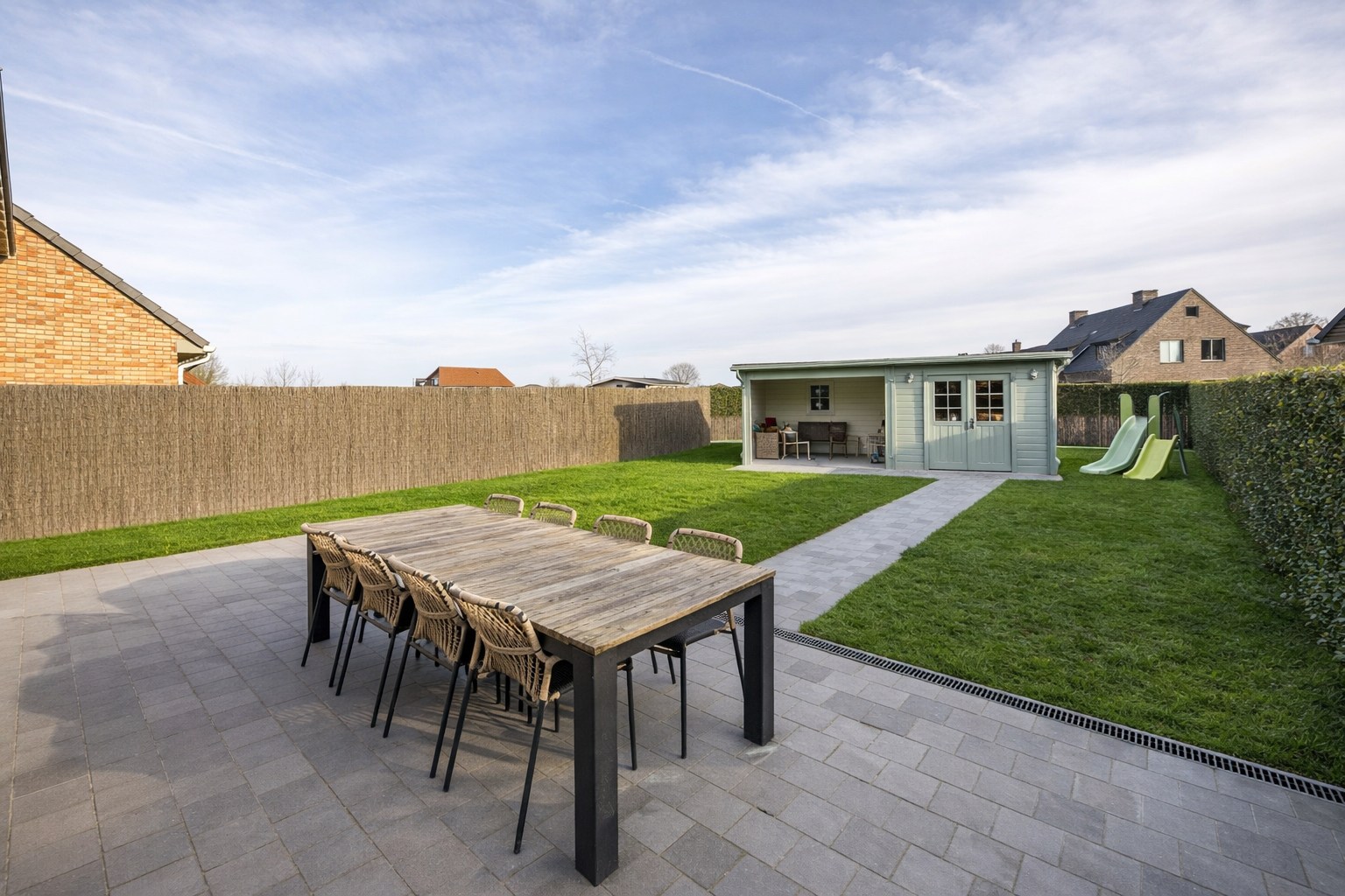 De woning beschikt over een volledig aangelegde zongerichte tuin, met een praktische tuinberging en een overdekt terras van 20 m². Op het eigen perceel is er parkeergelegenheid voor 2 wagens.