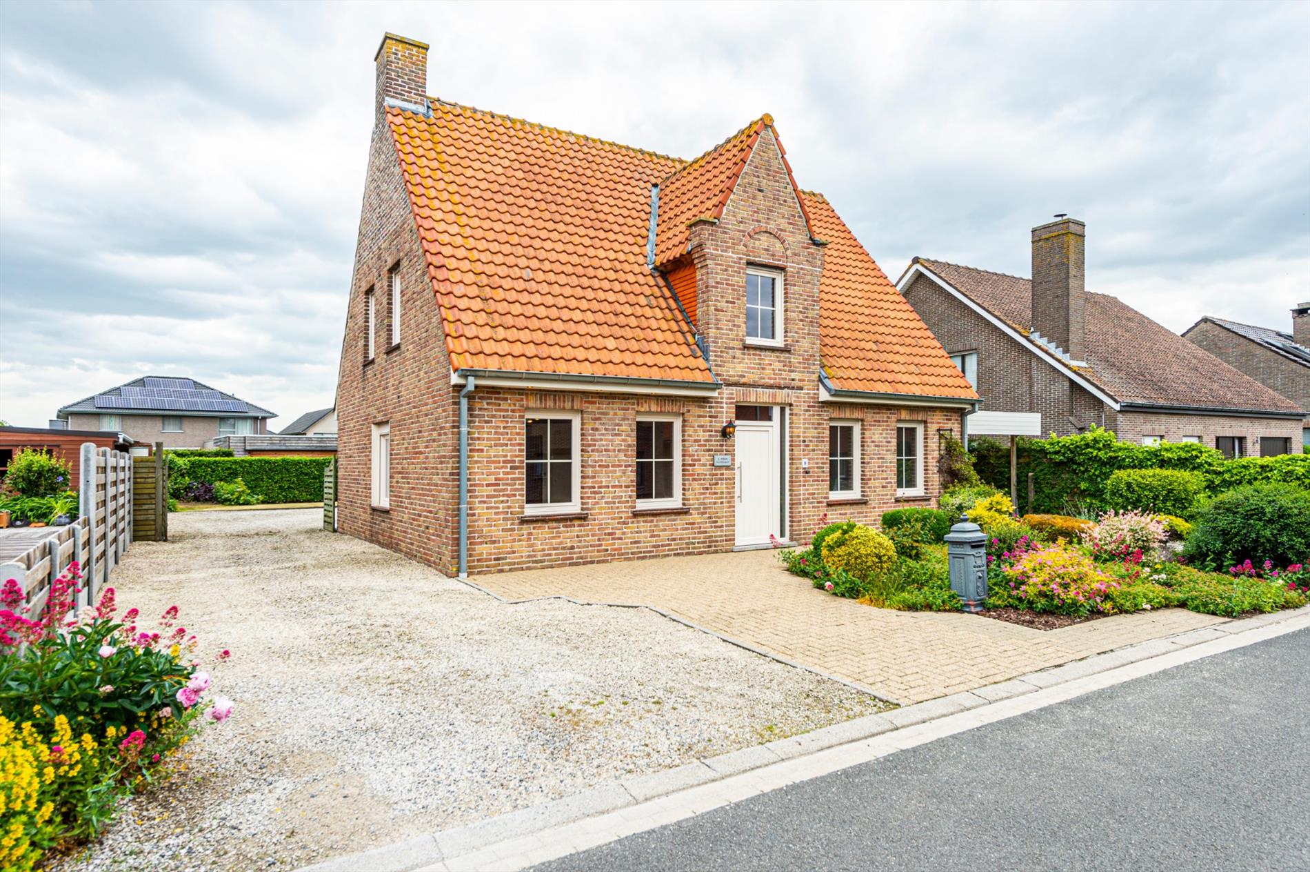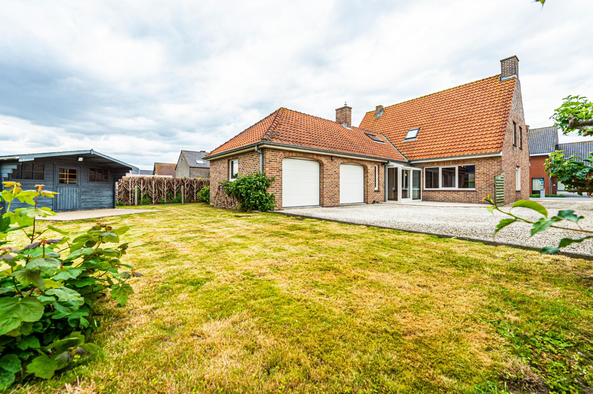 De tuin geniet een west ligging en omvat een opritlaan in kiezel, afgesloten met handmatige poort, een tuinberging.