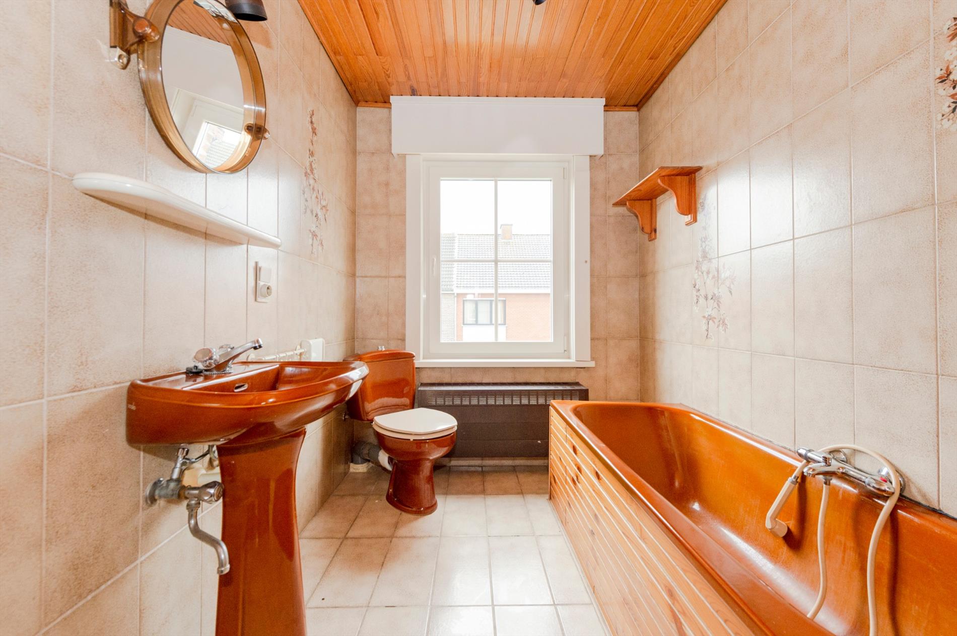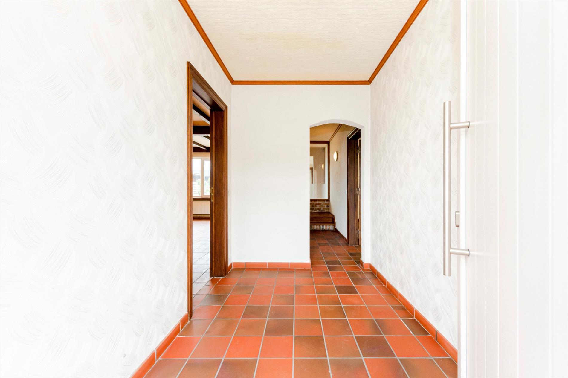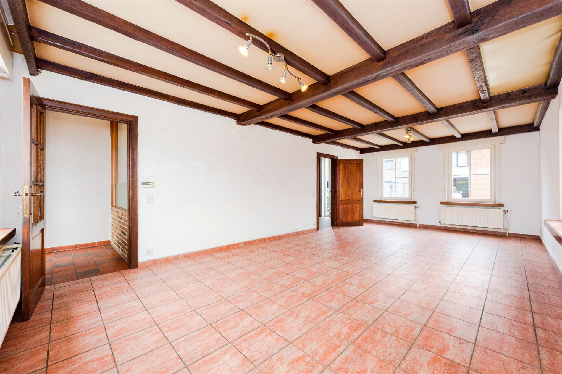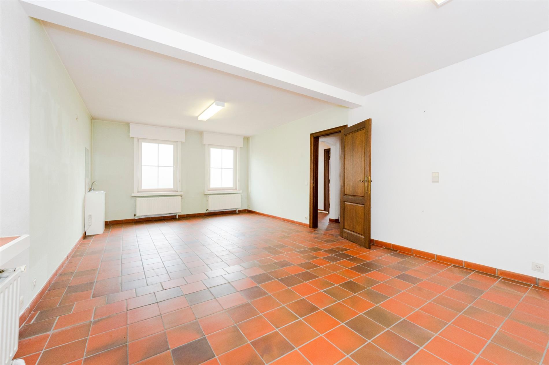 We komen binnen in de ruime inkomhal. Rechts hebben we het bureel met sanitaire voorziening (voormalige praktijkruimte), links van de inkom is de ruime leefruimte met aansluitend ingerichte keuken (kookplaat | dampkap | dubbele spoelbak | vaatwasser | oven en microgolfoven). Via het schuifraam in de keuken is er directe toegang tot het terras/tuin.