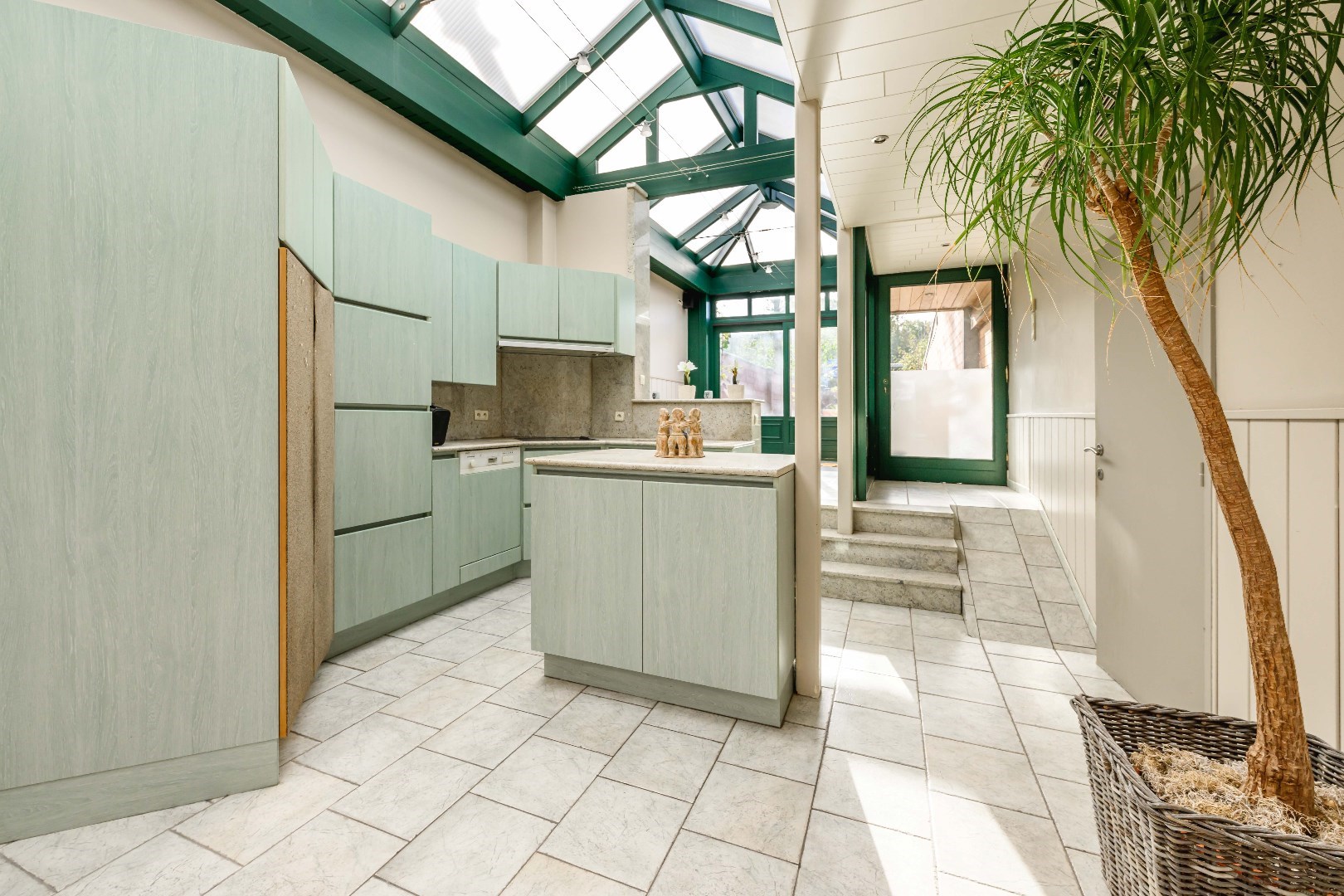 Het woongedeelte omvat een inkom met toegang tot de lichtrijke leefruimte met gezellige gashaard verder is er de open ingerichte keuken (kookplaat | dampkap | vaatwasmachine | frigo) met lichtrijke uitbouw en directe toegang tot de zongerichte tuin.
