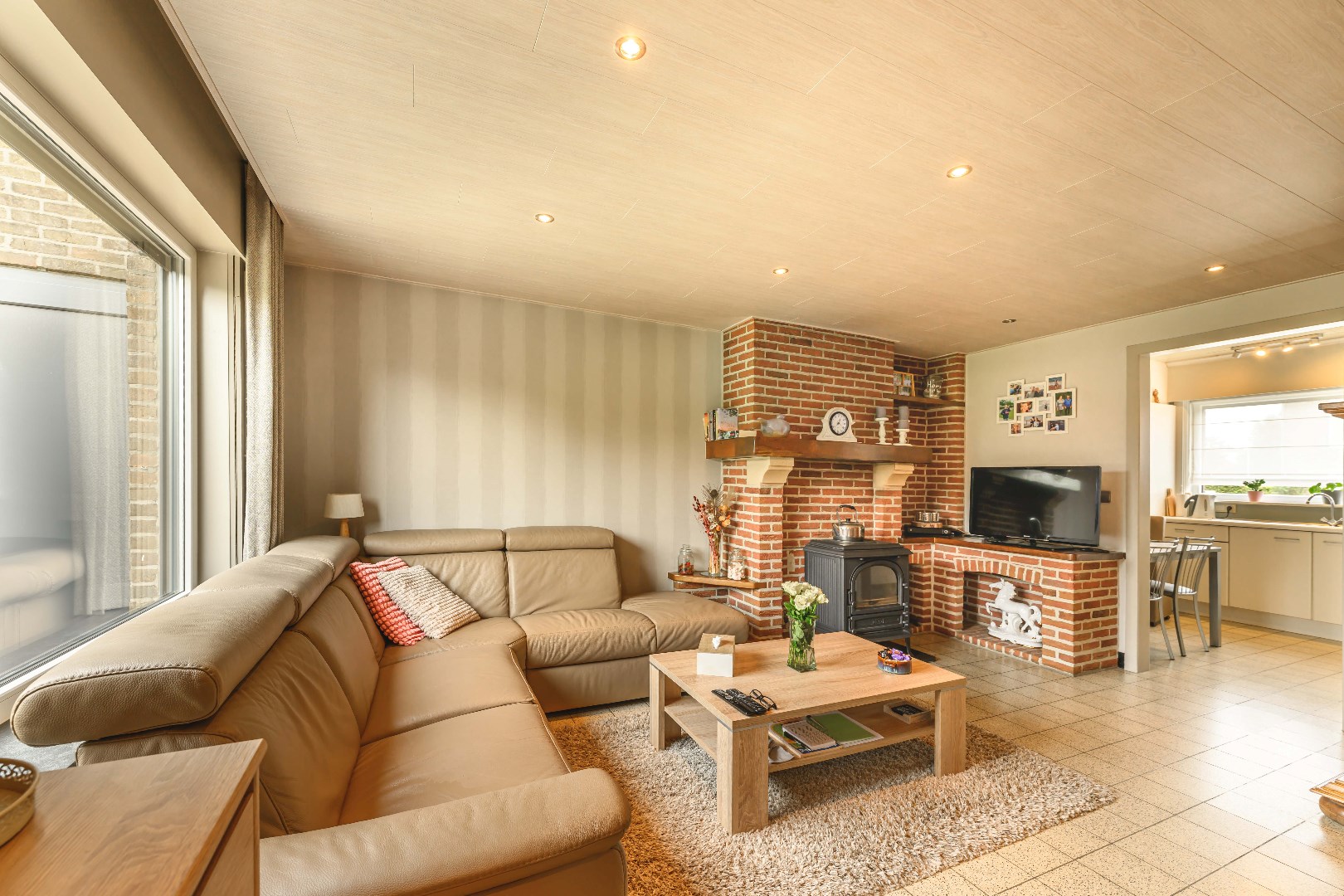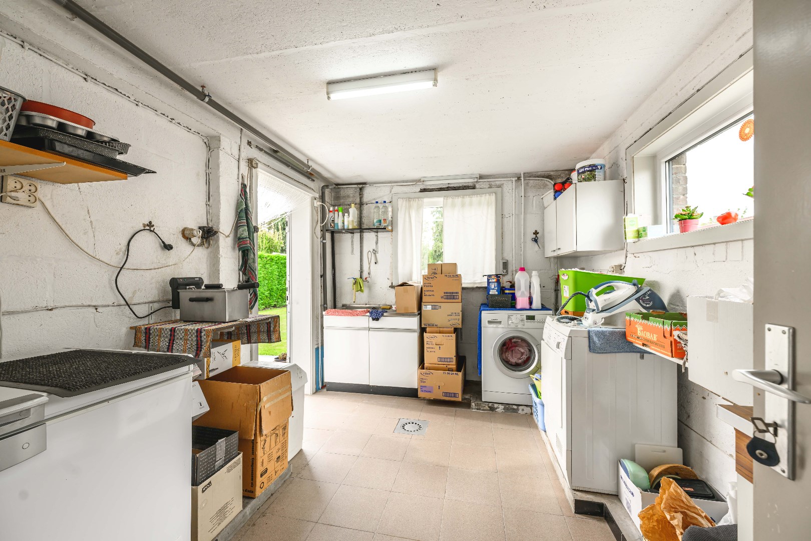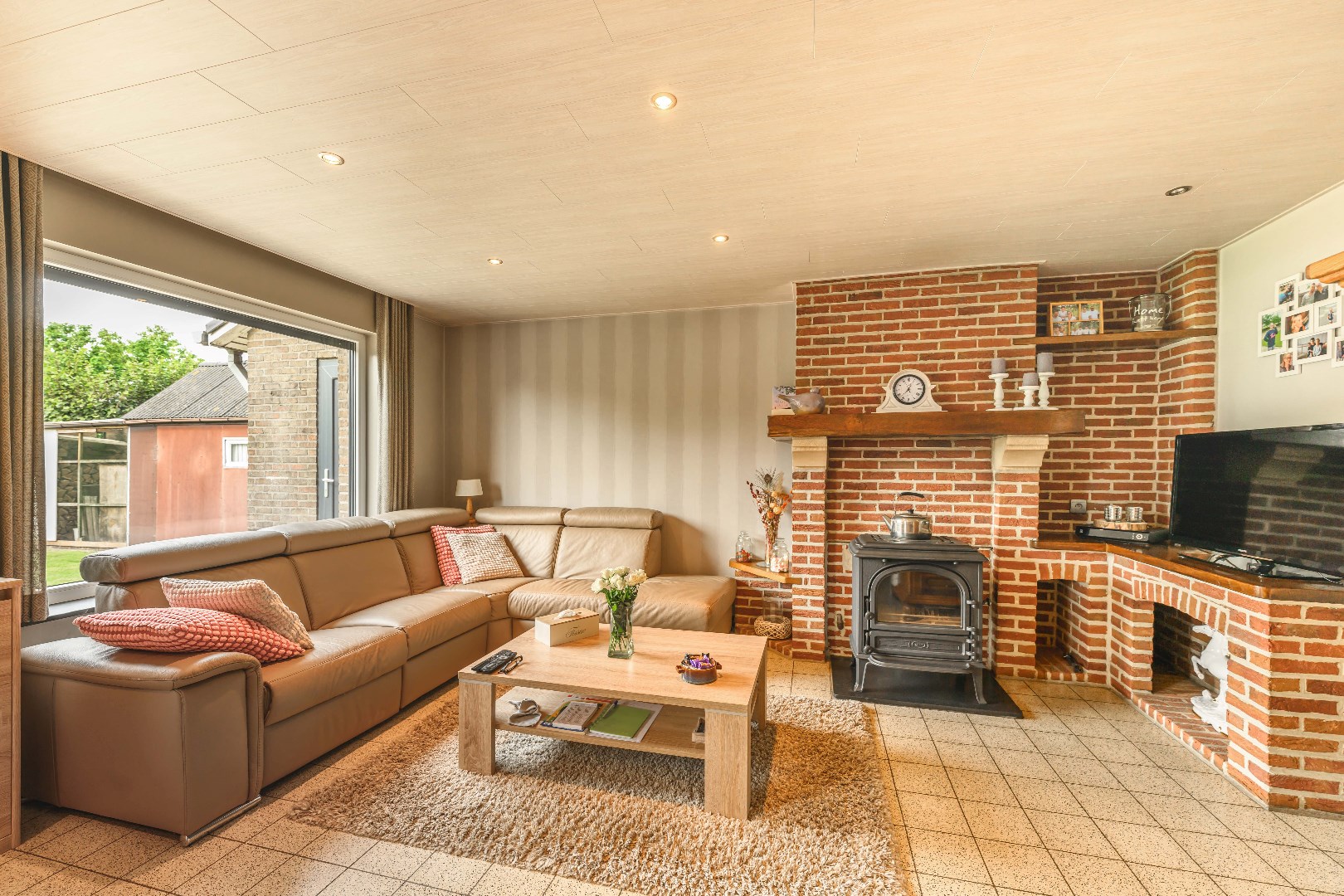 U komt binnen via de inkomhal met apart gastentoilet. Vervolgens is er onder de trap een praktische berging. Verder komt U terecht in de lichtrijke leefruimte met zit- en eethoek en uitgerust met een gezellige houtkachel en directe toegang tot de tuin. Aansluitend is er de ingerichte keuken (kookplaat | dampkap | oven | microgolf | frigo | dubbele spoelbak). Van hieruit is er toegang tot de garage en wasplaats met aansluiting voor wasmachine en droogkast.