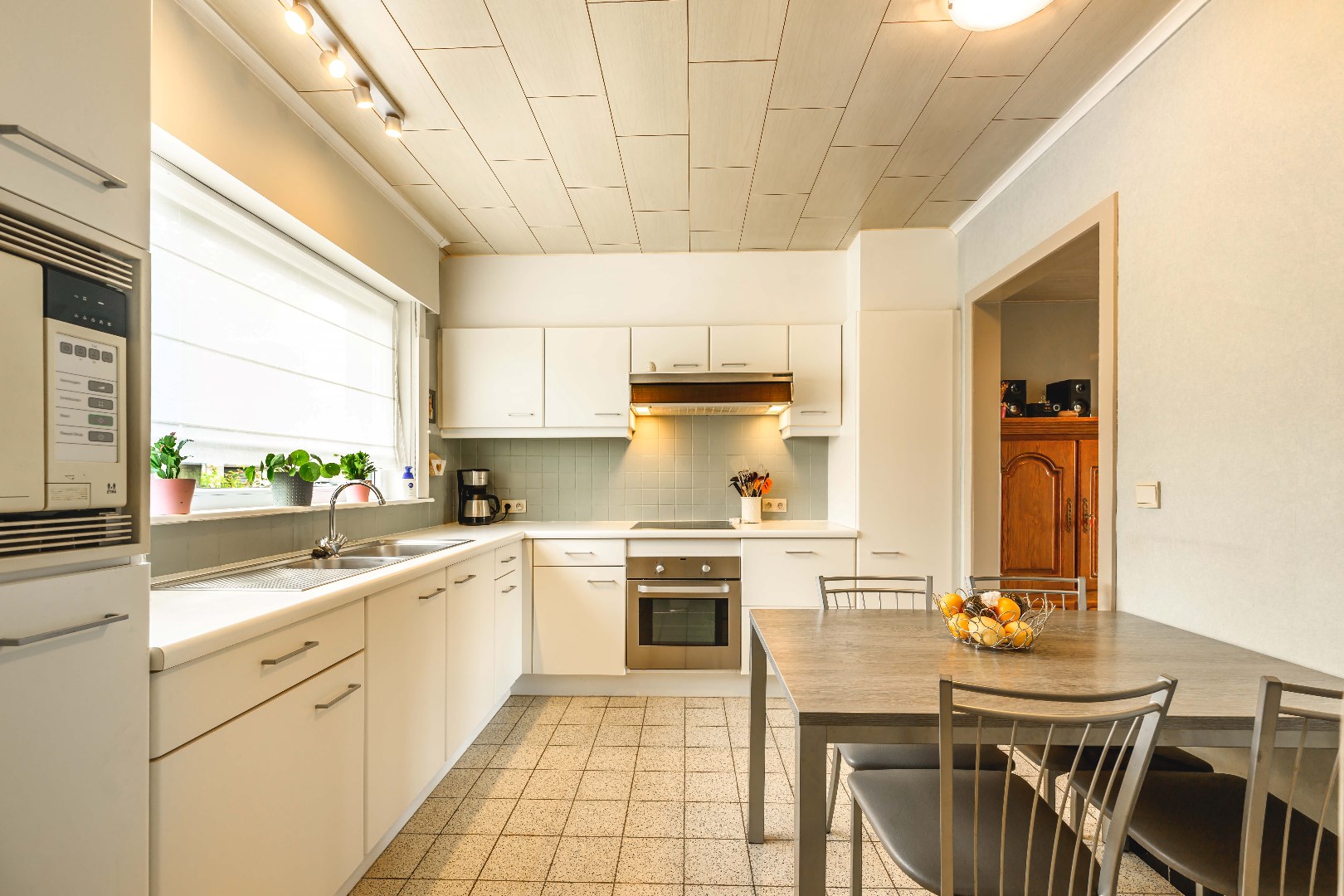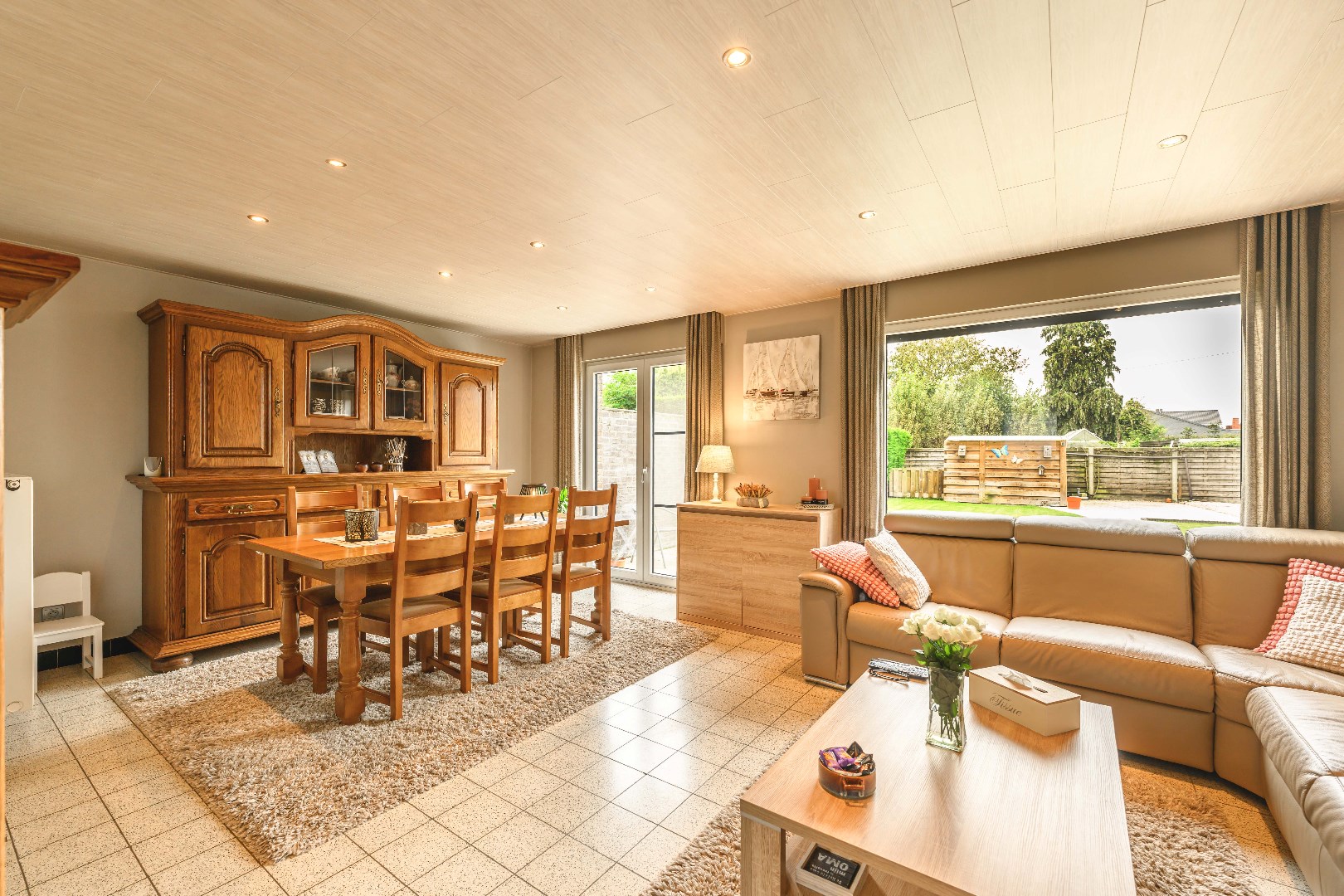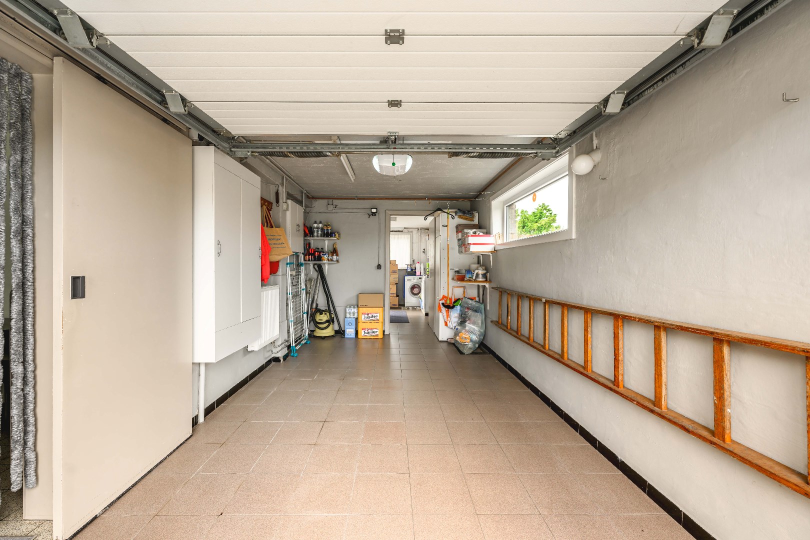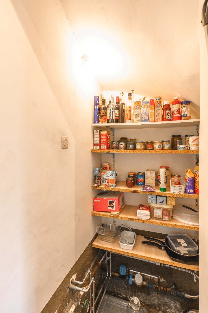 U komt binnen via de inkomhal met apart gastentoilet. Vervolgens is er onder de trap een praktische berging. Verder komt U terecht in de lichtrijke leefruimte met zit- en eethoek en uitgerust met een gezellige houtkachel en directe toegang tot de tuin. Aansluitend is er de ingerichte keuken (kookplaat | dampkap | oven | microgolf | frigo | dubbele spoelbak). Van hieruit is er toegang tot de garage en wasplaats met aansluiting voor wasmachine en droogkast.
