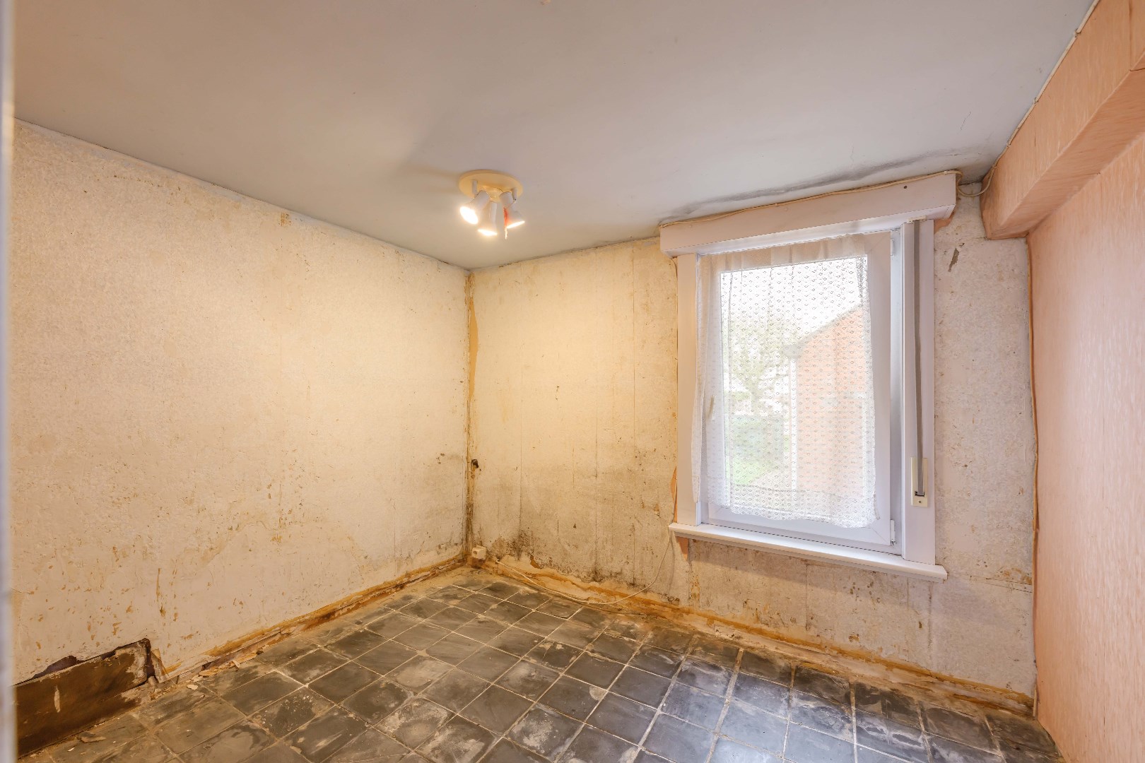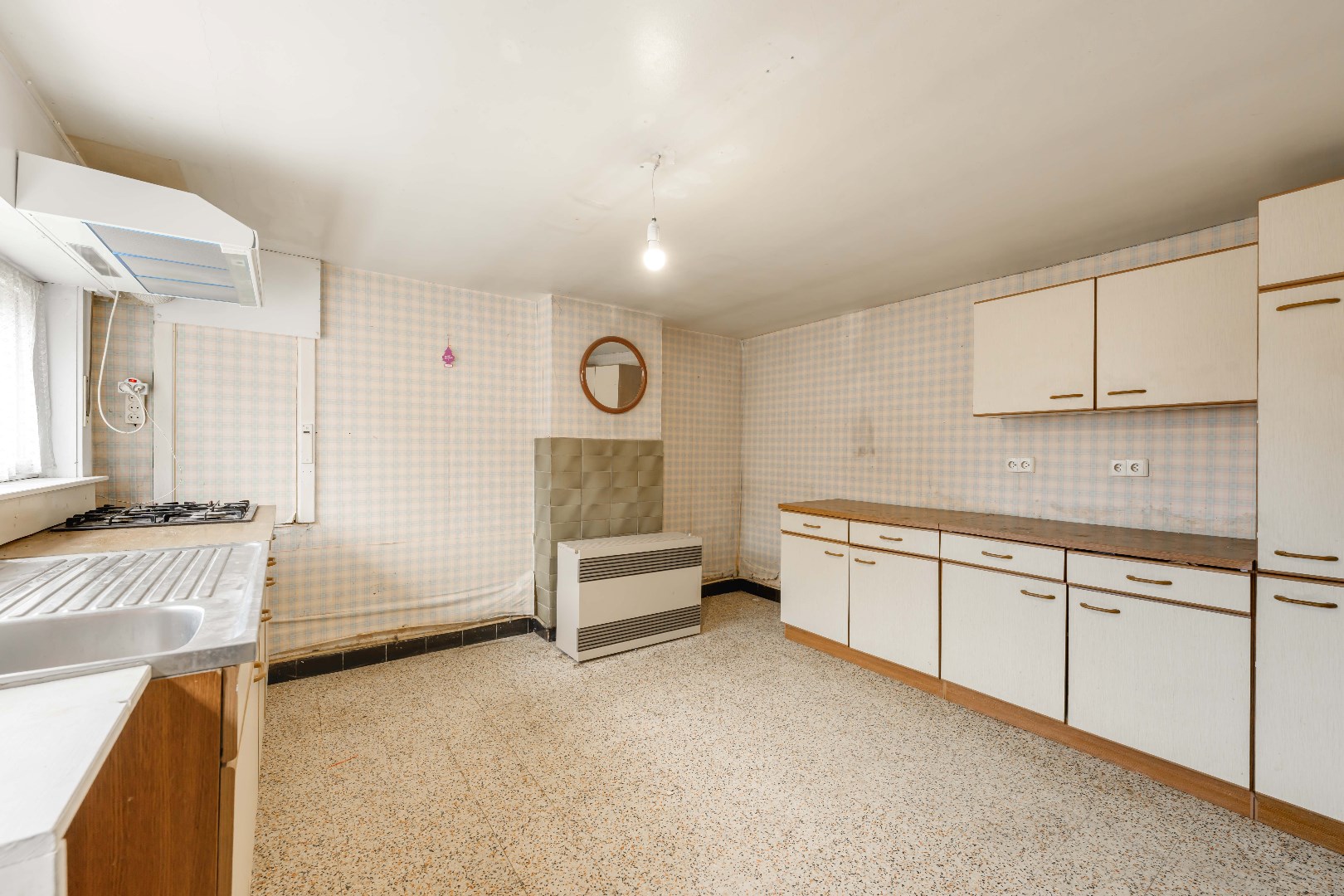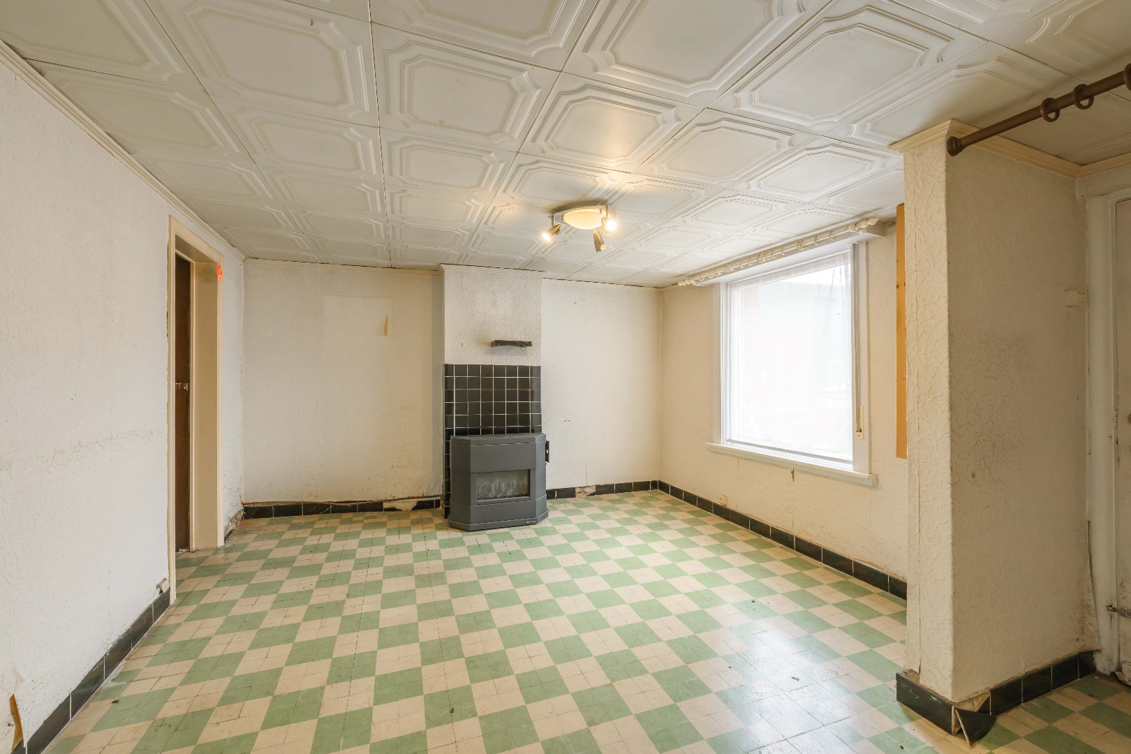 U komt binnen en bevindt zich in de leefruimte met gaskachel, links is er een eetkamer. Vanuit de leefruimte is er toegang tot de keuken (gasfornuis | dampkap | spoelbak) . Verder beschikt U nog over een slaapkamer/in te richten badkamer op het gelijkvloers.