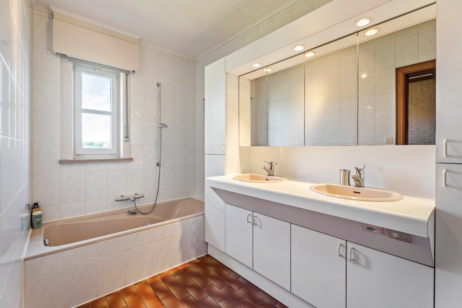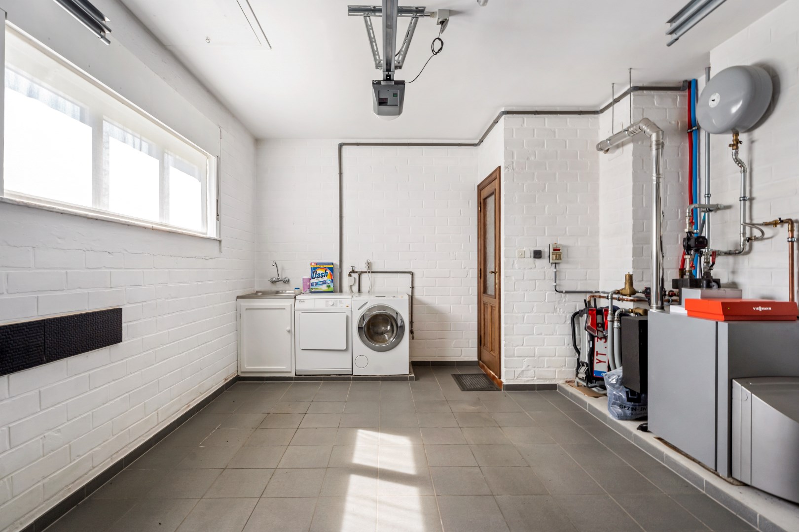 Verder op het gelijkvloers zijn er nog 2 ruime slaapkamer van 15 m² en 11 m², alsook een ingerichte badkamer (ligbad met douchemogelijkheden en een dubbele lavabo met meubel). Tevens beschikt U over een inpandige garage (geautomatiseerde poort) met ruimte voor wasmachine en droogkast alsook een uitgietbak. Op de verdieping bevinden zich nogmaals 2 zeer ruime slaapkamers.
