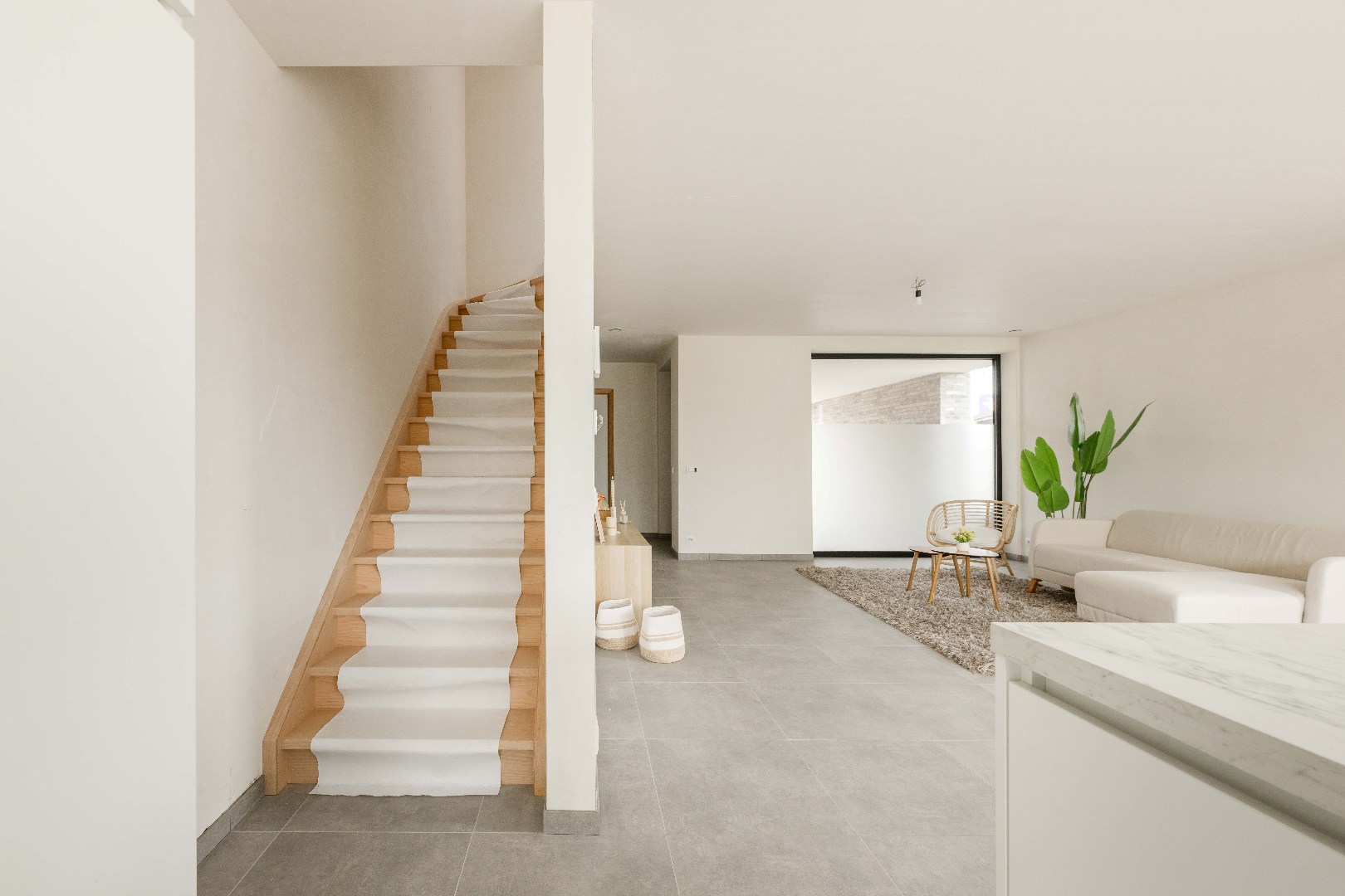 Eens de leefruimte binnengekomen (36 m²) met de grote raampartijen is er een lichtrijk, open en ruimtelijk gevoel. Aansluitend bevindt zich de open, volledig ingerichte keuken (10 m²). Deze is volledig uitgerust met inductiekookplaat, dampkap, combi-oven, koelkast met vriesvak en spoelbak.