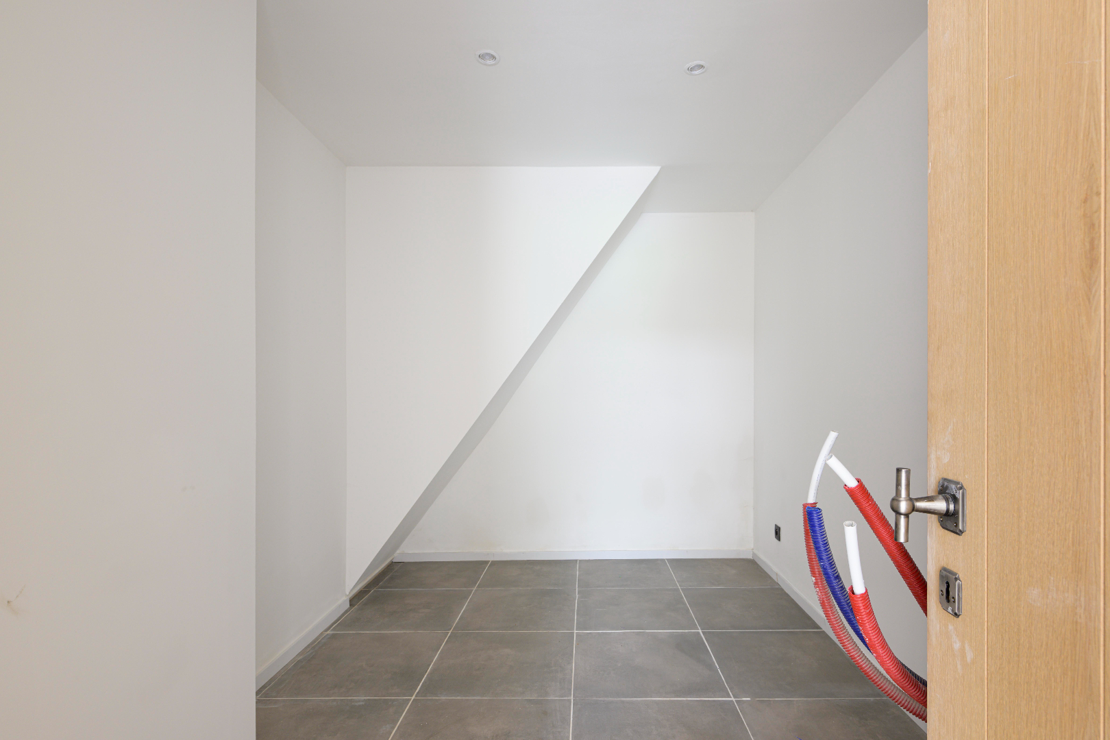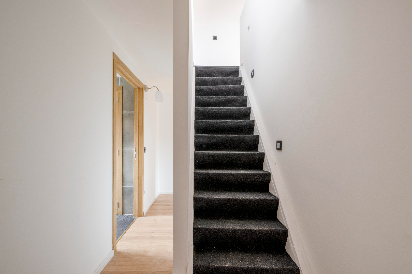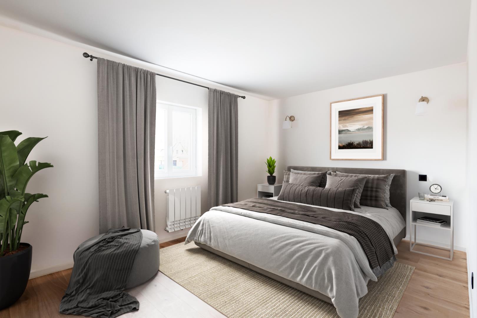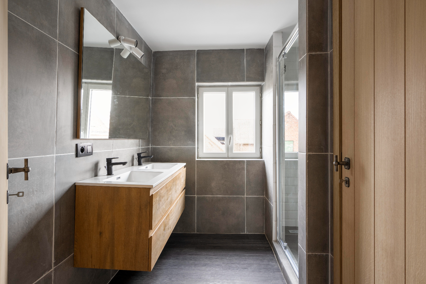 Het eerste verdiep omvat 2 slaapkamers (7 m² | 13,50 m²) en de badkamer (inloopdouche | dubbele lavabo met meubel | en apart toilet).