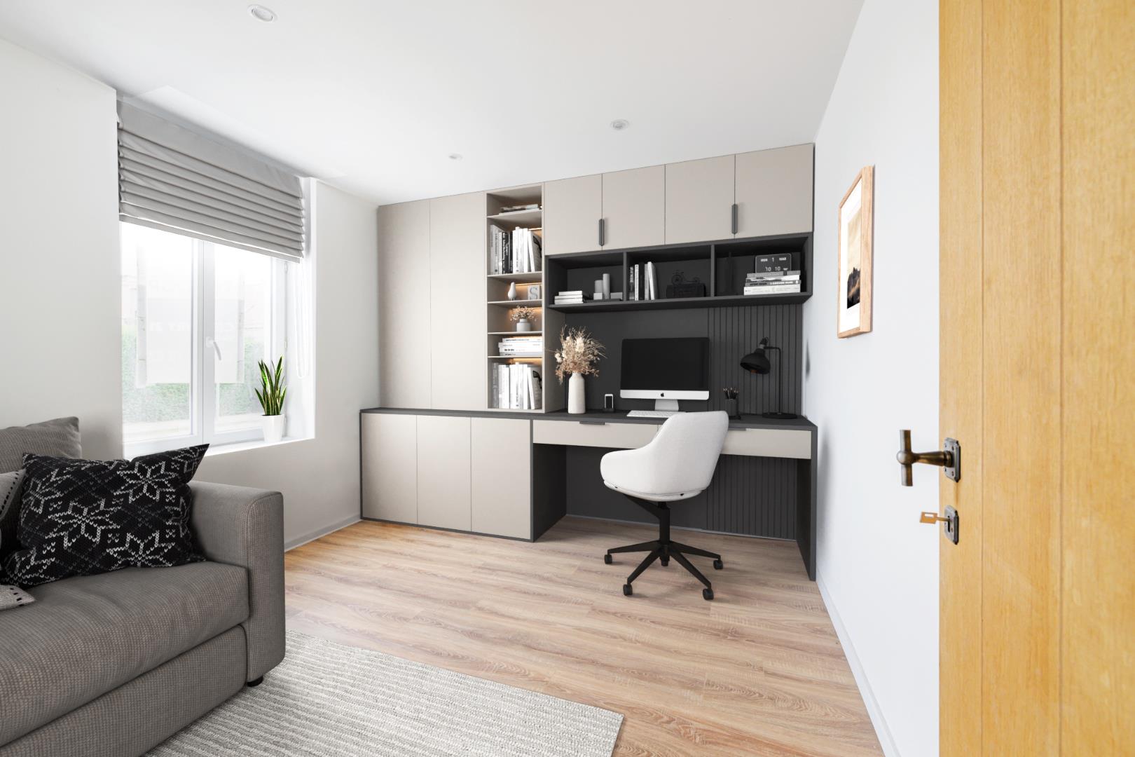U komt binnen via de inkomhal met op de linker kant de eerste slaapkamer/bureauruimte (11 m²) vervolgens is het gastentoilet. Op het einde van de hall is er de ruime en lichtrijke leefruimte met open keuken 45,50 m² (kookplaat | dampkap | dubbele spoelbak | frigo | oven) hier is directe toegang tot de ruime tuin. Verder is er een praktische berging/wasplaats voorzien (8 m²).