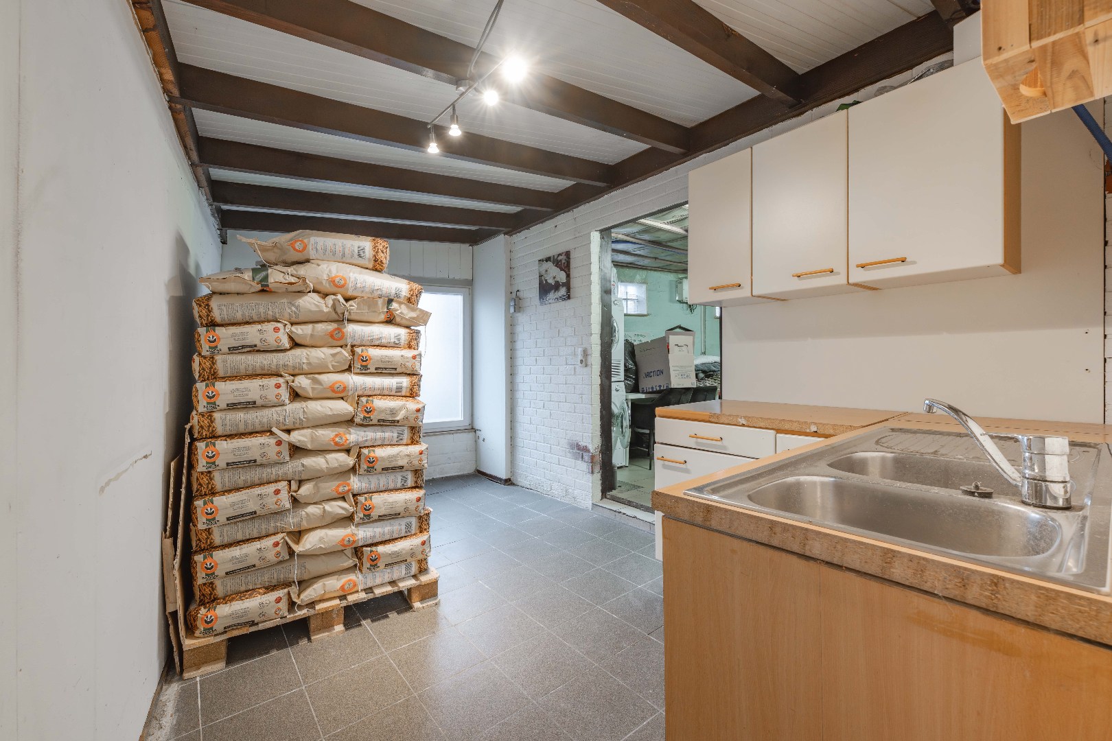 Aansluitend is er de vernieuwde keuken (kookplaat | dampkap | dubbele spoelbak | frigo | vaatwasser | oven).
