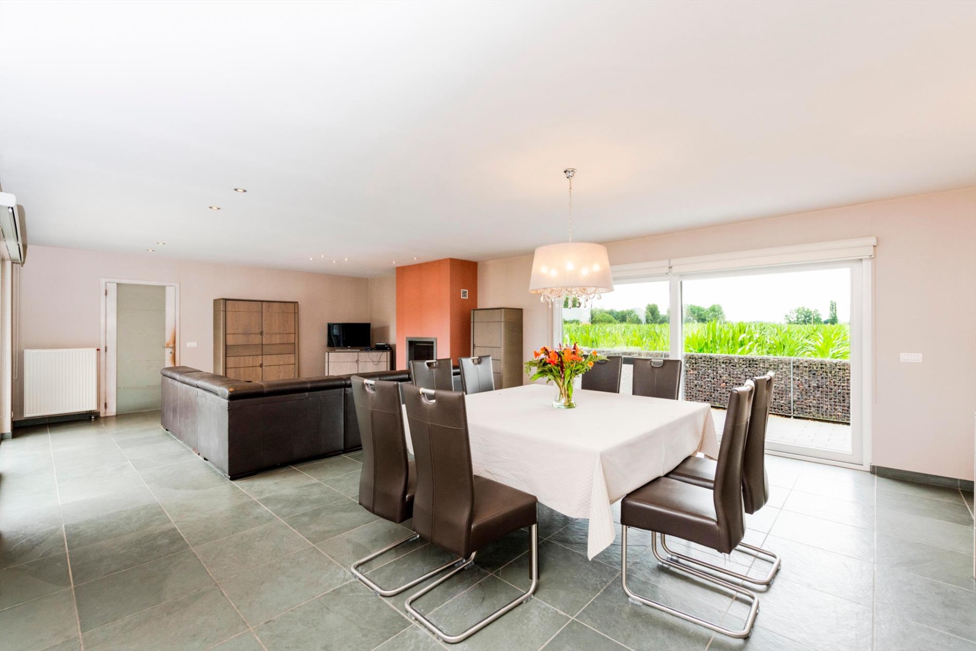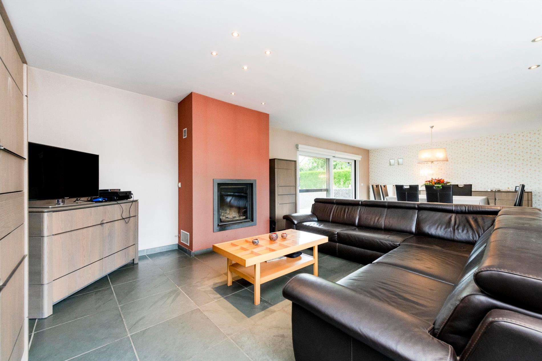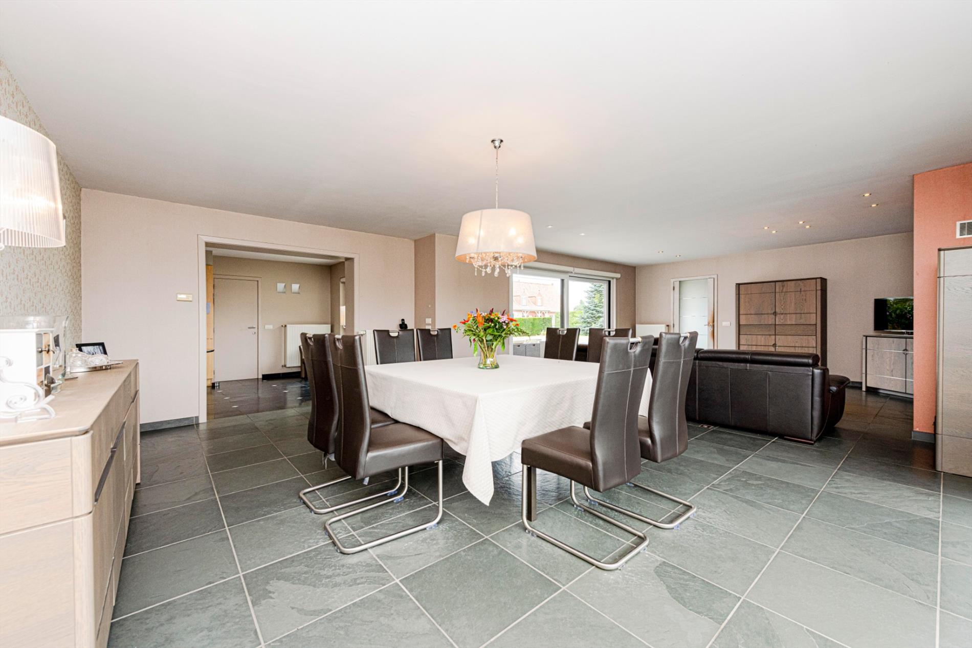 U komt de eigendom binnen via de ruime inkomhall met gastentoilet. Links heb U directe toegang tot de ruime dubbele garage met automatische geïsoleerde poorten (34 m²). Rechts komt U de imposante leefruimte binnen van 57 m² met een gezellige houtcassette. Aansluitend beschikt U over de volledig ingerichte keuken (kookplaat gas | dampkap | frigo | oven | microgolf | vaatwasser) en dit op 21 m² met aansluitend een wasplaats/berging (7,35 m²).