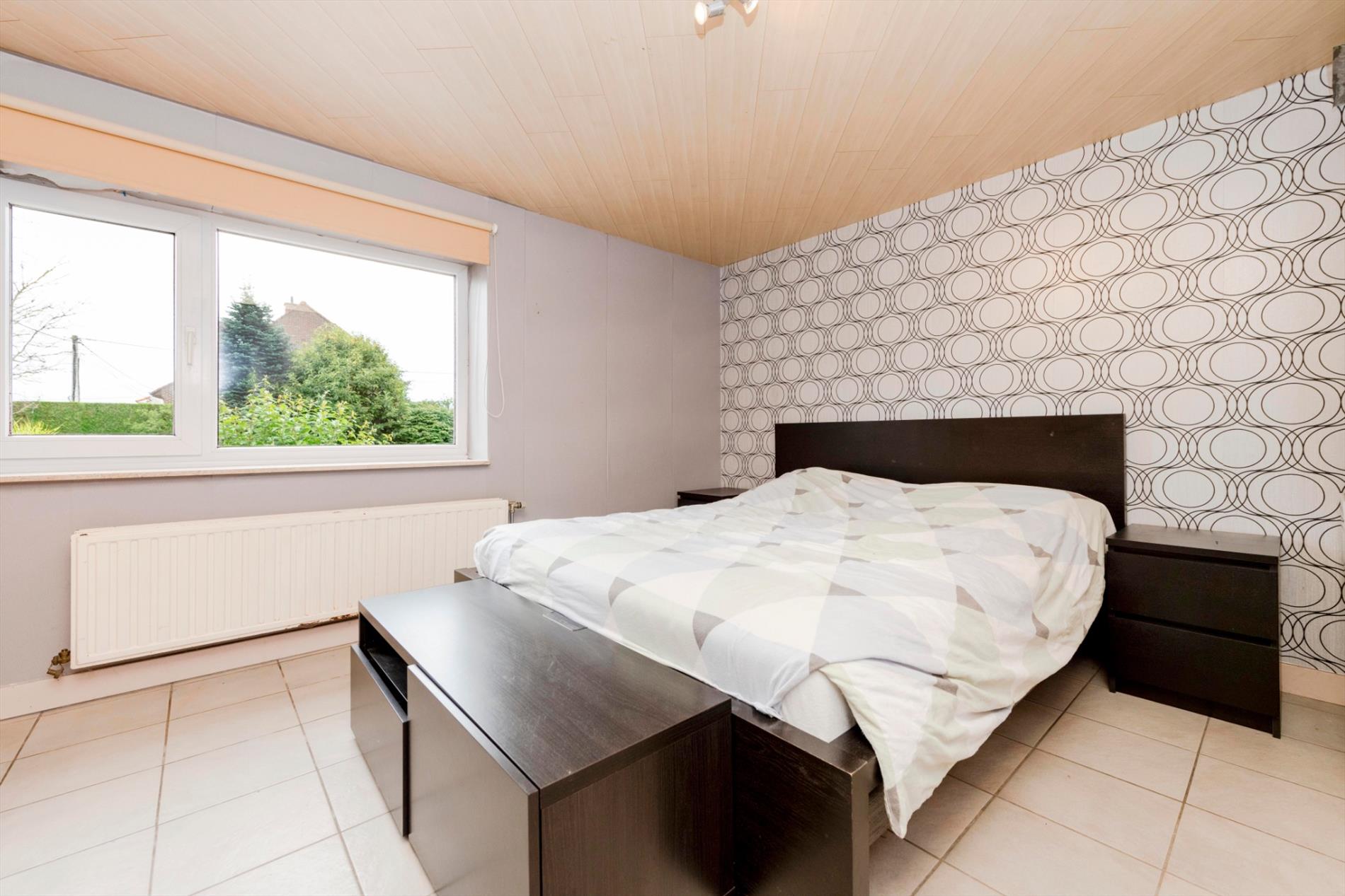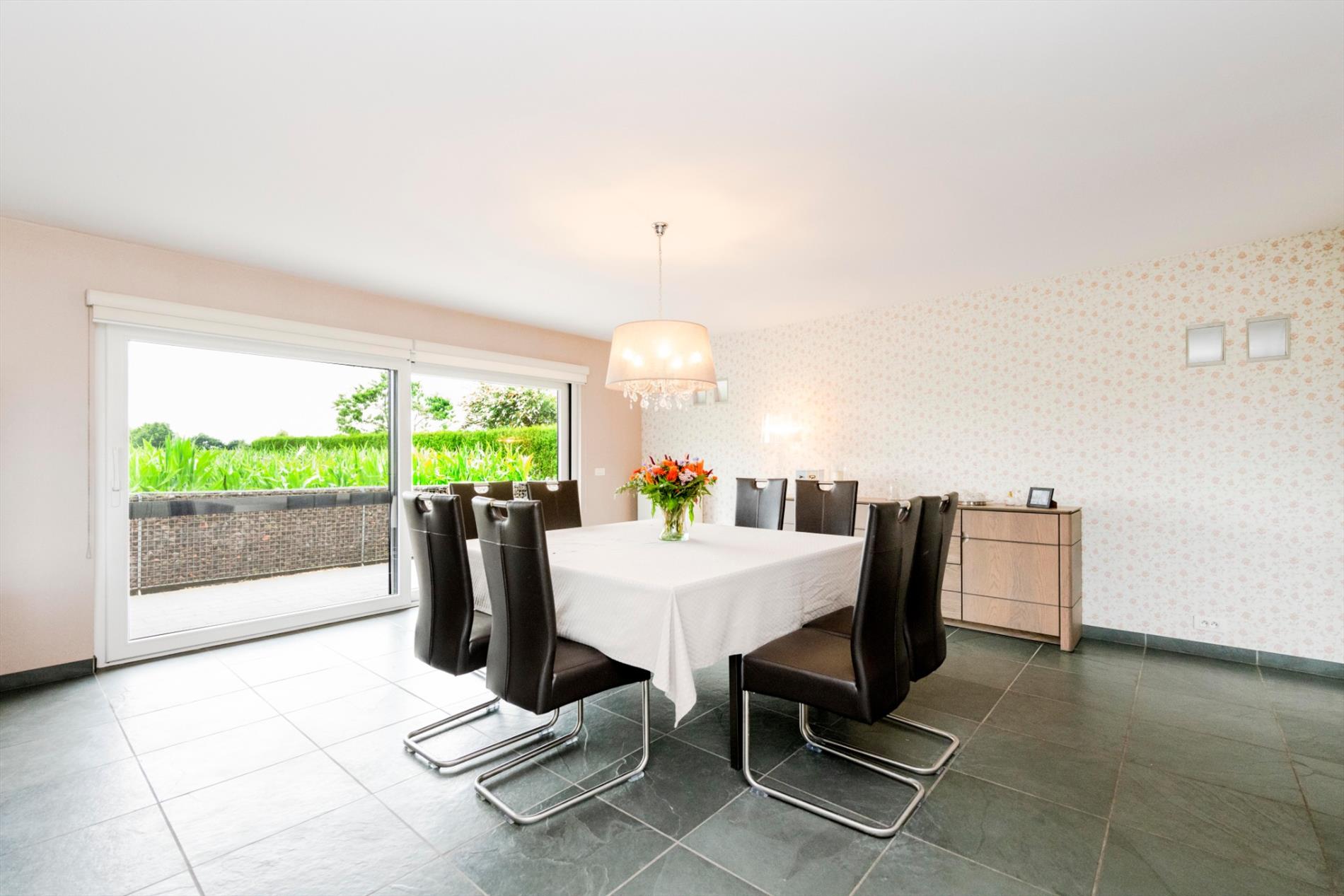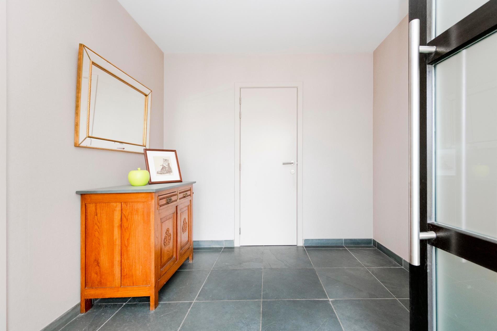 U komt de eigendom binnen via de ruime inkomhall met gastentoilet. Links heb U directe toegang tot de ruime dubbele garage met automatische geïsoleerde poorten (34 m²). Rechts komt U de imposante leefruimte binnen van 57 m² met een gezellige houtcassette. Aansluitend beschikt U over de volledig ingerichte keuken (kookplaat gas | dampkap | frigo | oven | microgolf | vaatwasser) en dit op 21 m² met aansluitend een wasplaats/berging (7,35 m²).