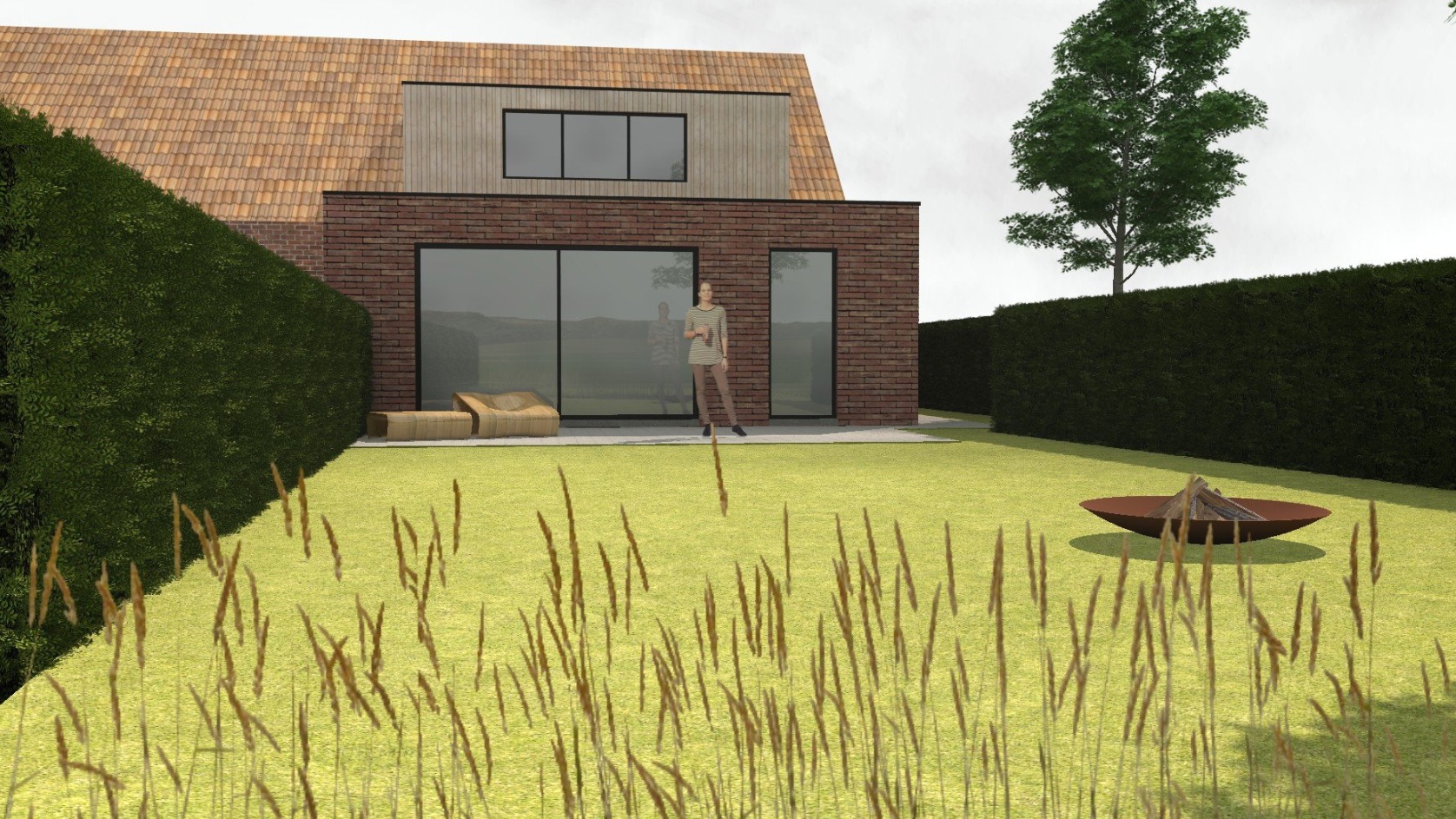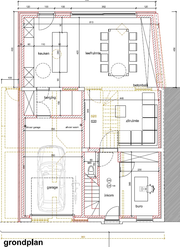 Inkom met gastentoilet, bueauruimte (9 m²), ruime lichtrijke L-vormige leefruimte met keuken (50 m²), berging en garage.