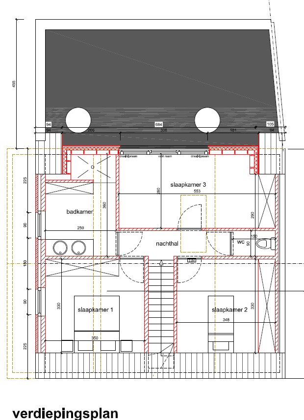 Het verdiep omvat een nachthall met apart toilet, drie slaapkamers (14,50 m² | 11,50 m² | 11,50 m²) alsook badkamer met dubbele lavabo en inloopdouche.