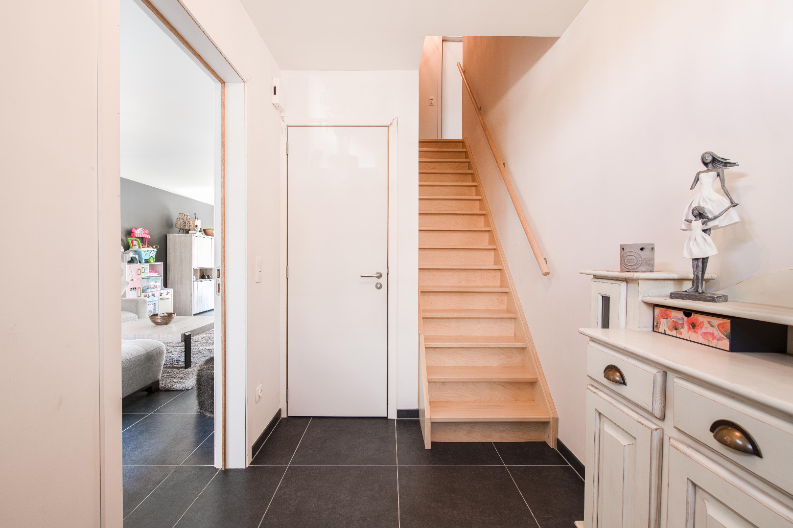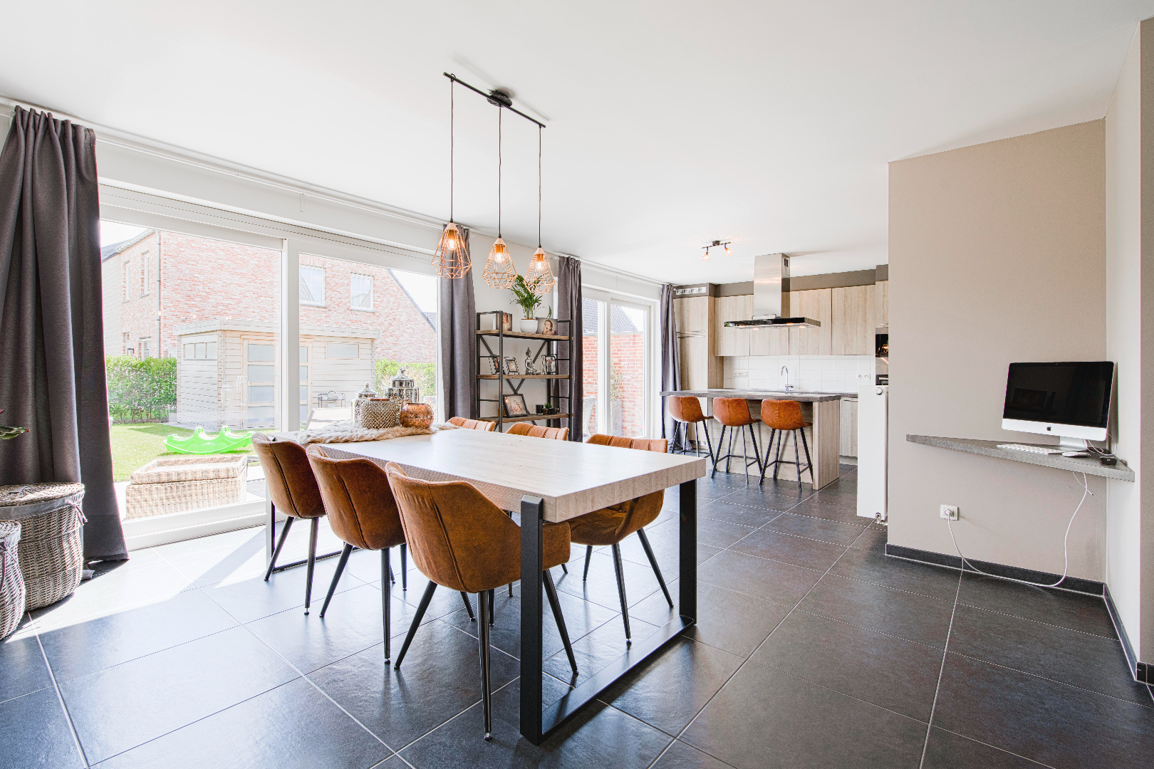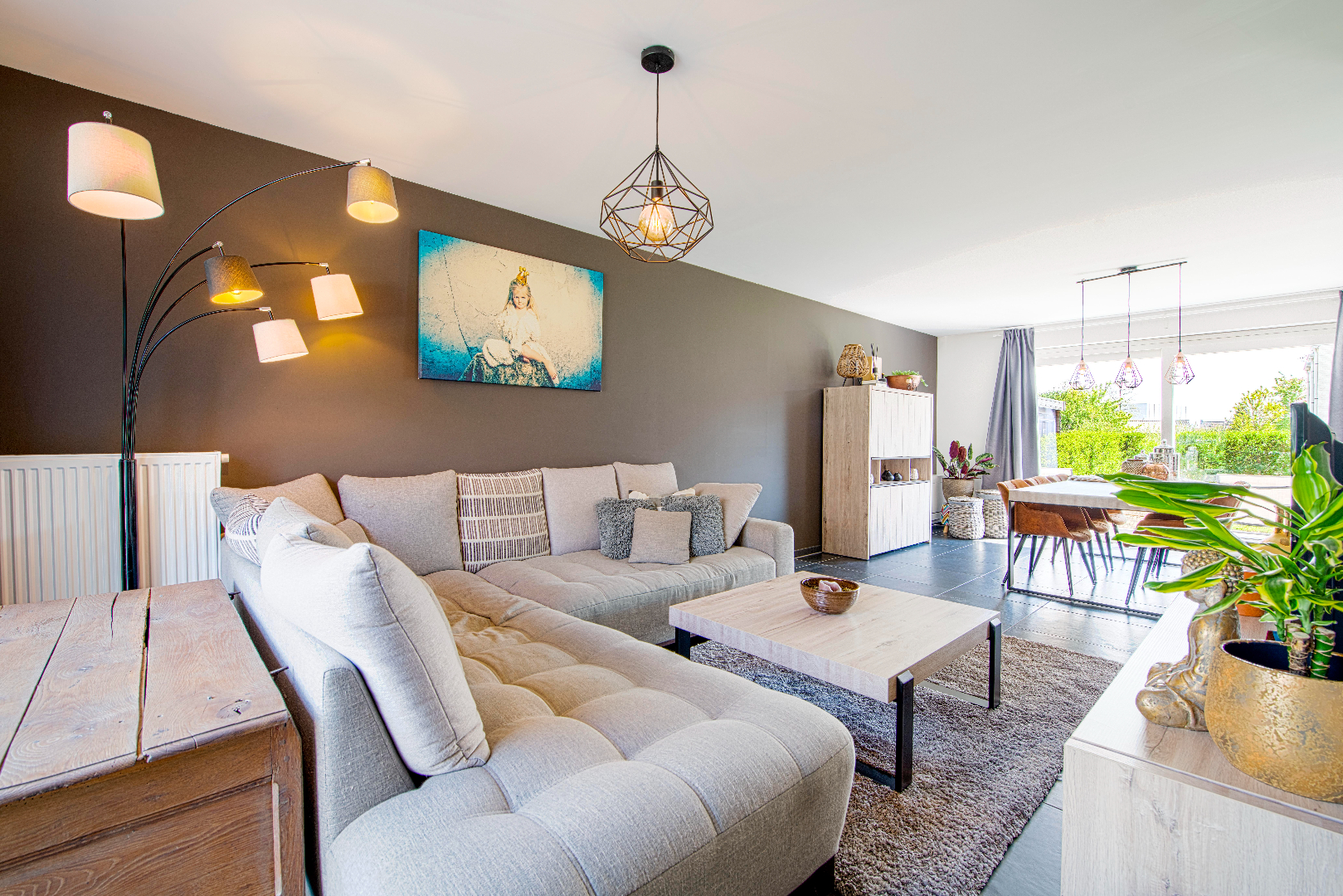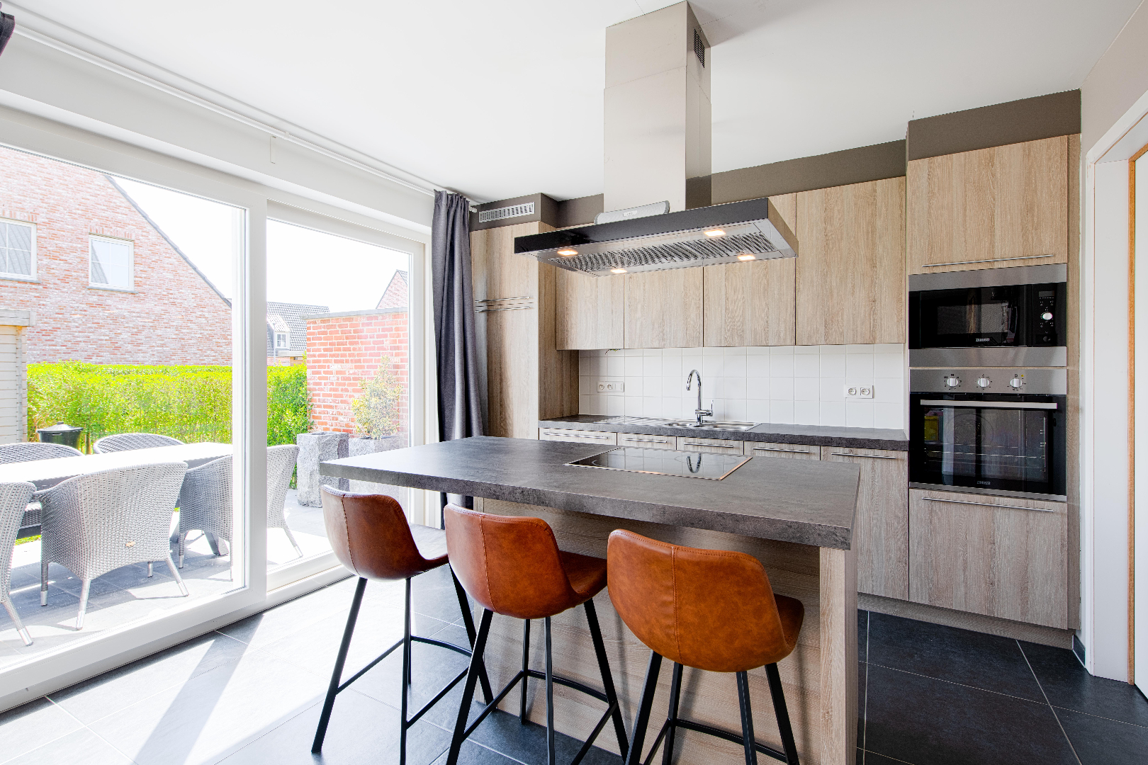 U komt de woning binnen via de inkomhal met gastentoilet. Aansluitend is er de lichtrijke en ruime leefruimte (39 m²) met aansluitend toegang tot de open keuken met kookeiland volledig ingericht met toestellen (kookplaat | dampkap | oven | microgolf | dubbele spoelbak | frigo | vaatwasser). Door de enorme glaspartijen geniet U van veel lichtinval en is er tevens directe toegang tot de aangelegde tuin.