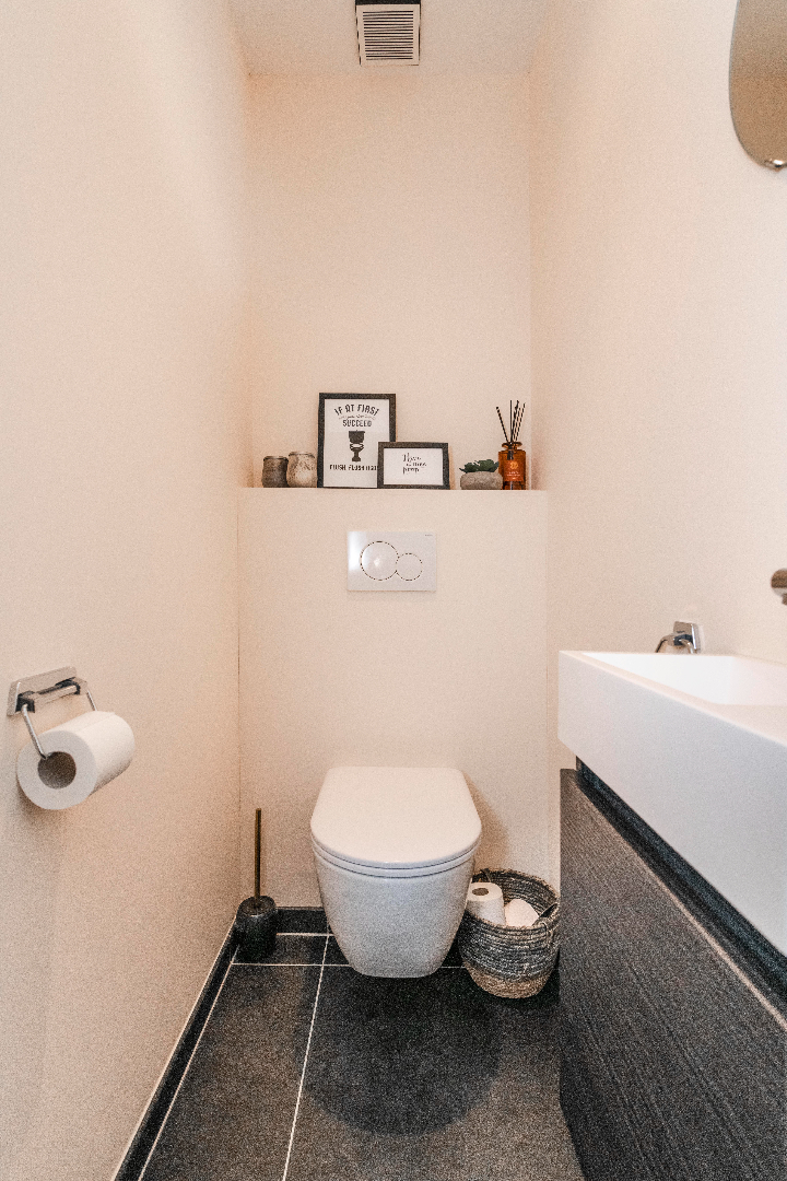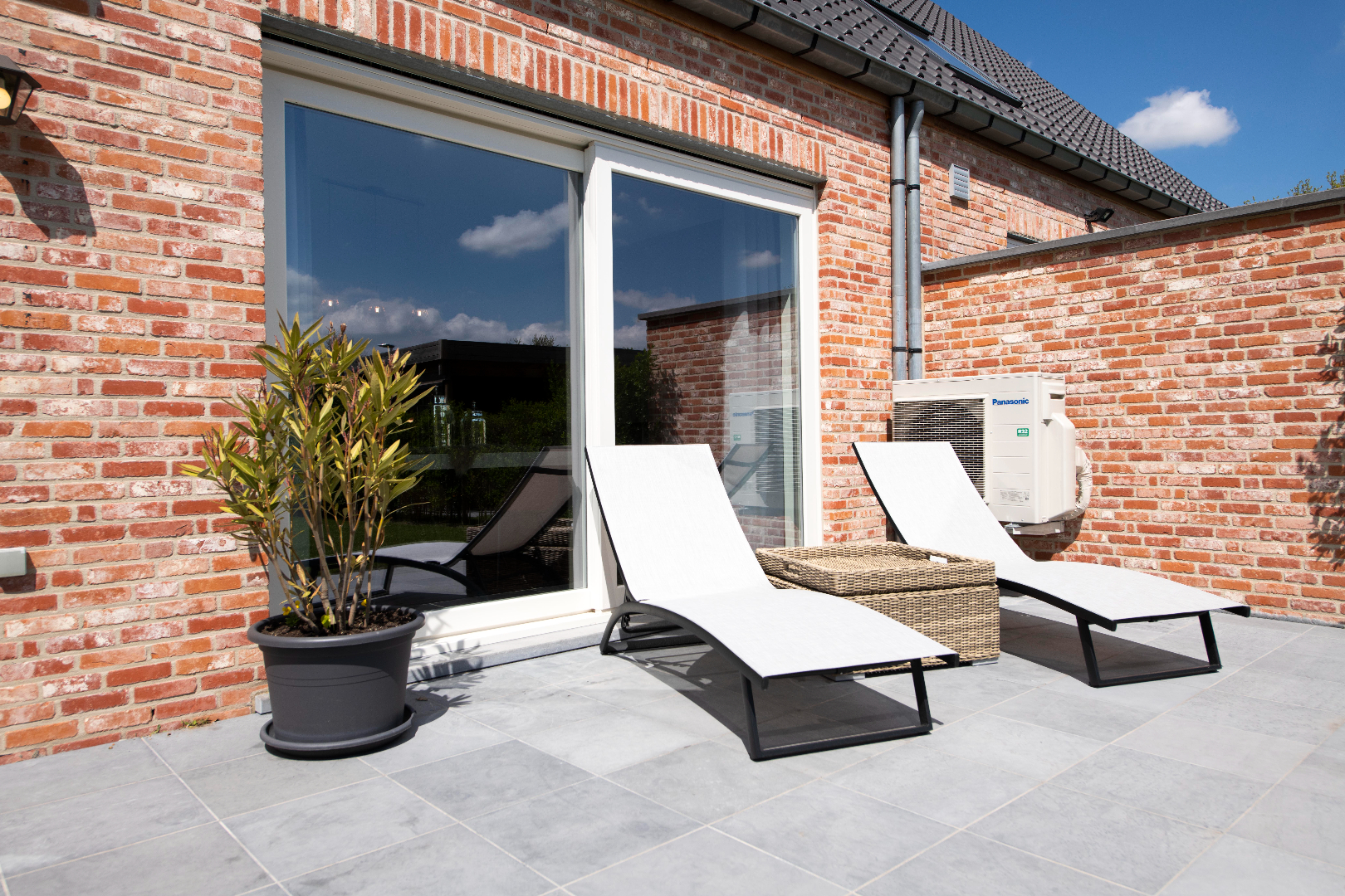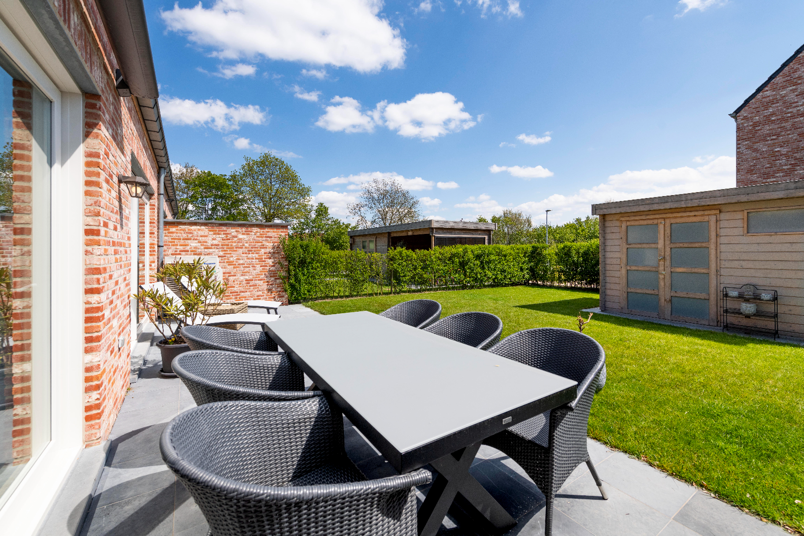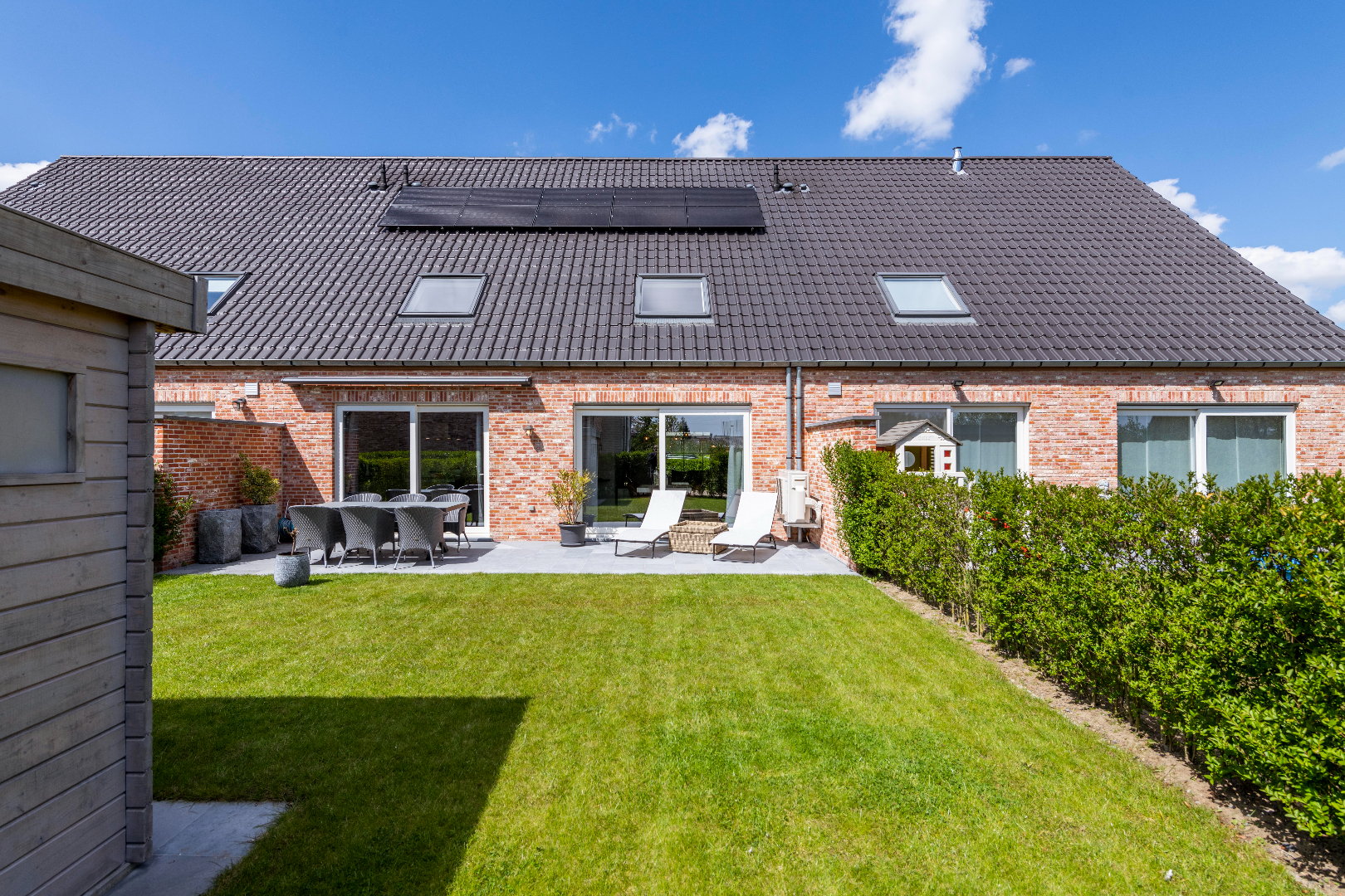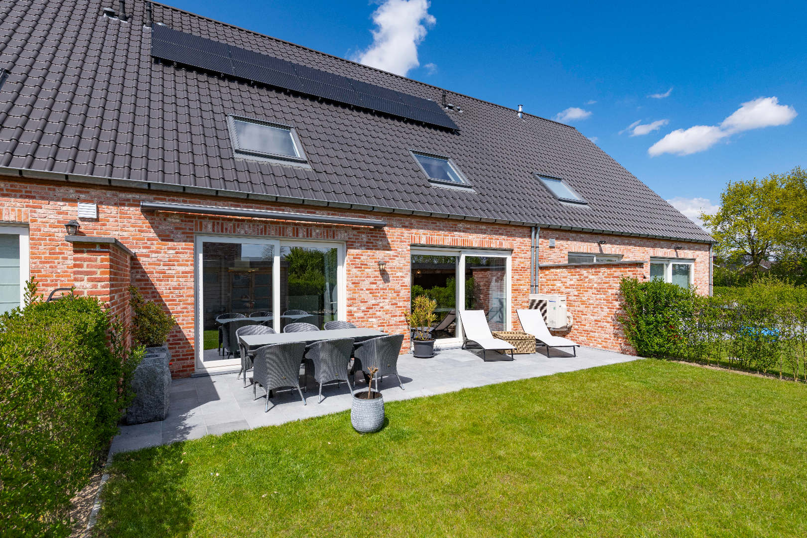 U komt de woning binnen via de inkomhal met gastentoilet. Aansluitend is er de lichtrijke en ruime leefruimte (39 m²) met aansluitend toegang tot de open keuken met kookeiland volledig ingericht met toestellen (kookplaat | dampkap | oven | microgolf | dubbele spoelbak | frigo | vaatwasser). Door de enorme glaspartijen geniet U van veel lichtinval en is er tevens directe toegang tot de aangelegde tuin.