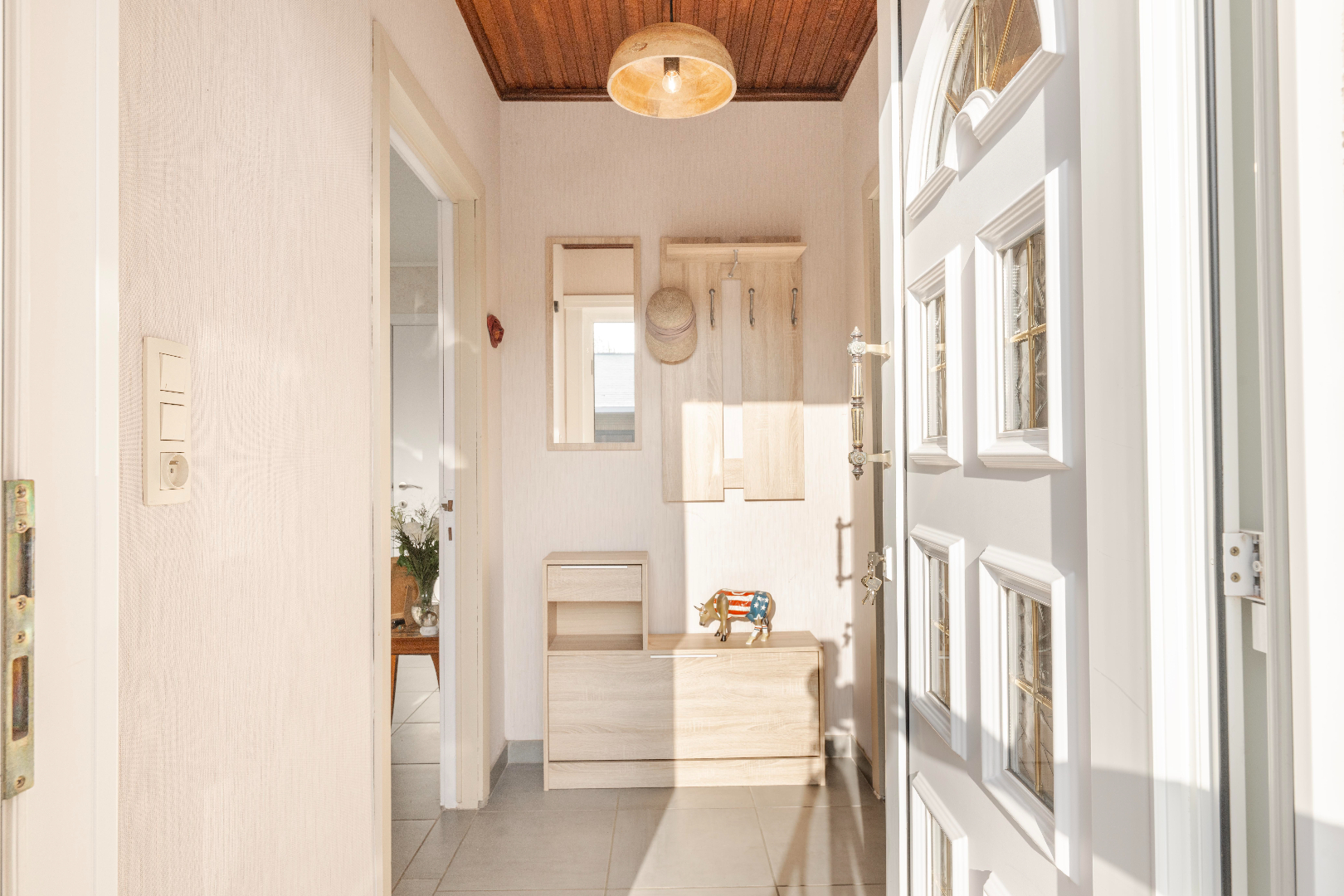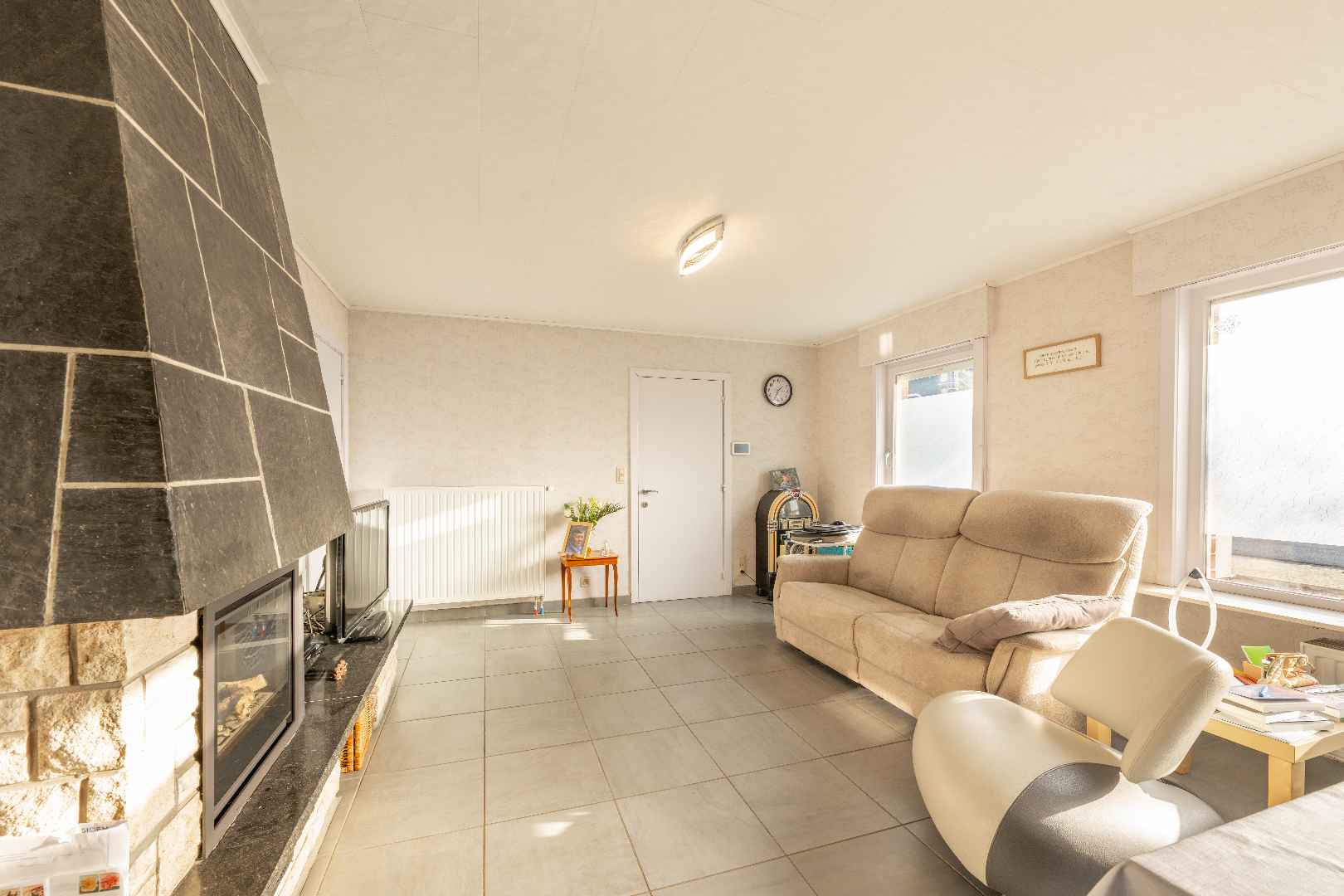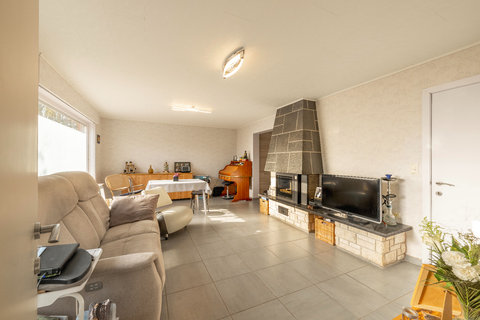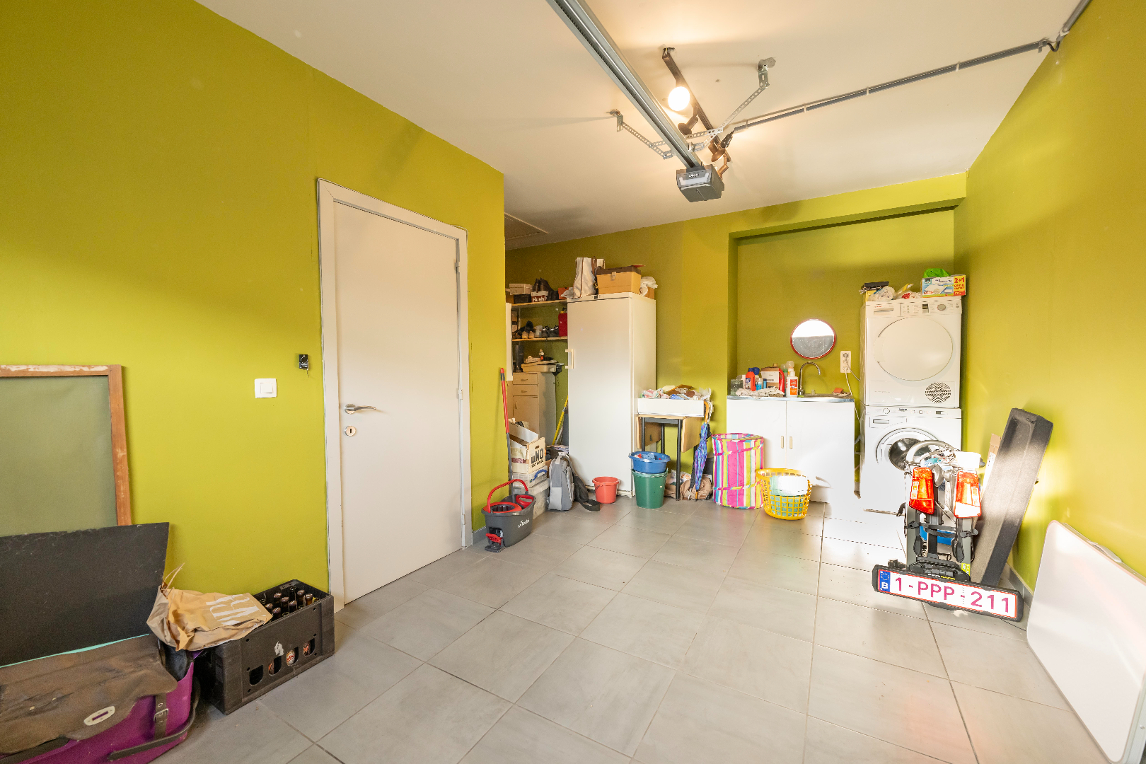 U komt binnen via de inkom met directe toegang rechts naar de inpandige garage (voorzien van een geautomatiseerde poort). Links van de inkom betreedt U de lichtrijke leefruimte met gezellige gashaard.