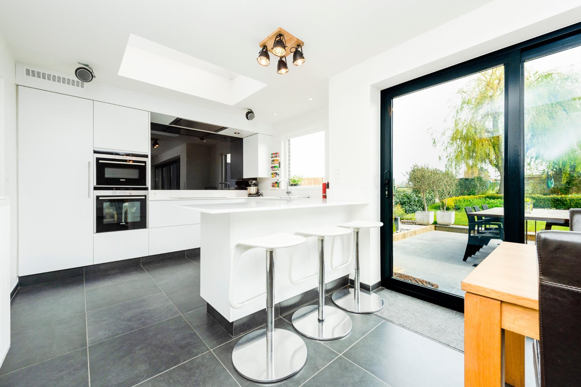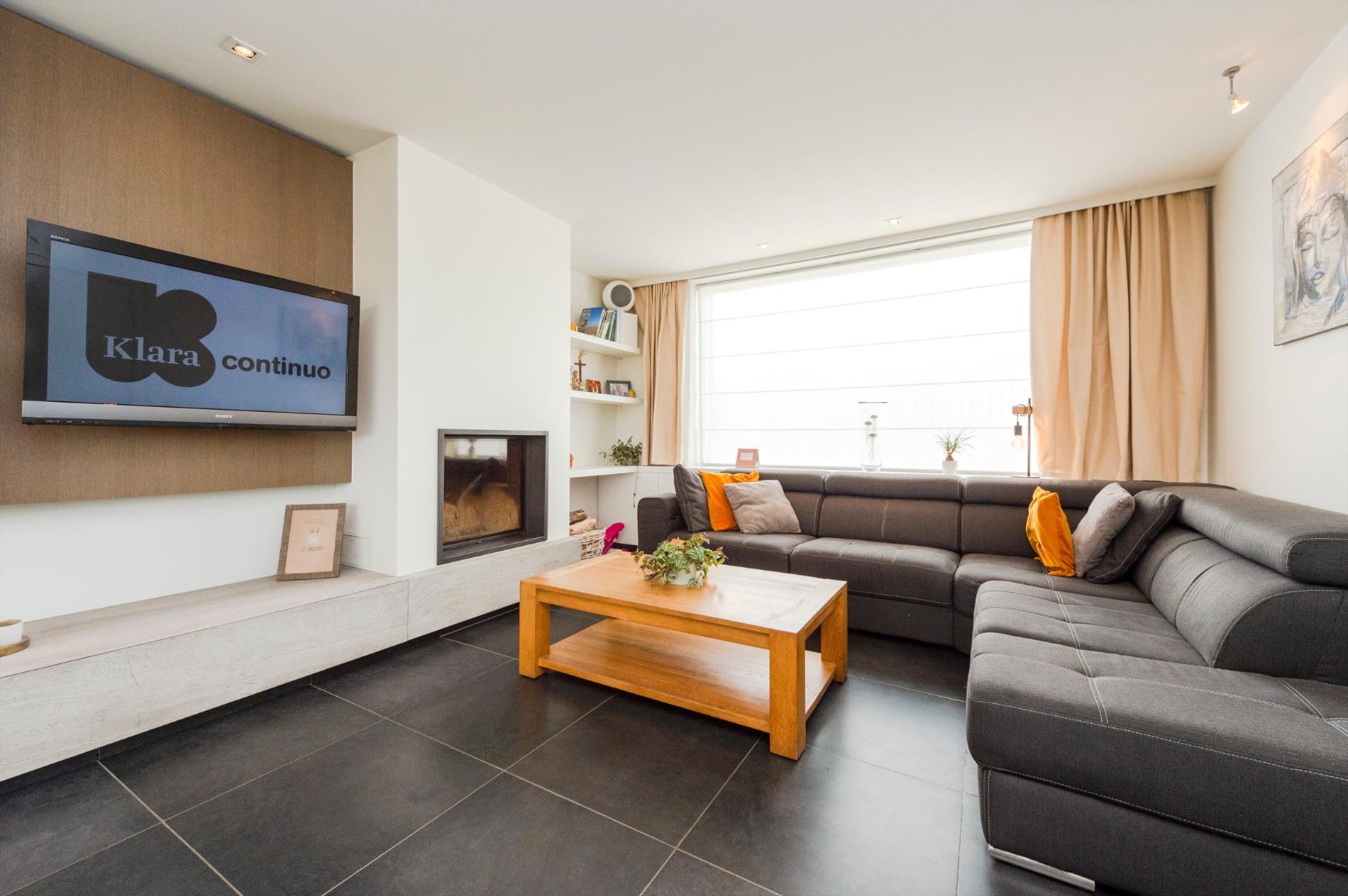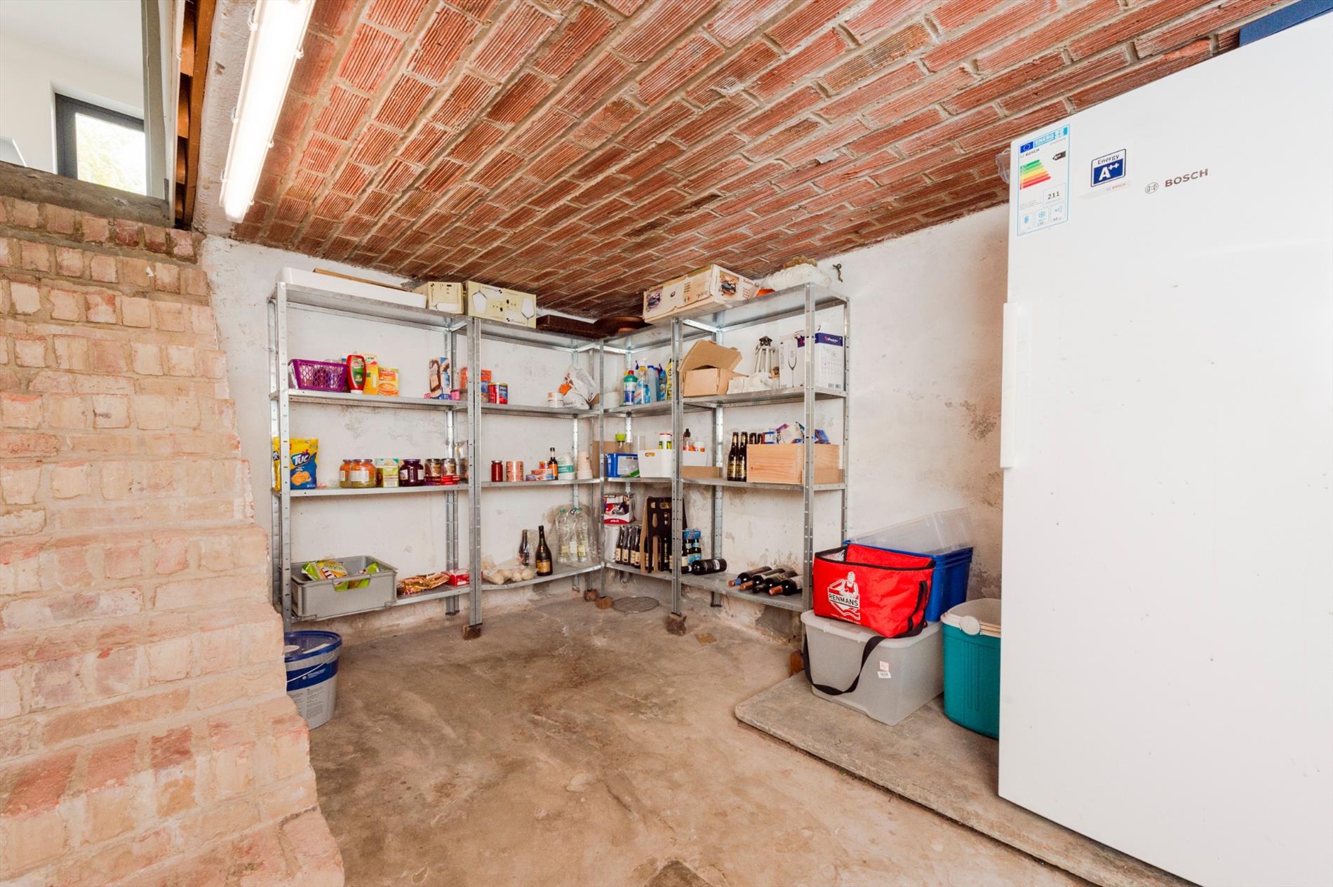 Gelijkvloers:Inkomhal met traphal en bezoekerstoilet met handenwasser. Rechts kom je in de ruime woonkamer (31,50 m²) met ingemaakte kastenwanden en de gezellige houtcassette met aansluitend de open ingerichte keuken (16,50 m²). De keuken is voorzien van een kookplaat, dampkap, oven, microgolf, vaatwasser en frigo. Door de grote raampartijen is er veel natuurlijk lichtinval en geniet U tevens van directe toegang tot het terras/de tuin. Aansluitend aan de keuken is er toegang tot de ruime droge kelder alsook de achterinkom/berging. Deze laatste is tevens voorzien van ingemaakte kasten. Tevens op het gelijkvloers is er een polyvalente ruimte (15,30 m²) die U naar believen kan bestemmen.