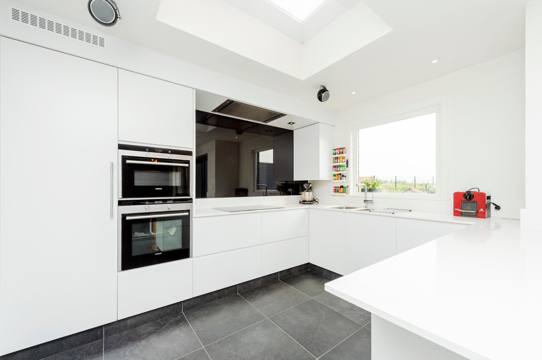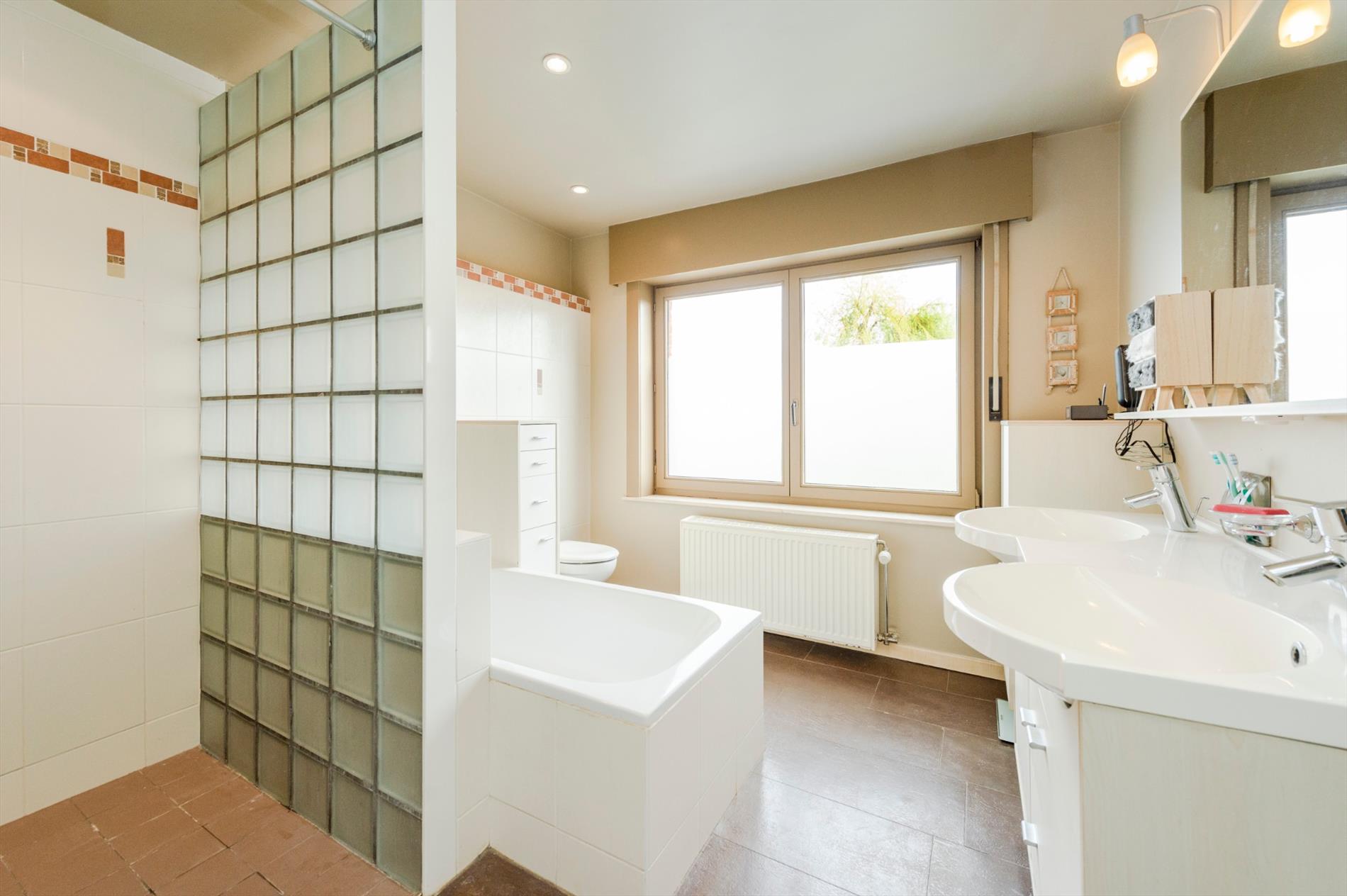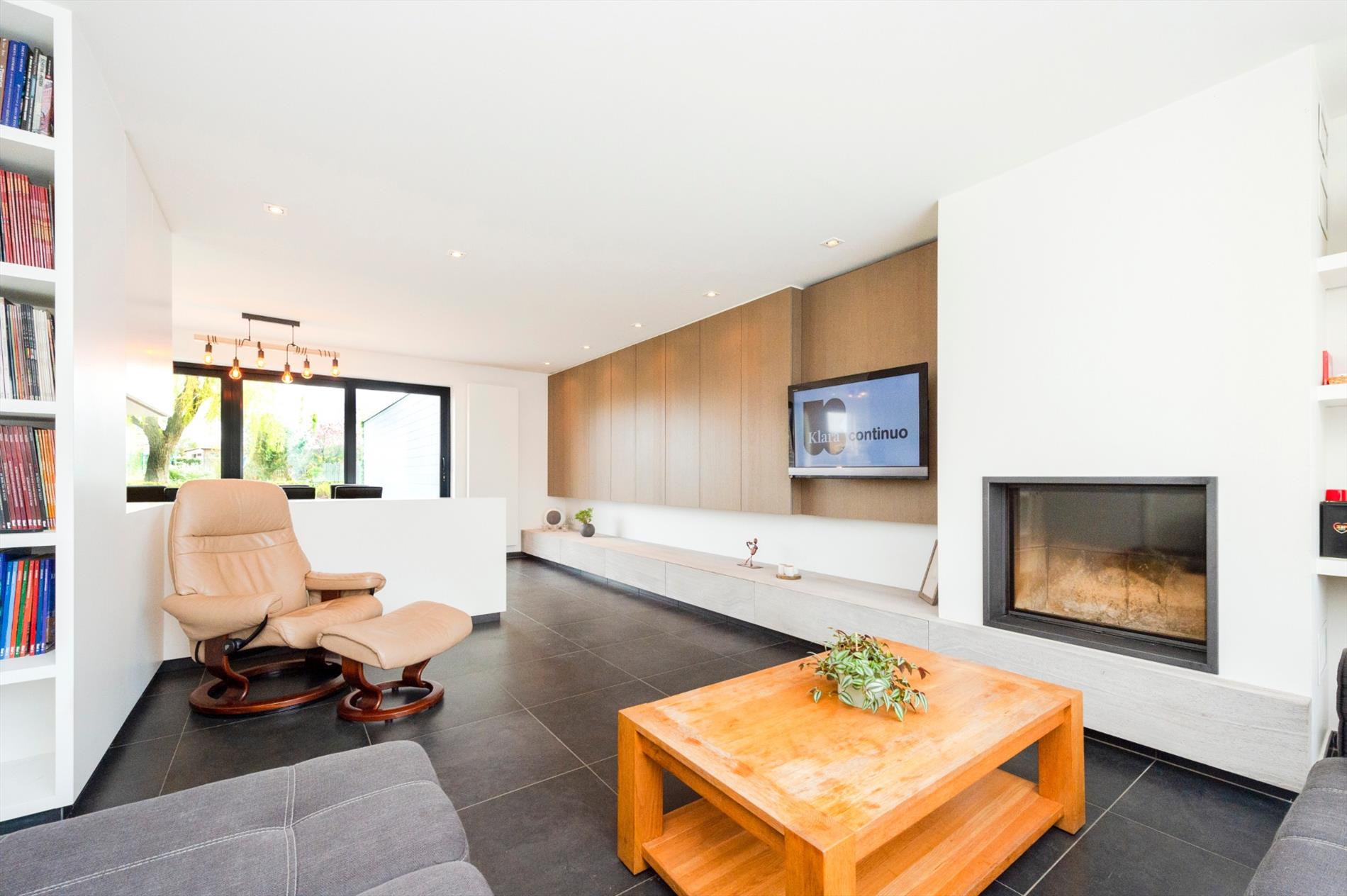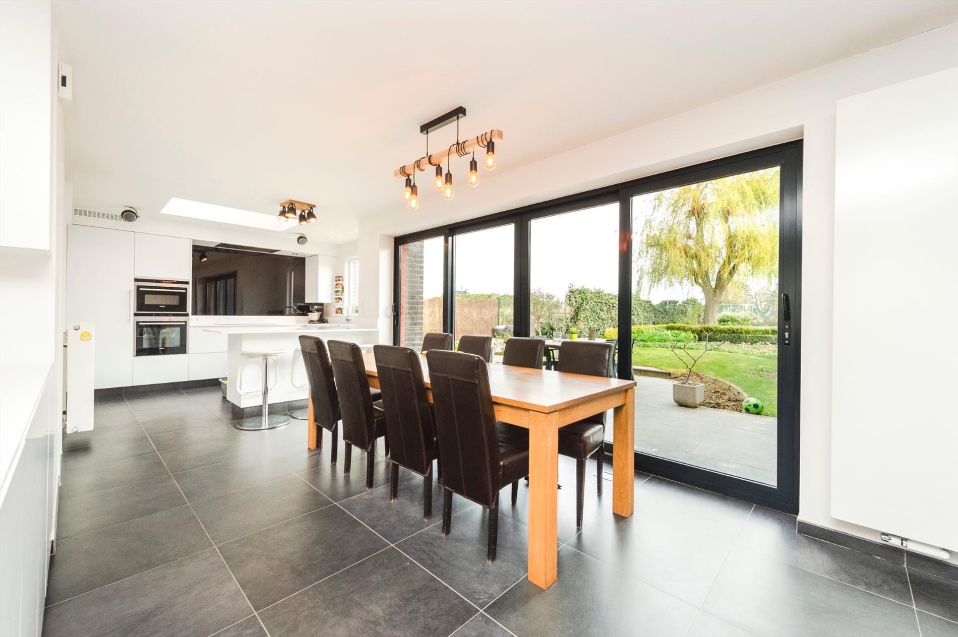 Gelijkvloers:Inkomhal met traphal en bezoekerstoilet met handenwasser. Rechts kom je in de ruime woonkamer (31,50 m²) met ingemaakte kastenwanden en de gezellige houtcassette met aansluitend de open ingerichte keuken (16,50 m²). De keuken is voorzien van een kookplaat, dampkap, oven, microgolf, vaatwasser en frigo. Door de grote raampartijen is er veel natuurlijk lichtinval en geniet U tevens van directe toegang tot het terras/de tuin. Aansluitend aan de keuken is er toegang tot de ruime droge kelder alsook de achterinkom/berging. Deze laatste is tevens voorzien van ingemaakte kasten. Tevens op het gelijkvloers is er een polyvalente ruimte (15,30 m²) die U naar believen kan bestemmen.