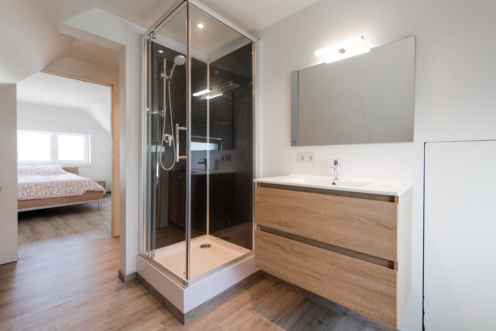 De tweede verdieping is bereikbaar vanuit de derde slaapkamer met een vaste trap. Deze ruimte is volledig vernieuwd (2020!!!) en omvat een ruime slaapkamer en een nieuwe badkamer (toilet | douche | lavabo).