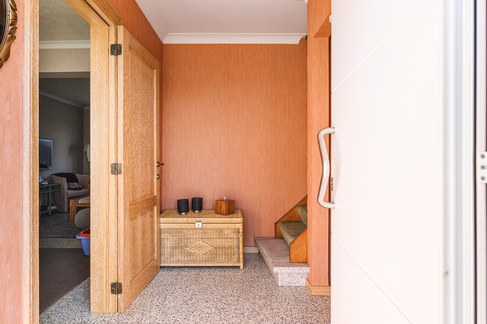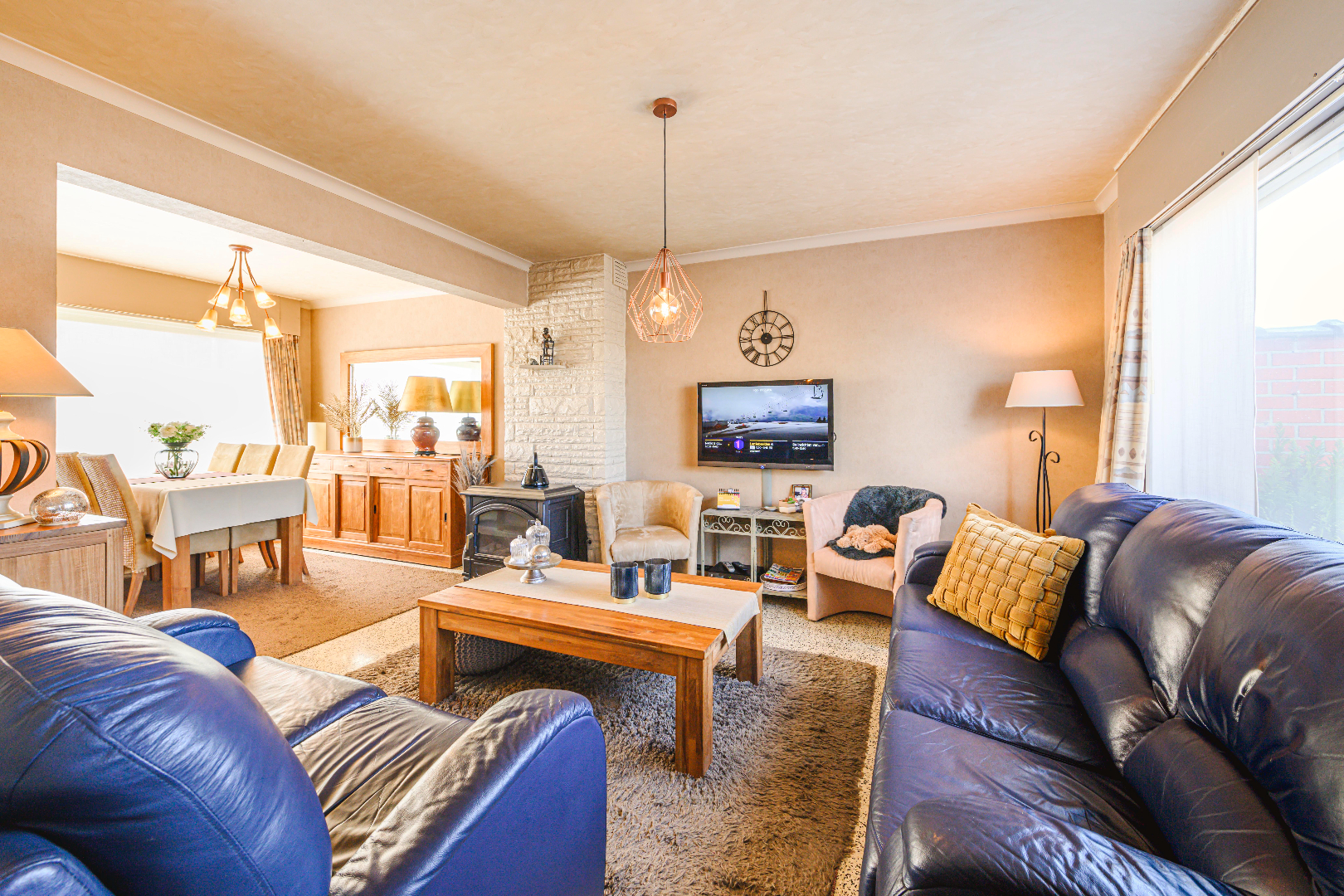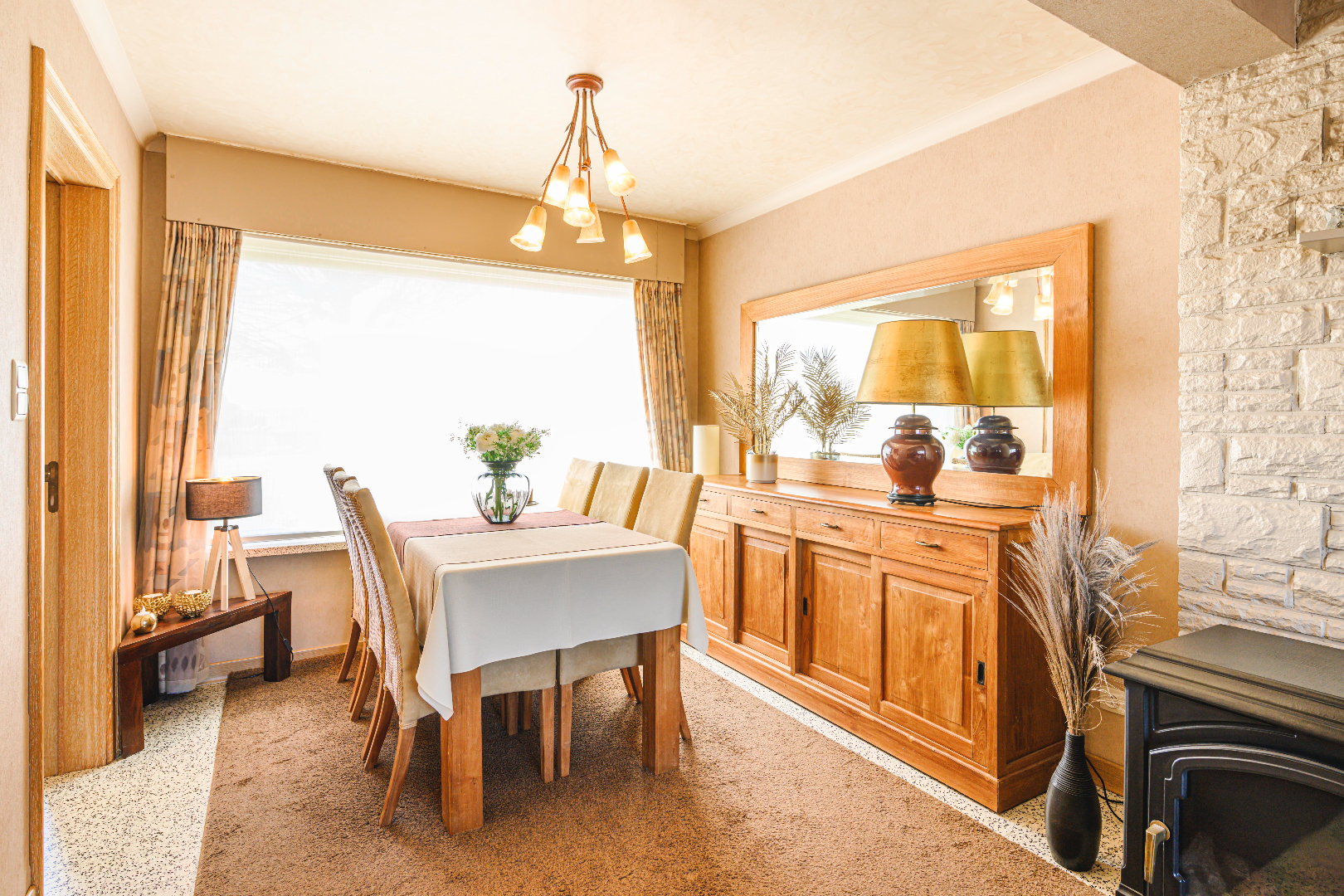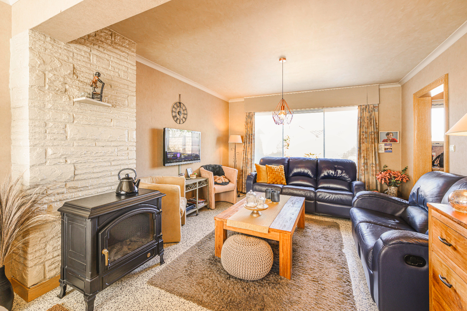 U komt de woning binnen via de inkomhal met gastentoilet en vestiaire. Verder komt U terecht in de leefruimte (25 m²) die voorzien is van veel lichtinval door de vele raampartijen. In deze ruimte is een gezellige gaskachel voorzien.