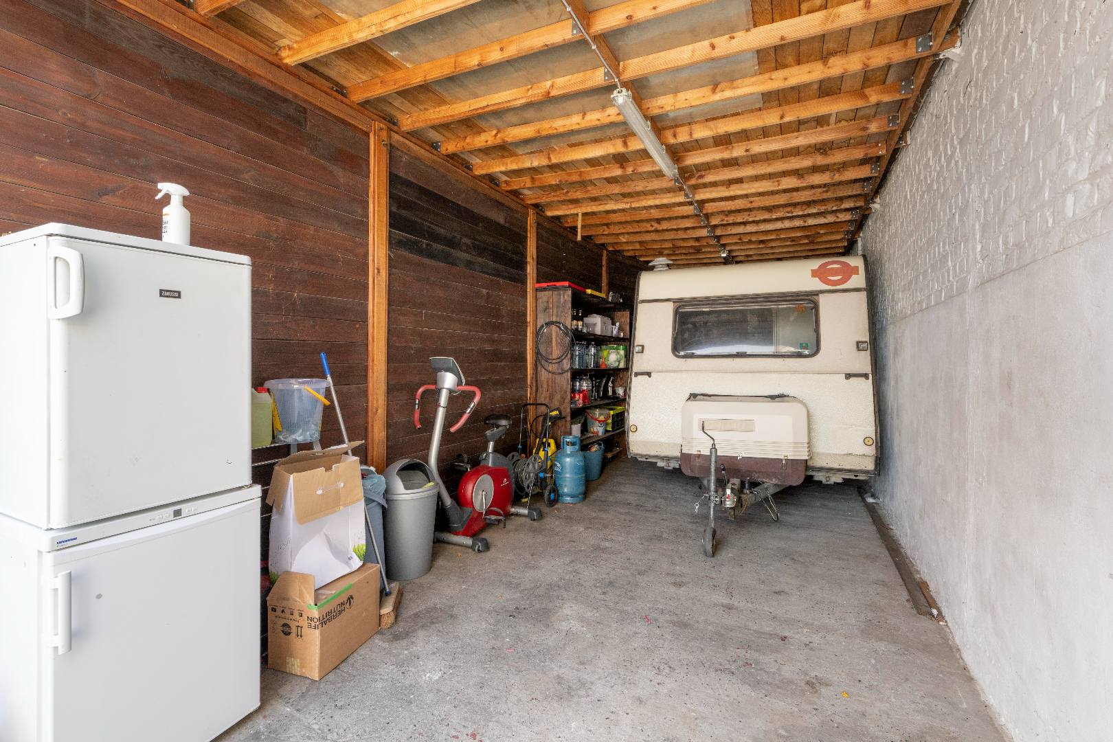 De eigendom is voorzien van een gezellig terras/koer (uitbreiding mogelijk) en uitgerust met een ruime garage en loods van 285 m² met diverse zolderverdiepingen.