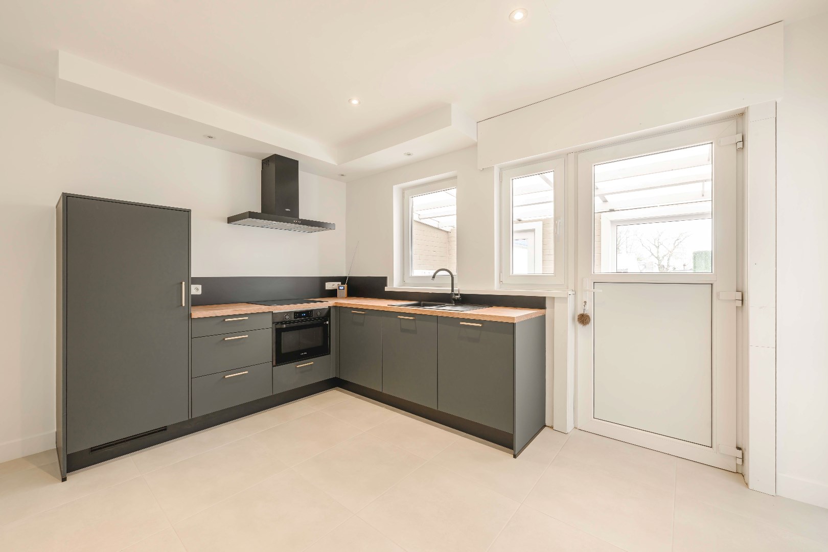U komt binnen via de inkomhal met apart toilet verder is er directe toegang tot de lichtrijke leefruimte (24 m²) met zit- en eethoek. Aansluitend is er de volledig ingerichte keuken 13 m² (kookplaat | dampkap | spoelbak | combi-oven | frigo) met toegang tot de veranda (8 m²) met aansluiting voor wasmachine en droogkast. Deze biedt directe toegang tot de tuin.