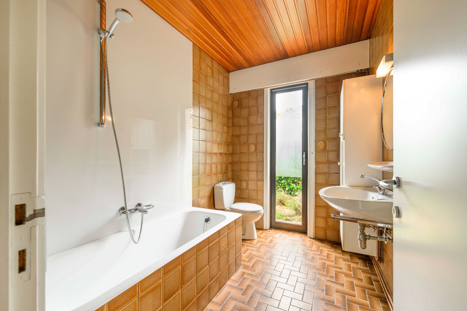 Op het gelijkvloers beschikt U over een eerste slaapkamer (14 m²) en de ingerichte badkamer (ligbad | lavabo | toilet).