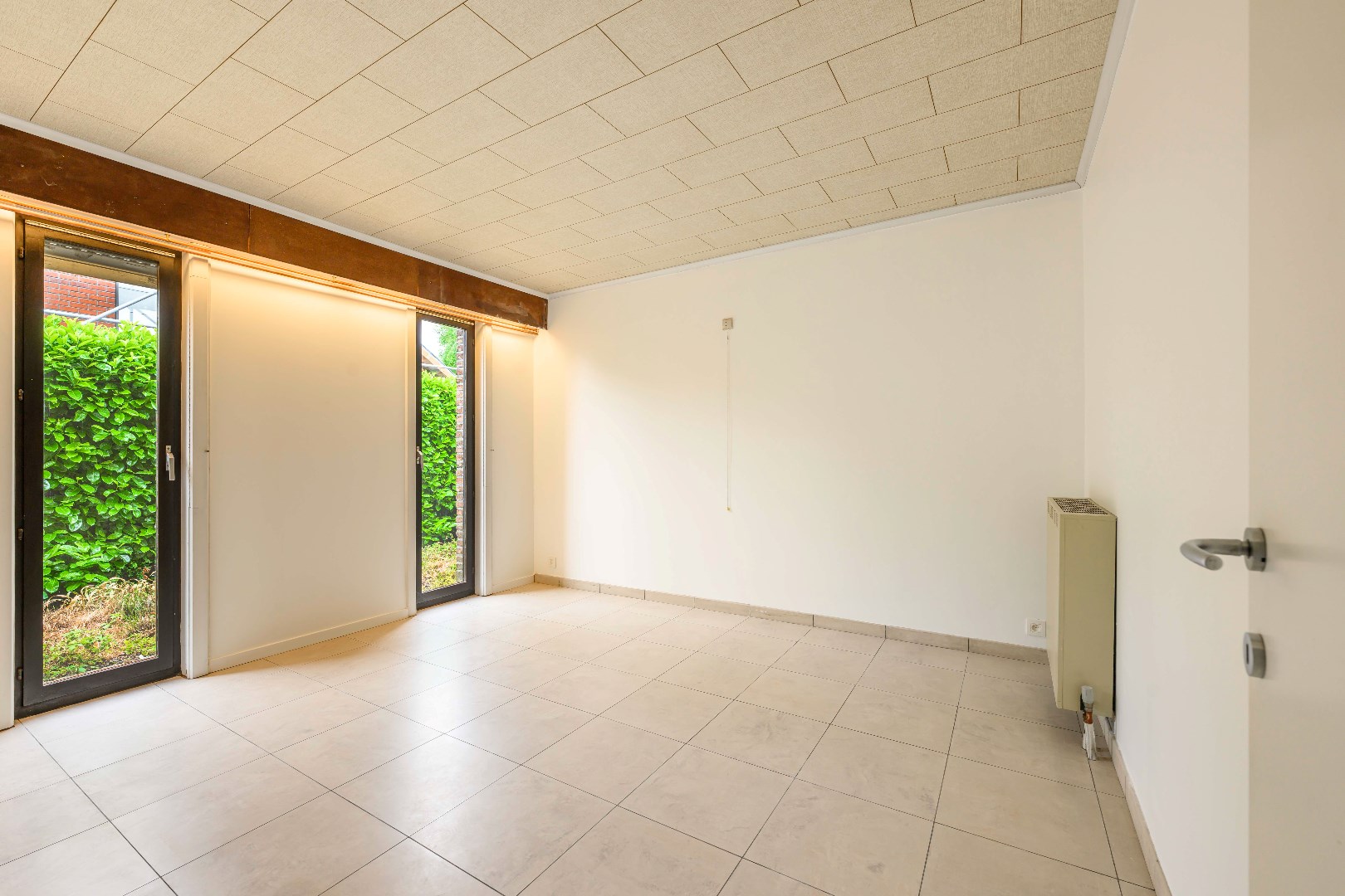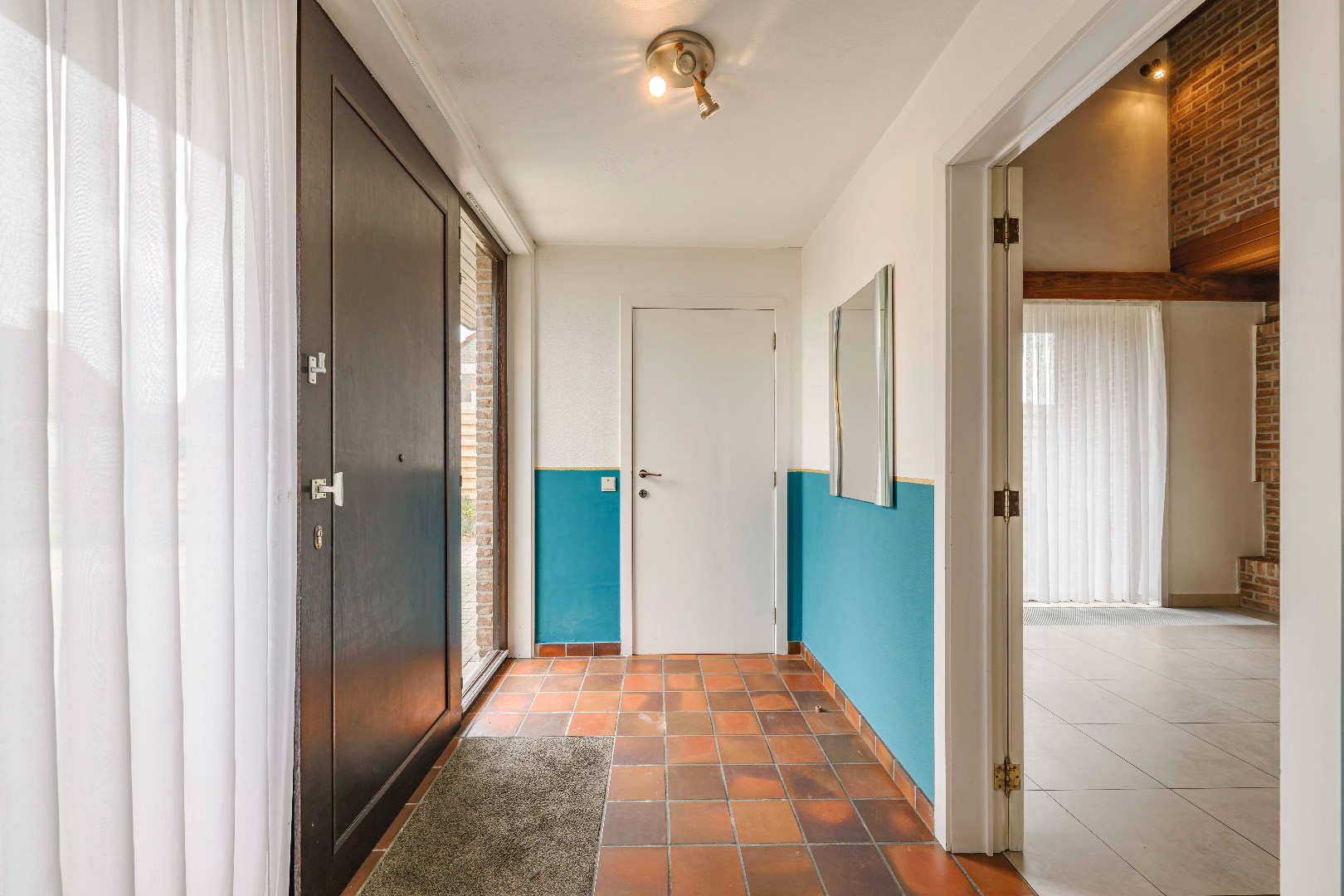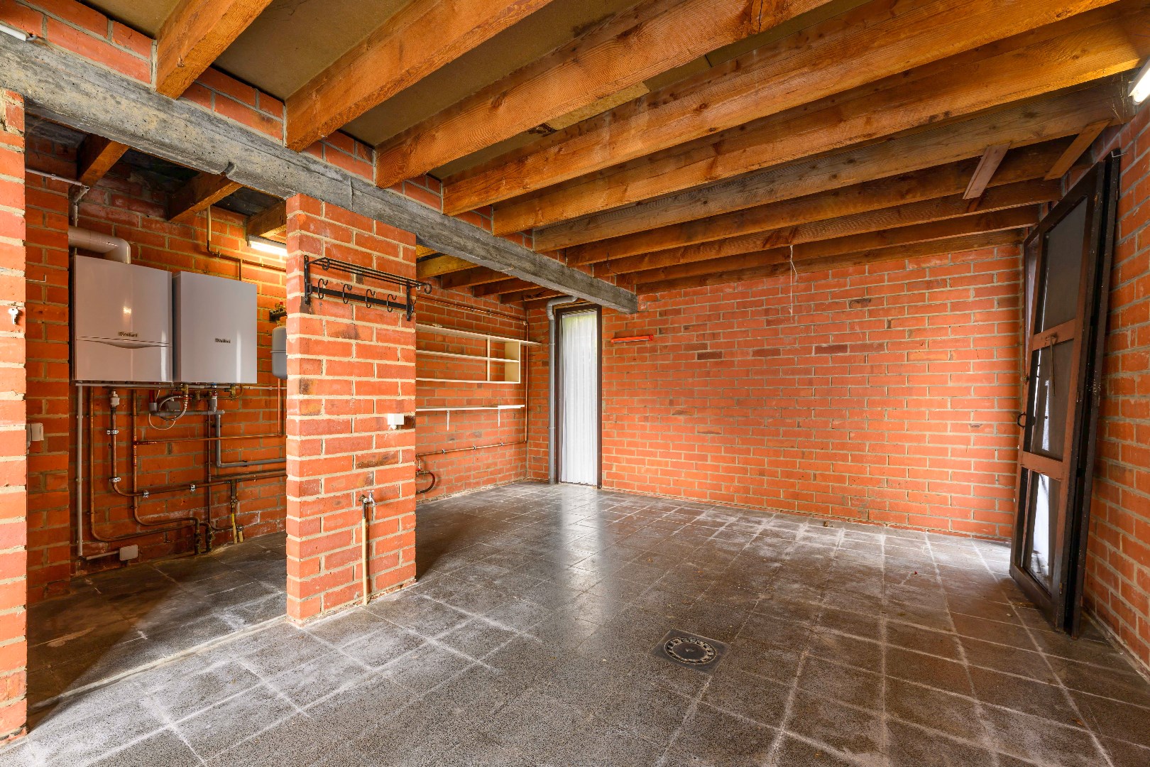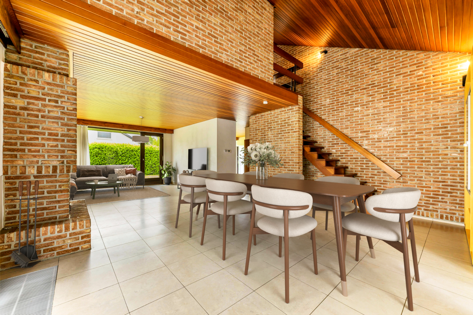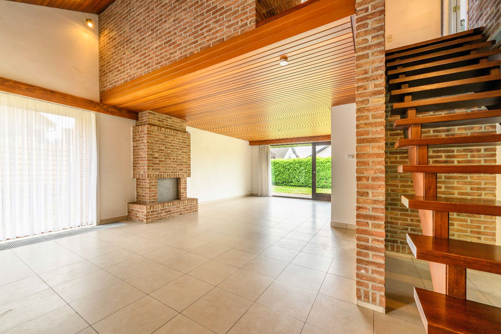 U komt binnen via de inkomhal met apart gastentoilet. Er is van hieruit toegang tot zowel de inpandige garage (32 m²) met technische ruimte alsook tot de ruime en lichtrijke leefruimte van maar liefst 47 m². Indien gewenst kan U de open haard terug in gebruik nemen. Vanuit deze leefruimte is er directe toegang tot de tuin.