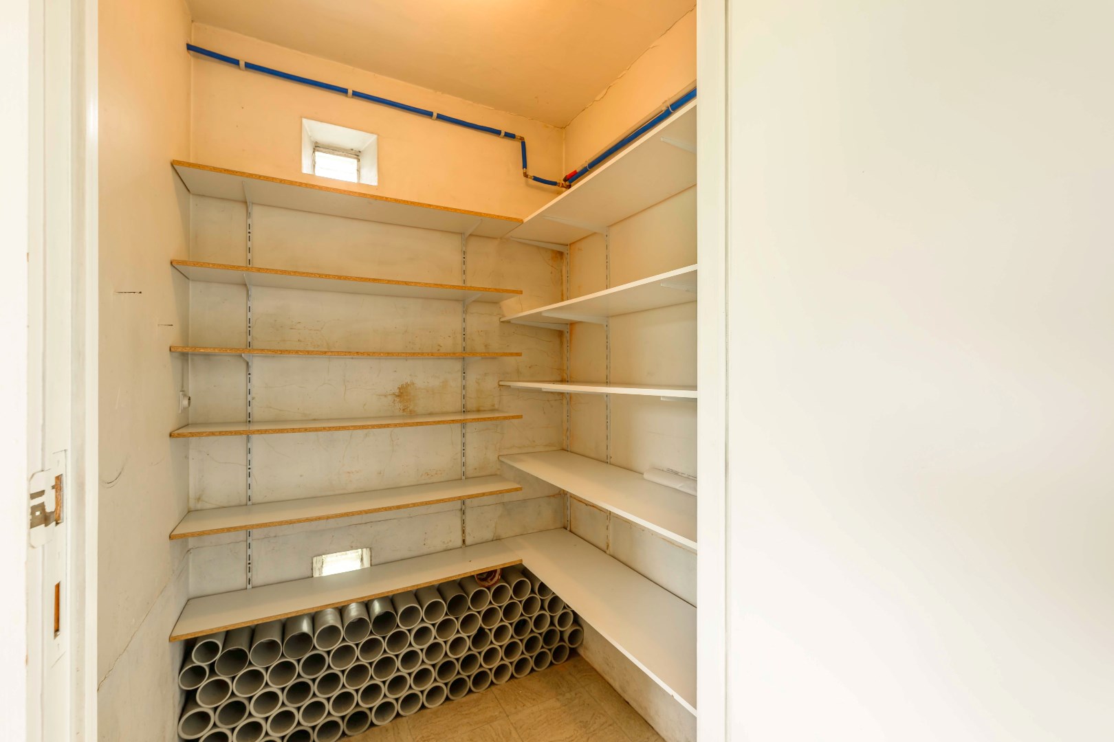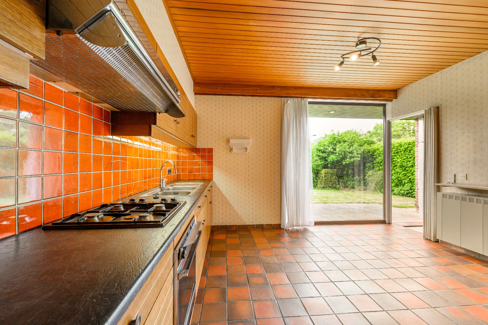 Aansluitend is er de gesloten ingerichte leefkeuken (kookplaat | dampkap | spoelbak | oven) met praktische koele berging (3 m²) en met achterinkom/wasruimte.