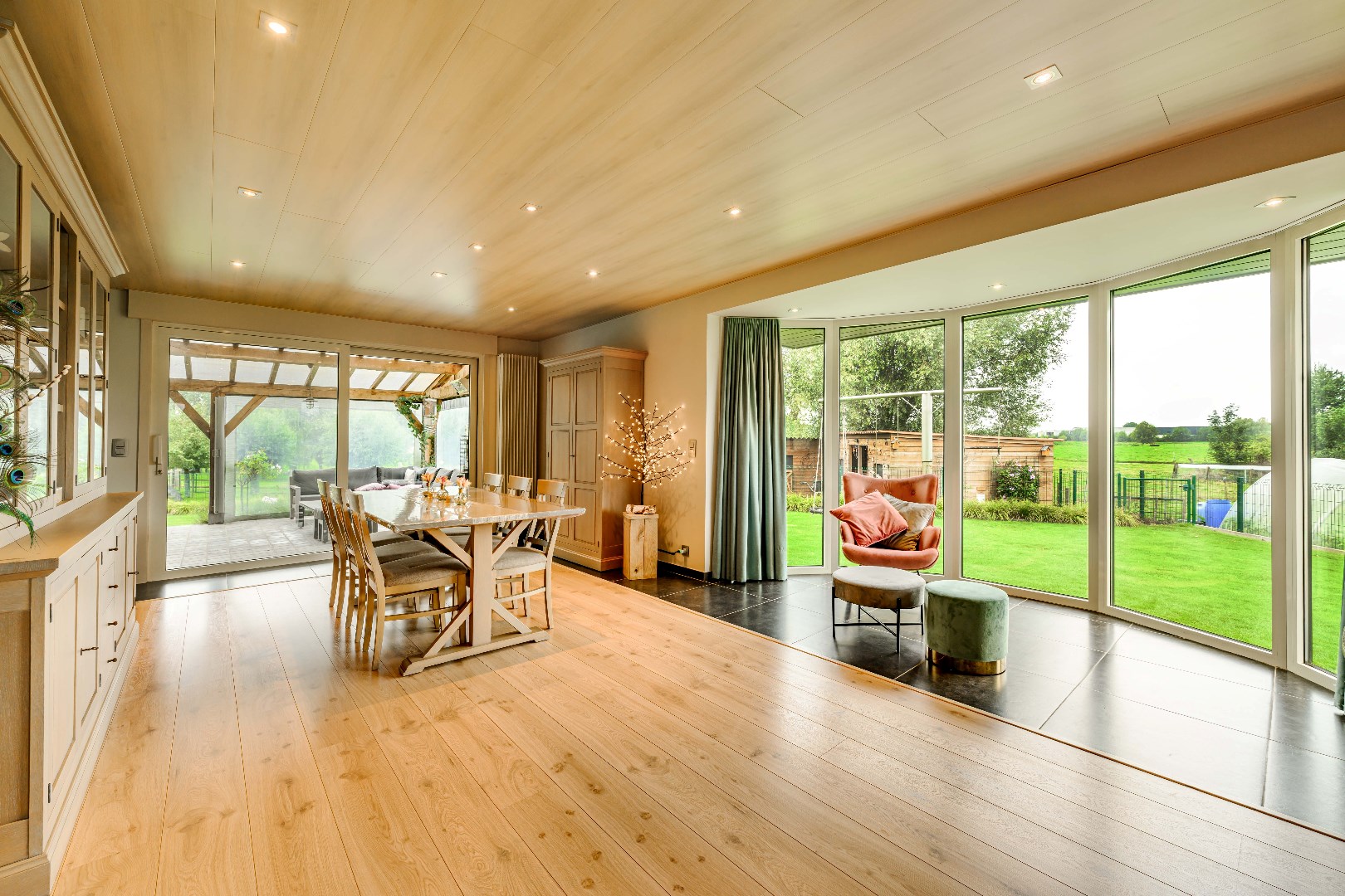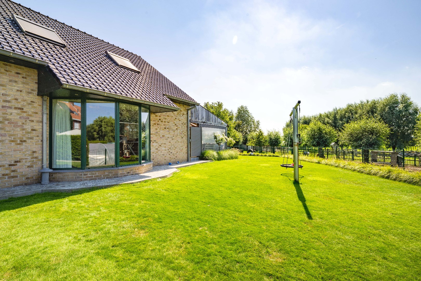 Deze statige villa werd opgetrokken in 2005 met kwalitatieve materialen en omvat een inkom met vestiaire en een gastentoilet. Vervolgens is er toegang tot de lichtrijke leefruimte (42 m²) met gezellige houtcassette. Aansluitend is er de volledig ingerichte leefkeuken (voorzien van dubbele spoelbak, kookplaat met dampkap, oven, microgolf en frigo). Vanuit zowel de keuken als de leefruimte is er directe toegang tot de tuin en geniet U van een prachtig zicht op de weilanden.