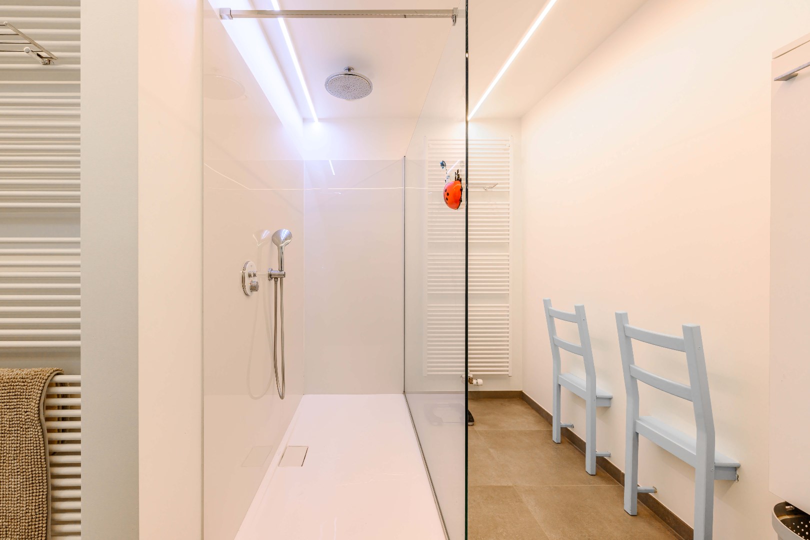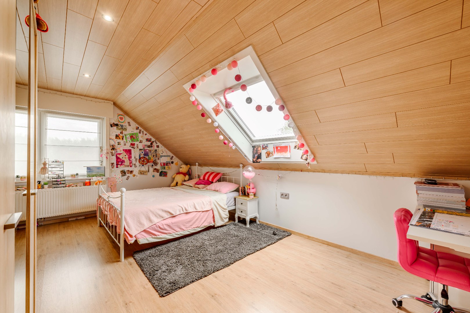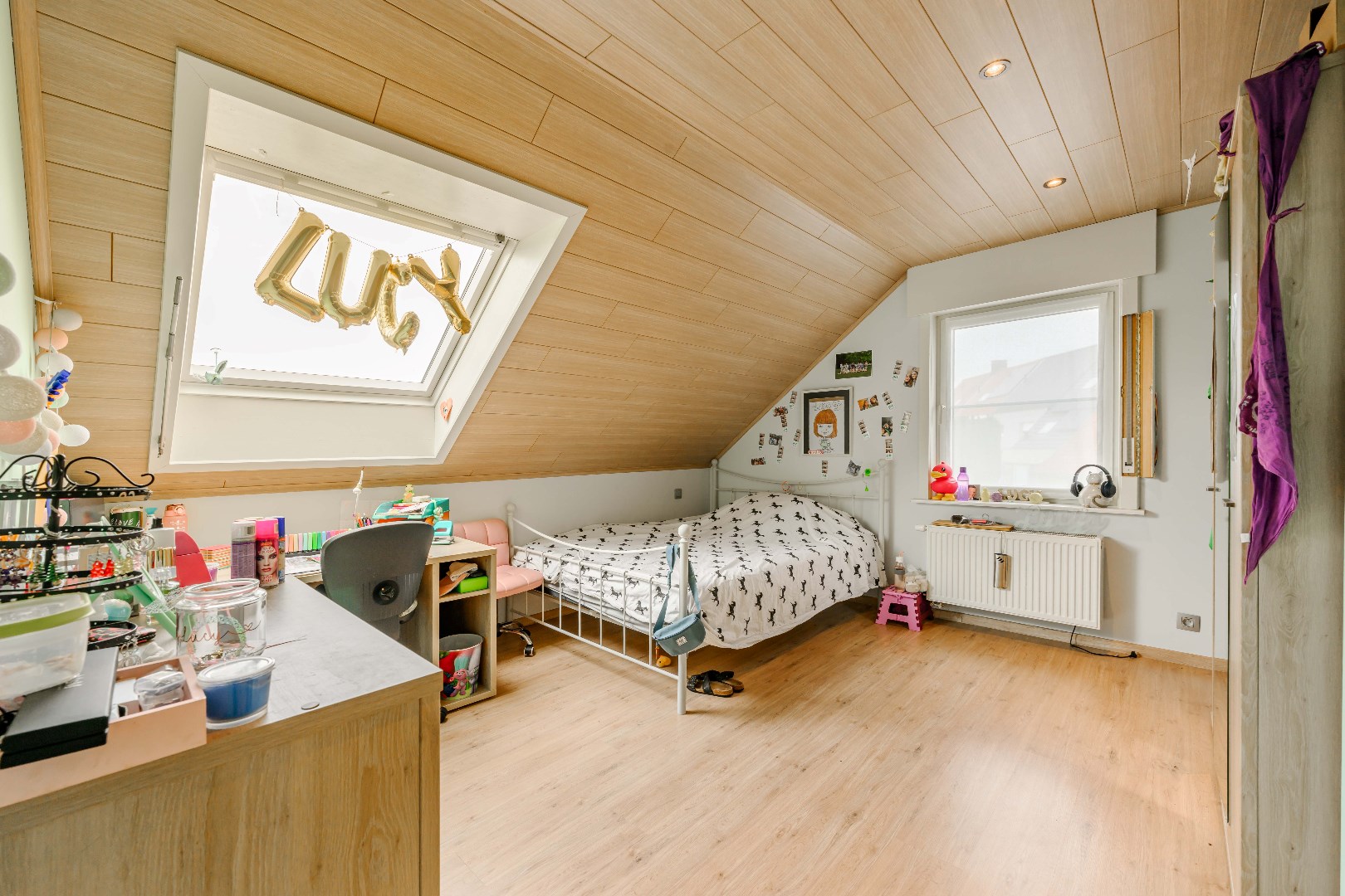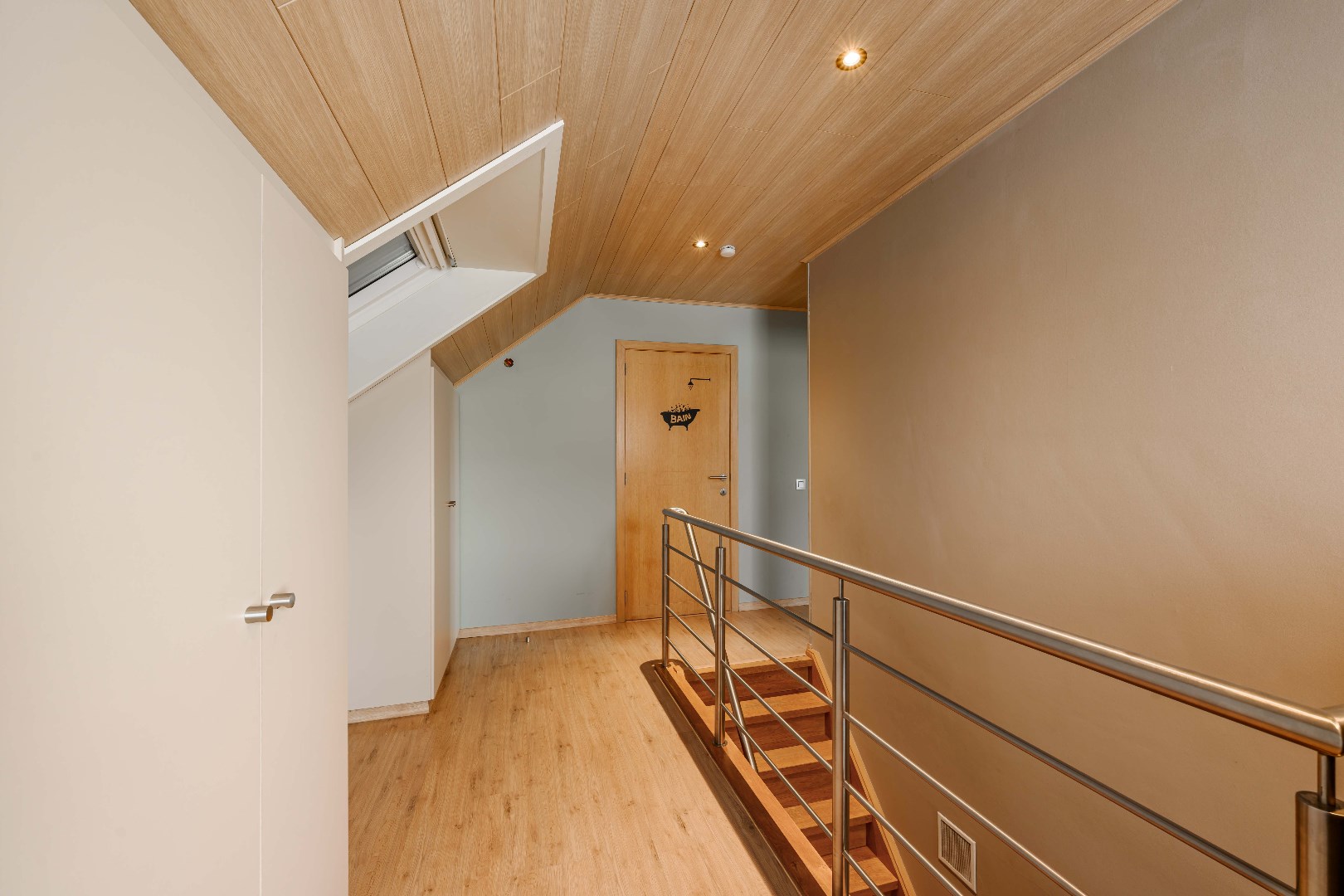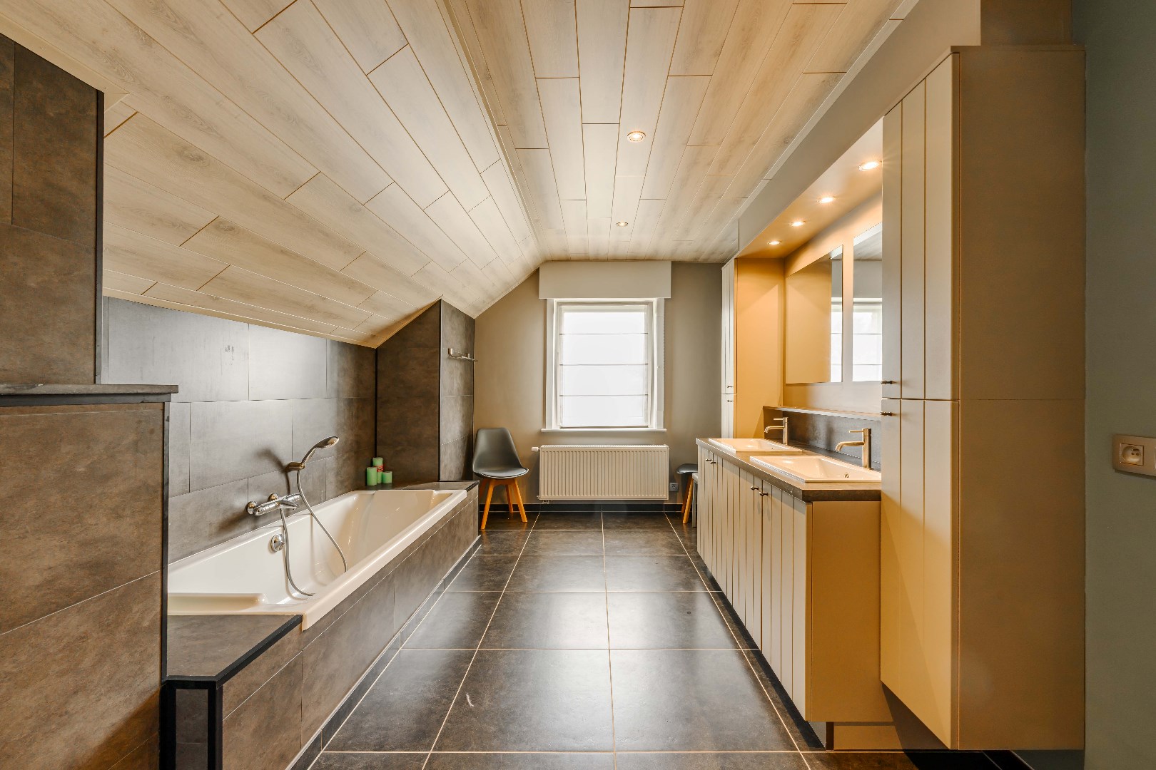 Het verdiep omvat een ruime nachthall met ingemaakte kastenwand, twee ruime slaapkamer (16,50 m² | 19,25 m²). Tevens een volledig ingerichte badkamer met toilet, ligbad, dubbele lavabo met meubel).