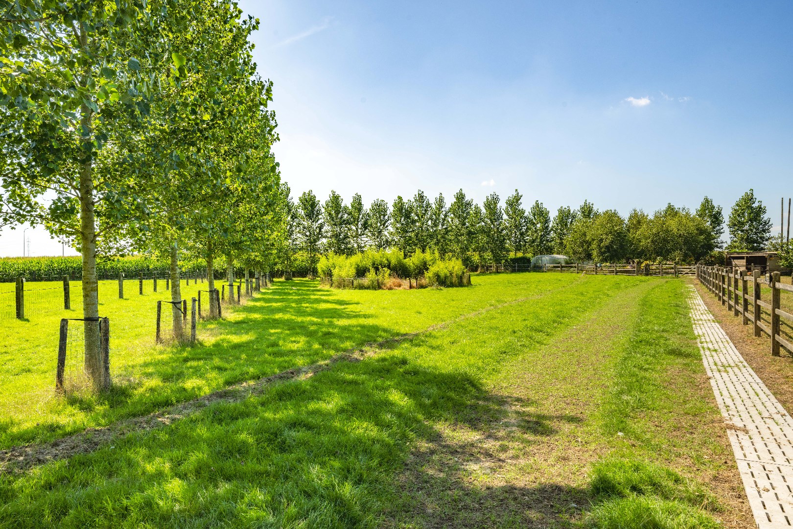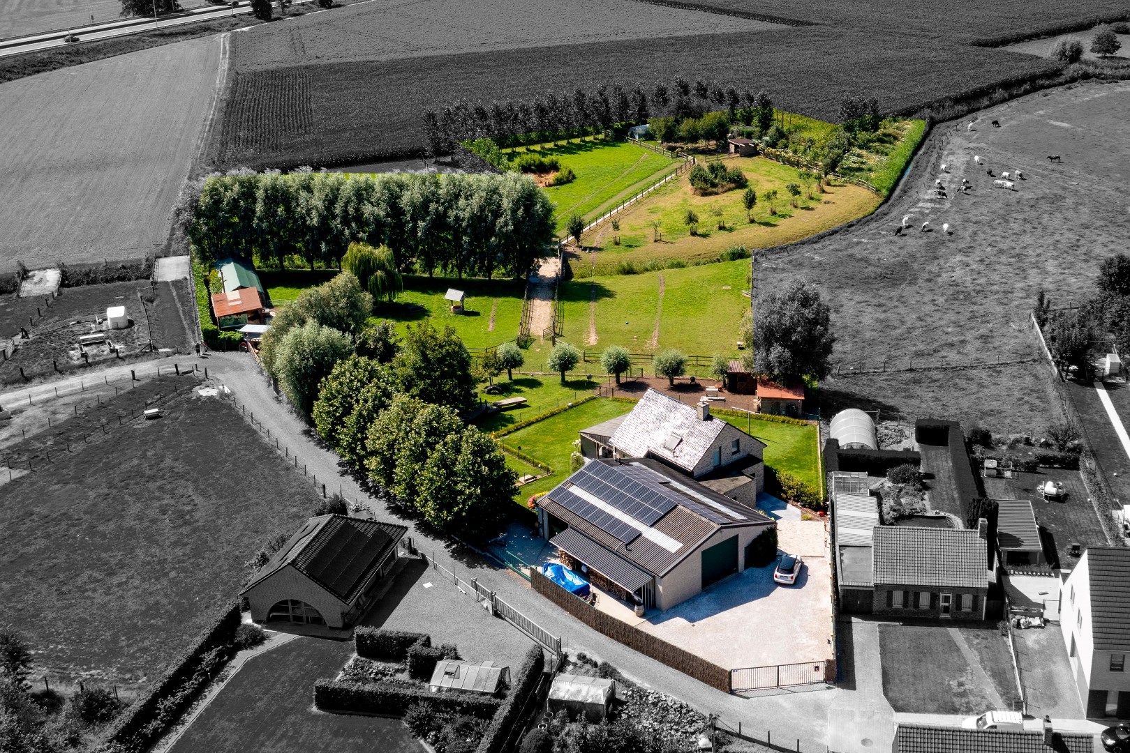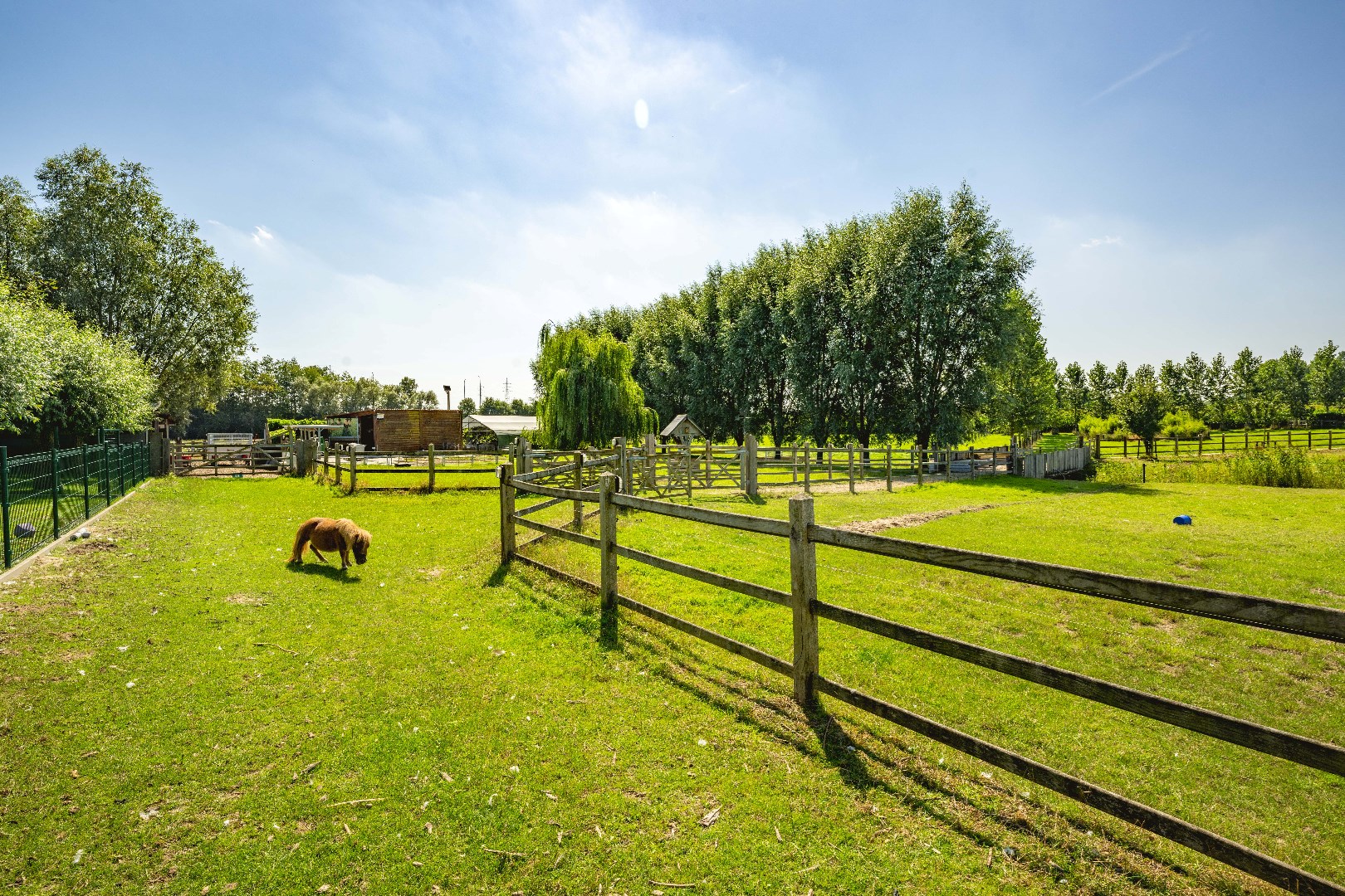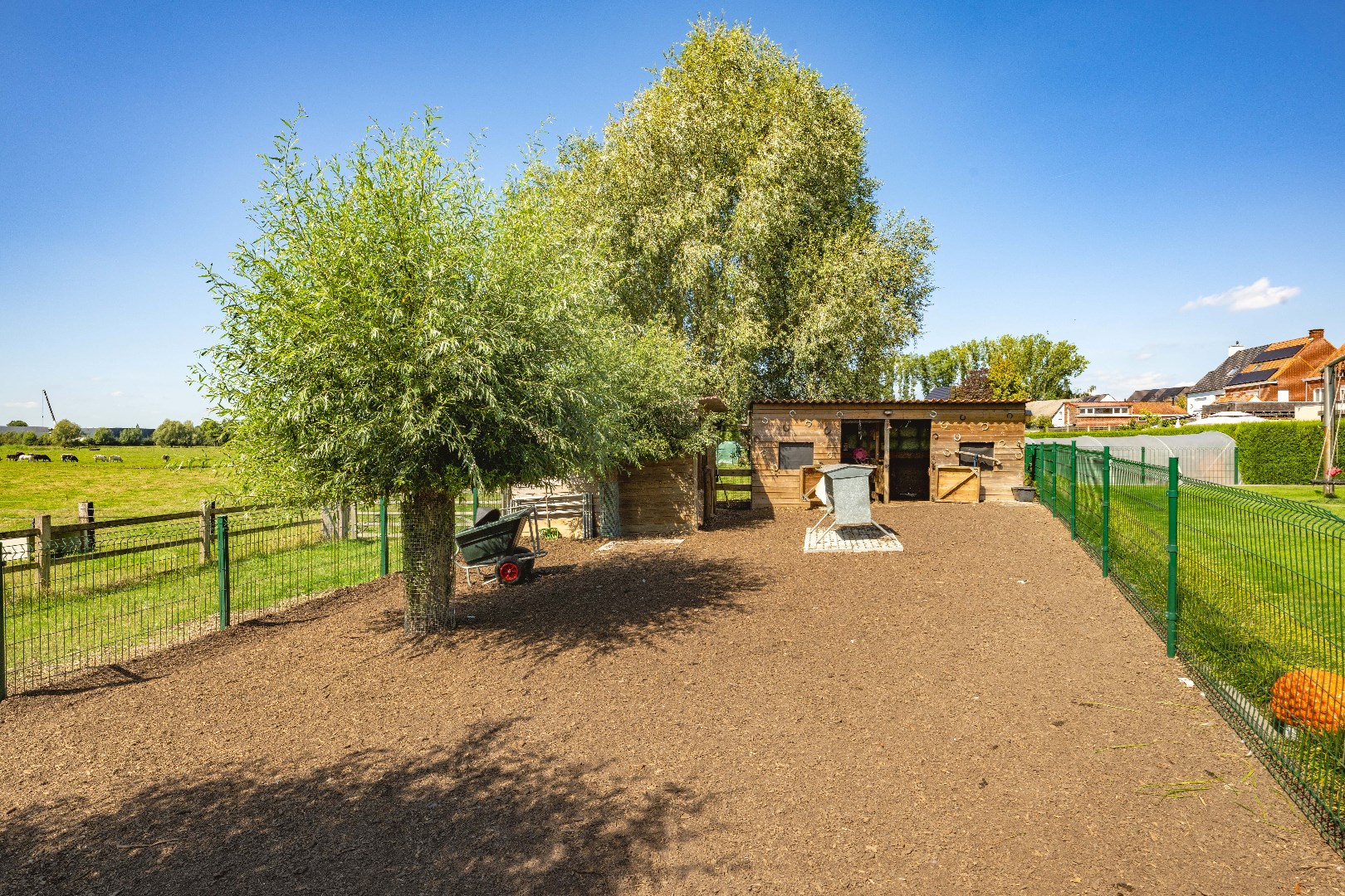 De achterliggende weiden zijn allen voorzien van een kwalitatieve afsluiting, elektriciteit en water. Over de eigendom zijn er diverse schuilstallingen voorzien alsook een serre en bloemenweide. Deze zijn via een afzonderlijke oprit ook bereikbaar!