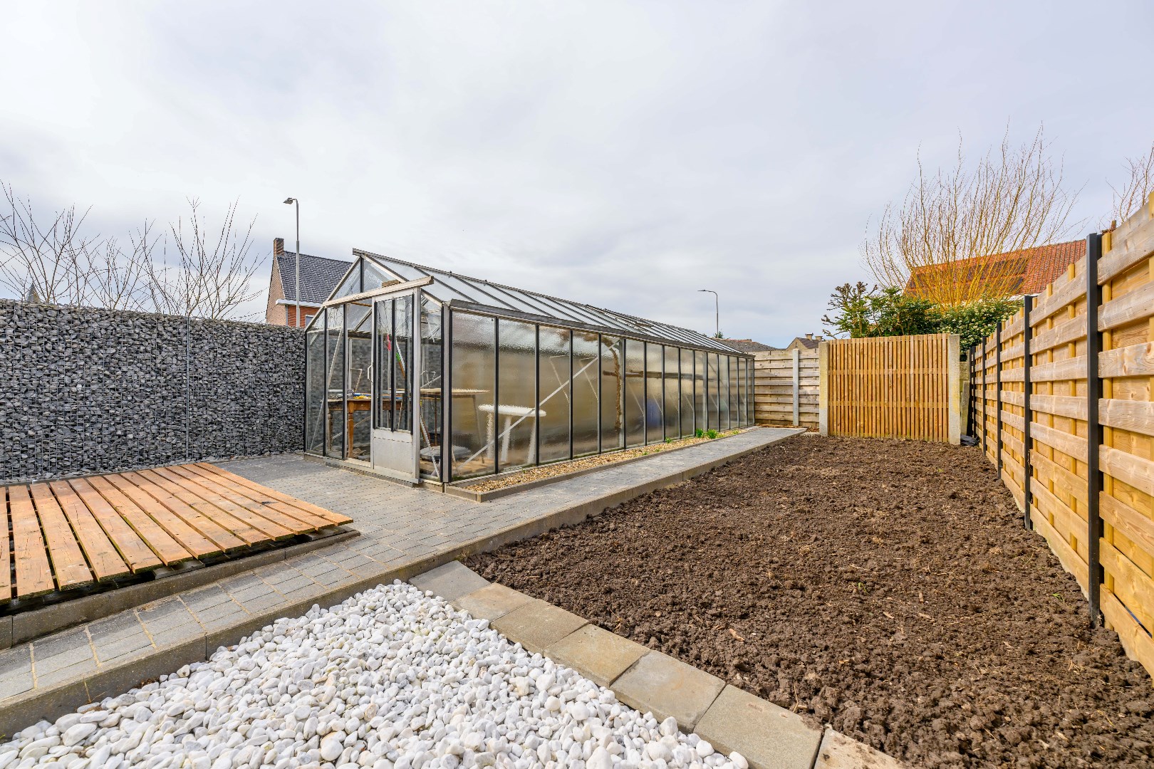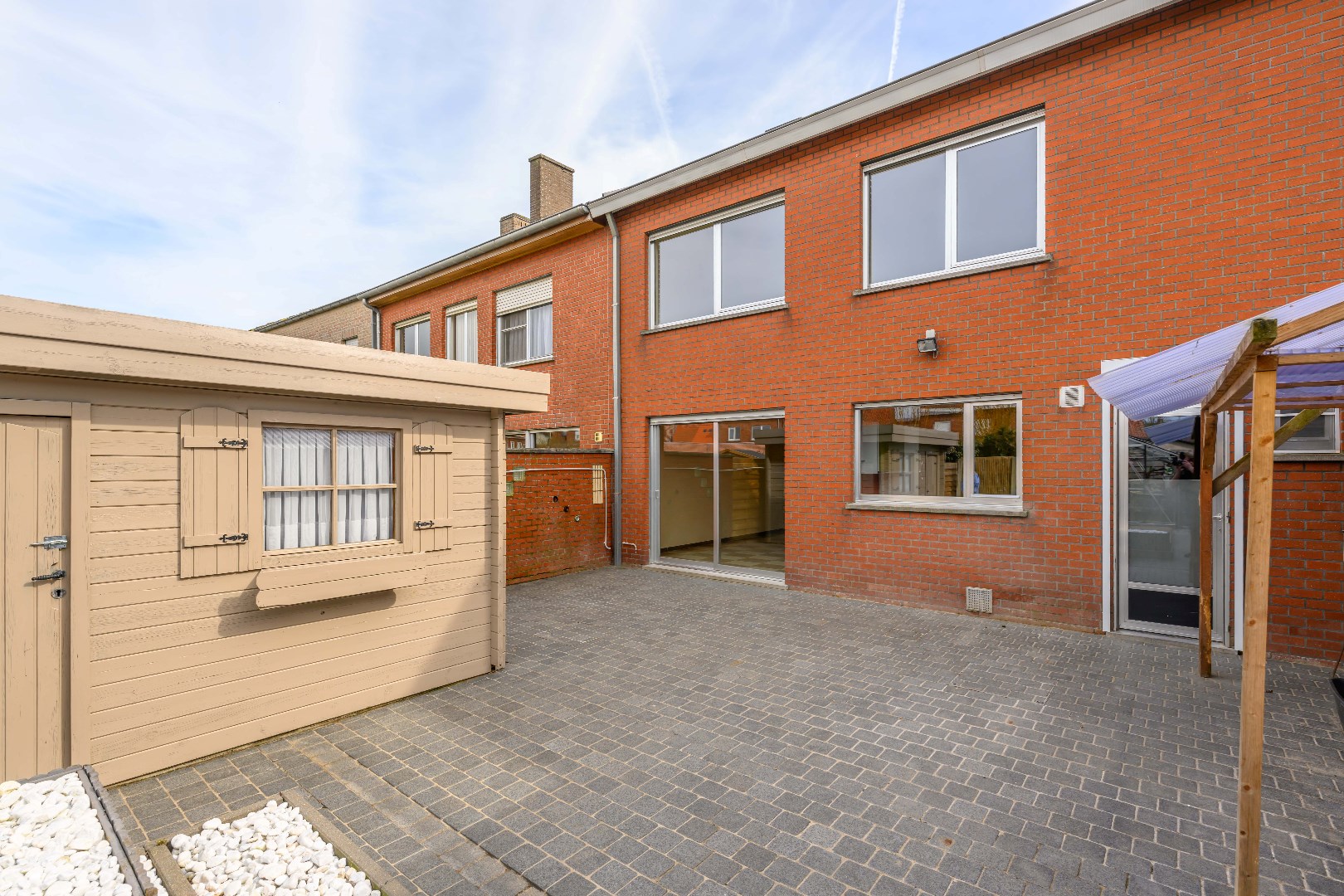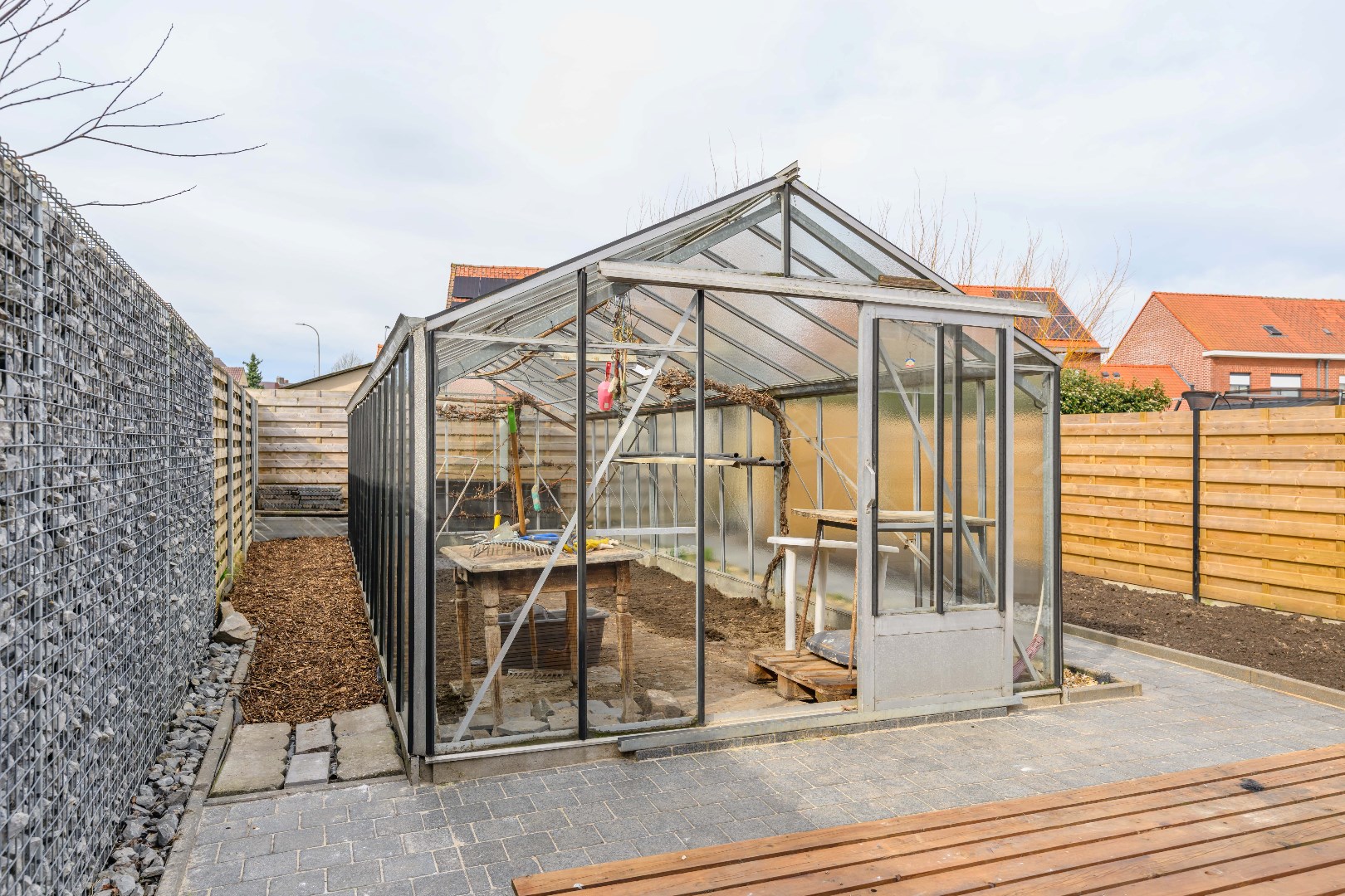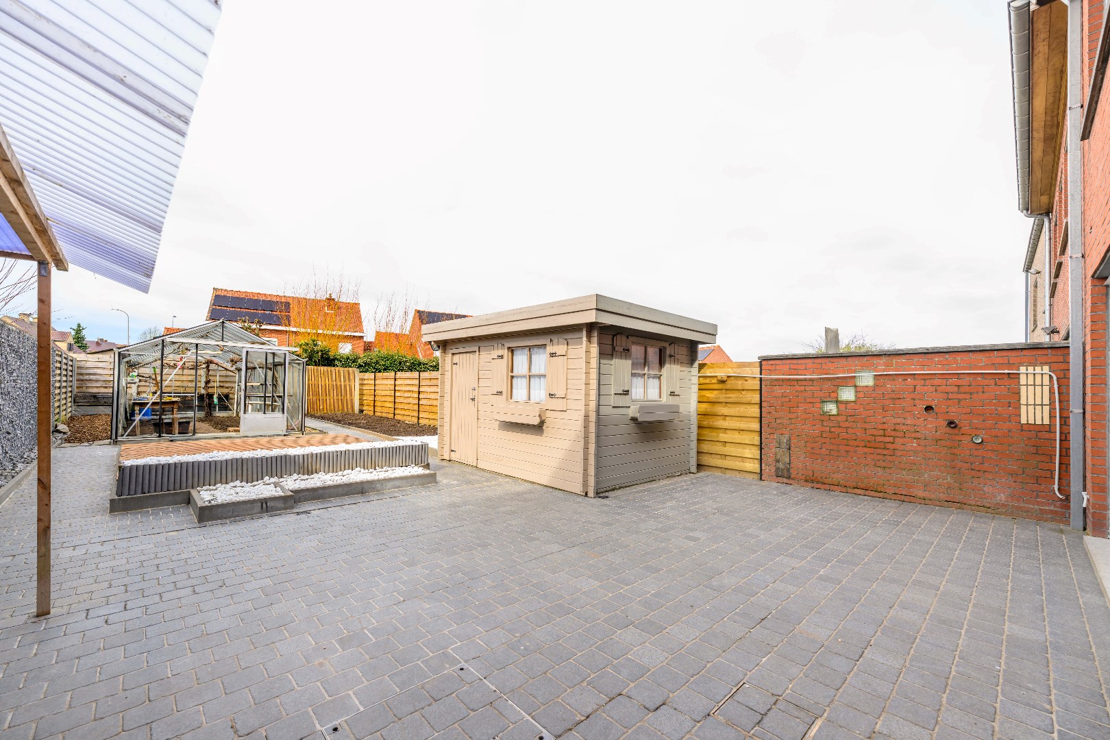 De woning is voorzien van een ruime voor- en achtertuin. De achtertuin is volledig afgesloten en ingevolge kindvriendelijk. De tuin is voorzien en een praktische tuinberging (10 m²) alsook ruime serre (27 m²) en een gezellig terras. U beschikt over een private parkeerplaats op eigen terrein voor 2 wagens.
