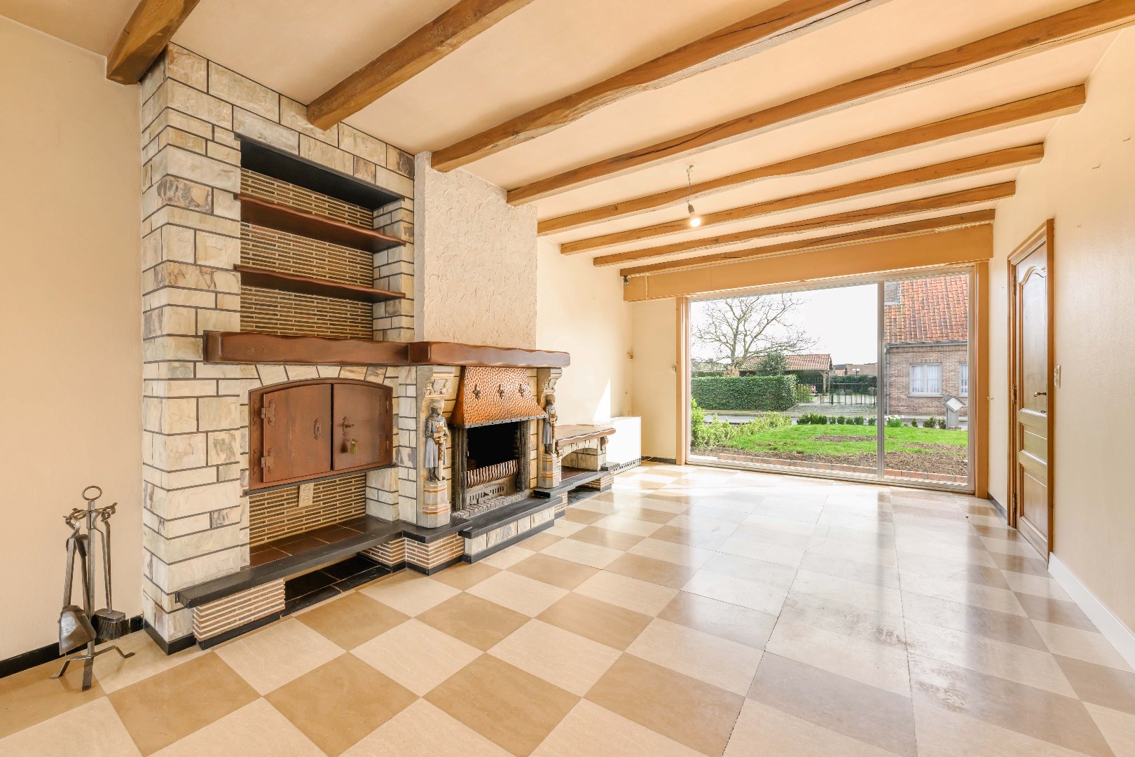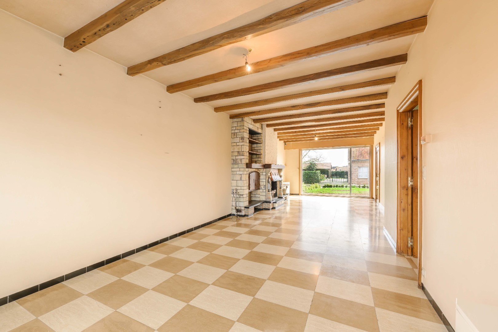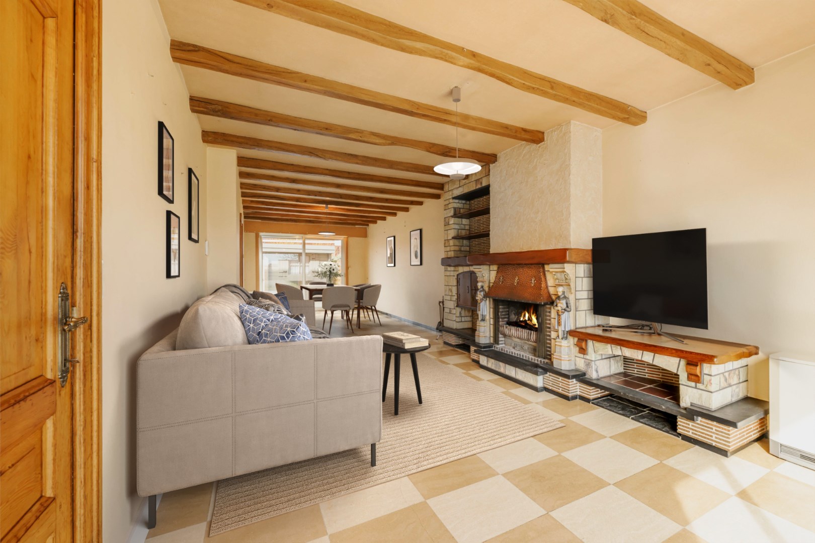 U komt binnen via de inkomhall met aansluitend de lichtrijke leefruimte (38 m²) met zit- en eethoek alsook aan gezellig open haard.