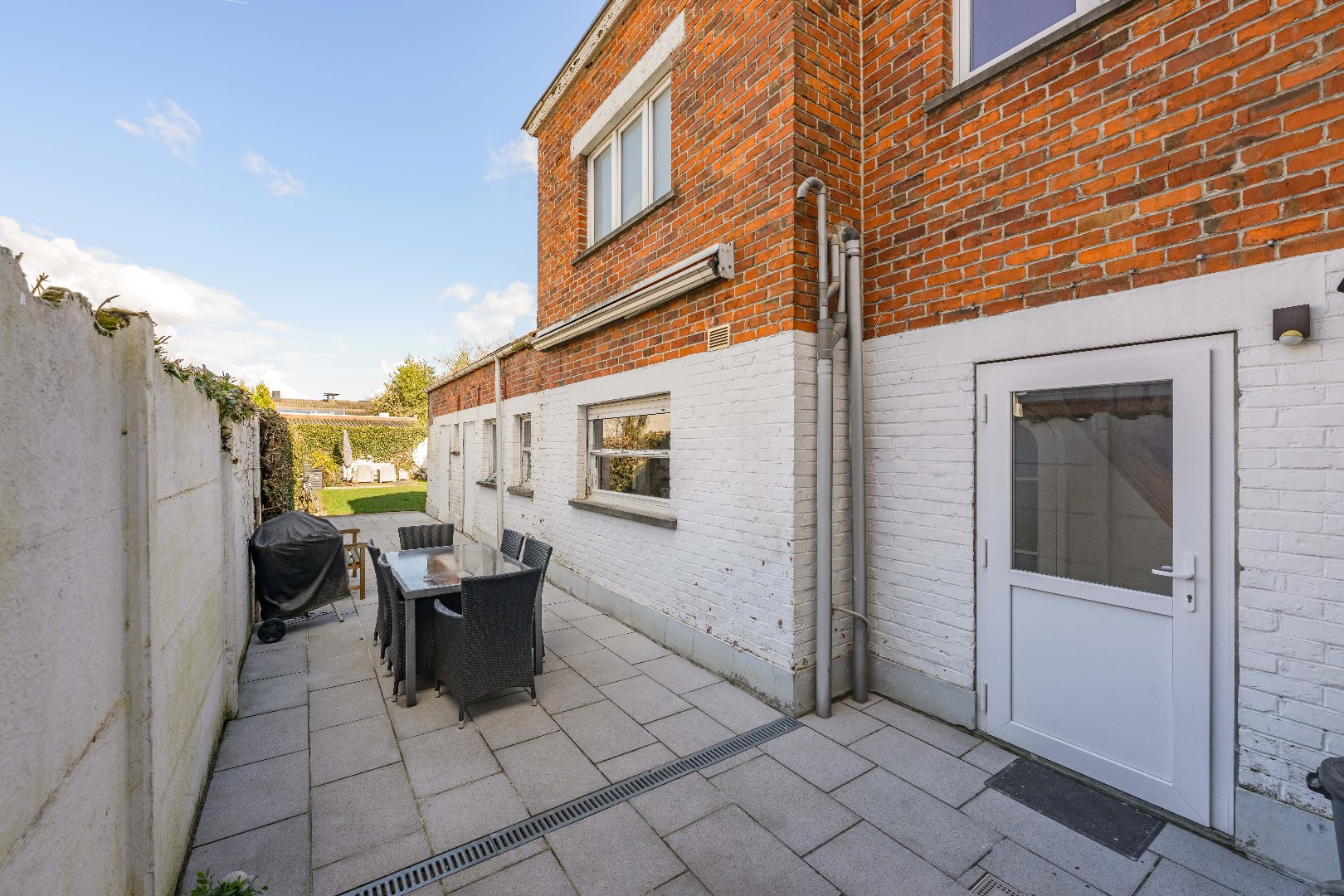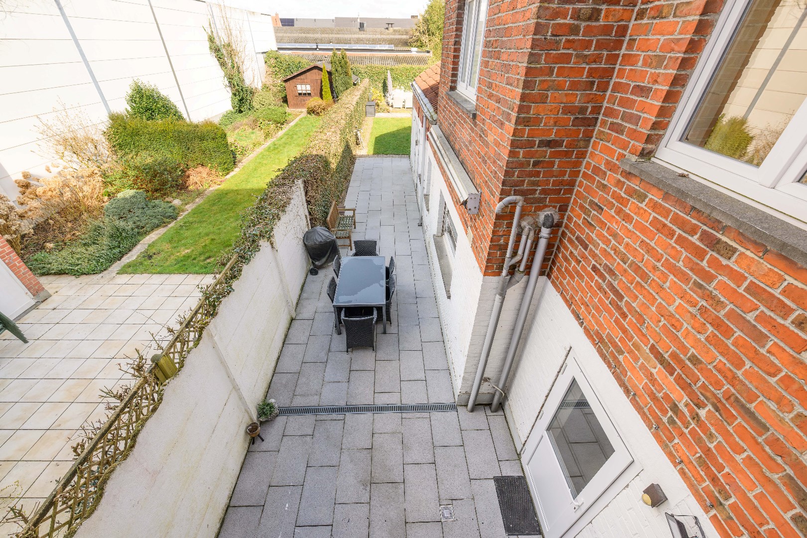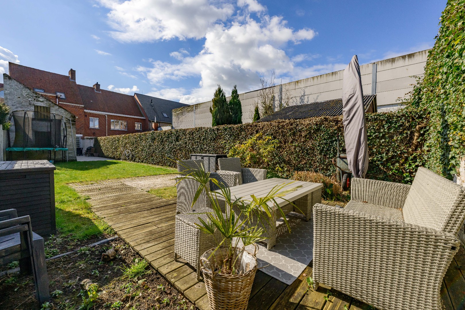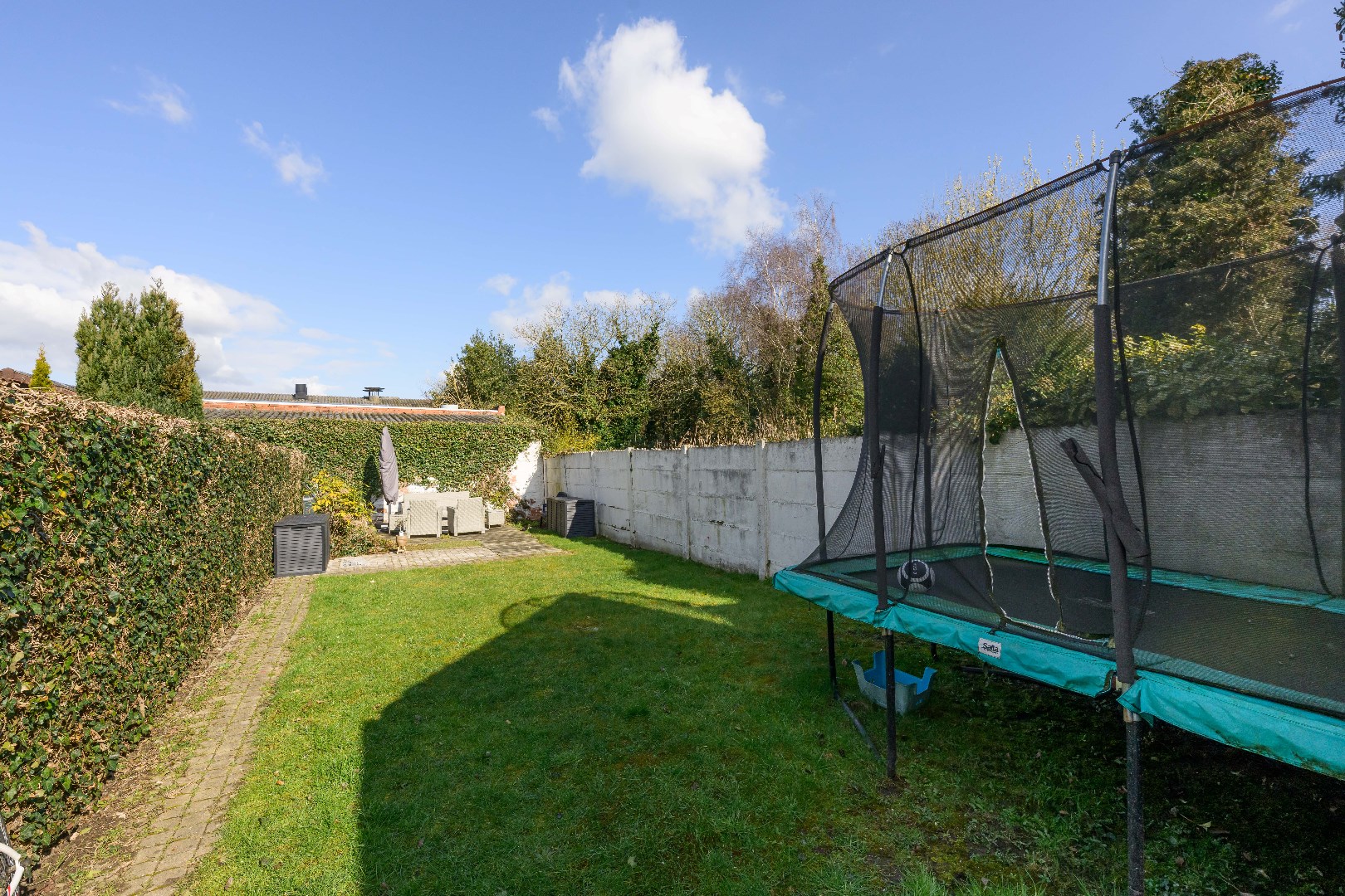 Deze woning is voorzien van een ruime achtertuin (110 m²) met verschillende terrasjes zodoende U op elk moment van de dag kan genieten! Tevens een praktische tuinberging alsook een ZIJTOEGANG!! Verder is er voldoende gratis parkeergelegenheid in de straat.