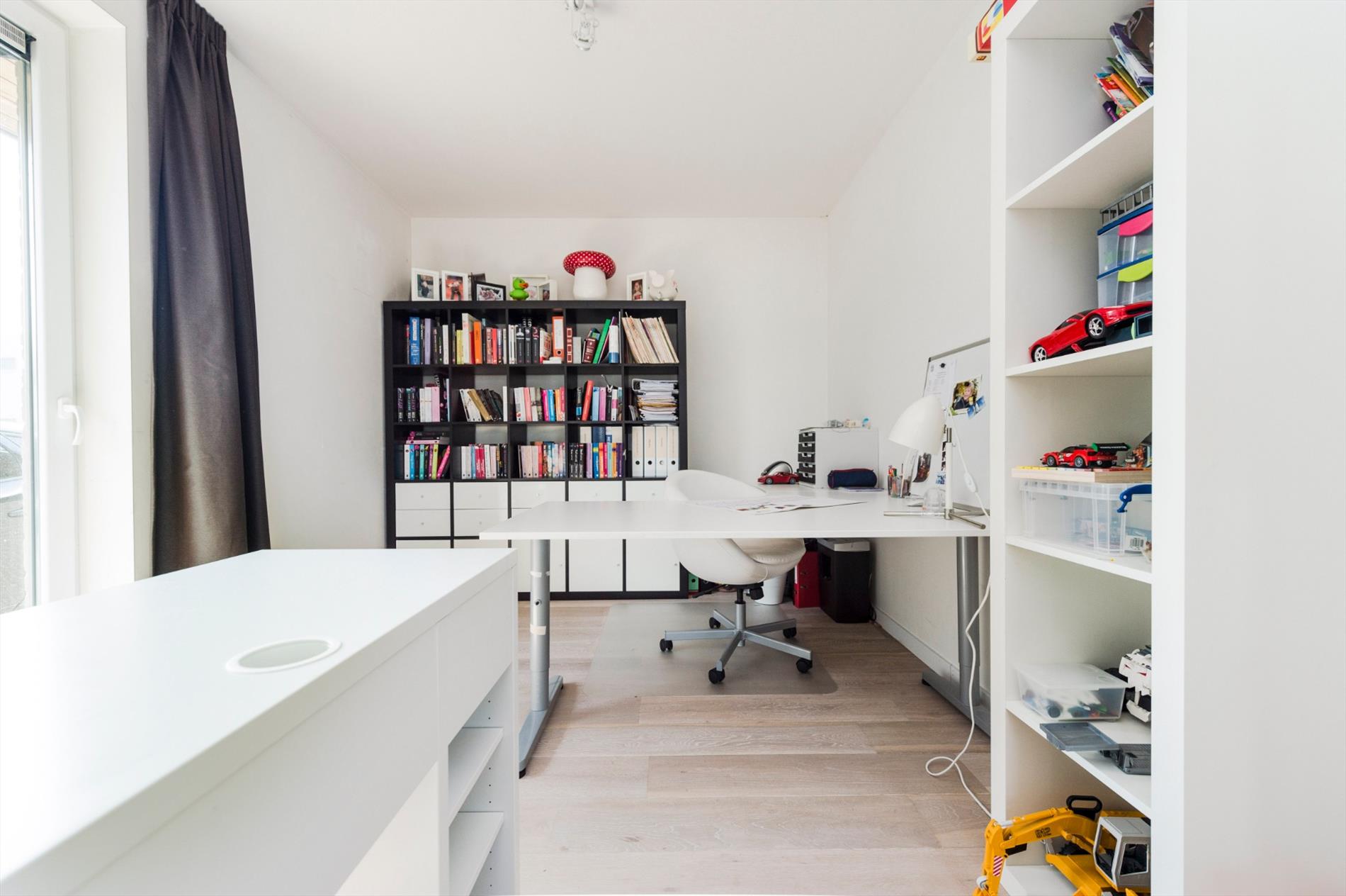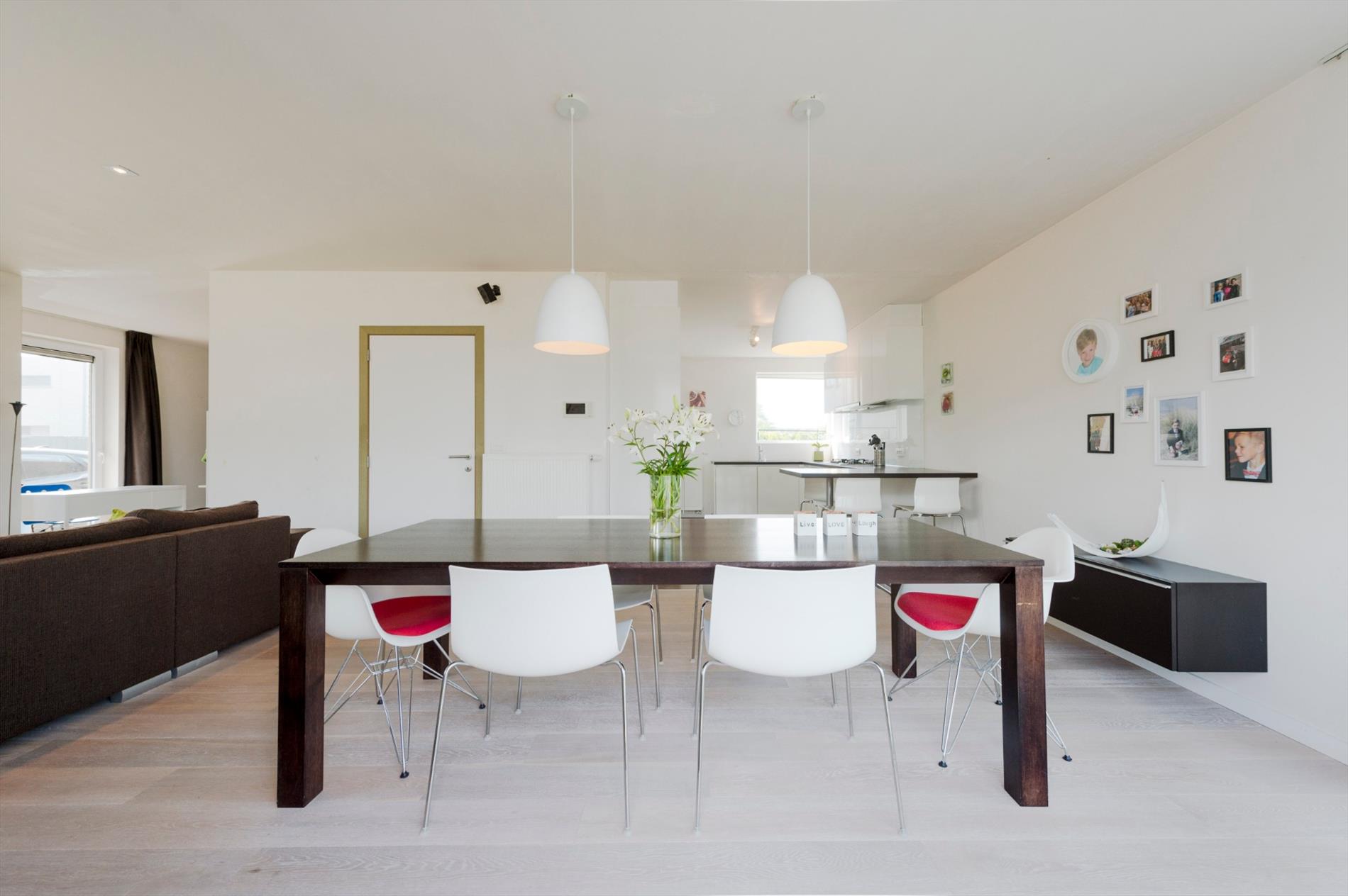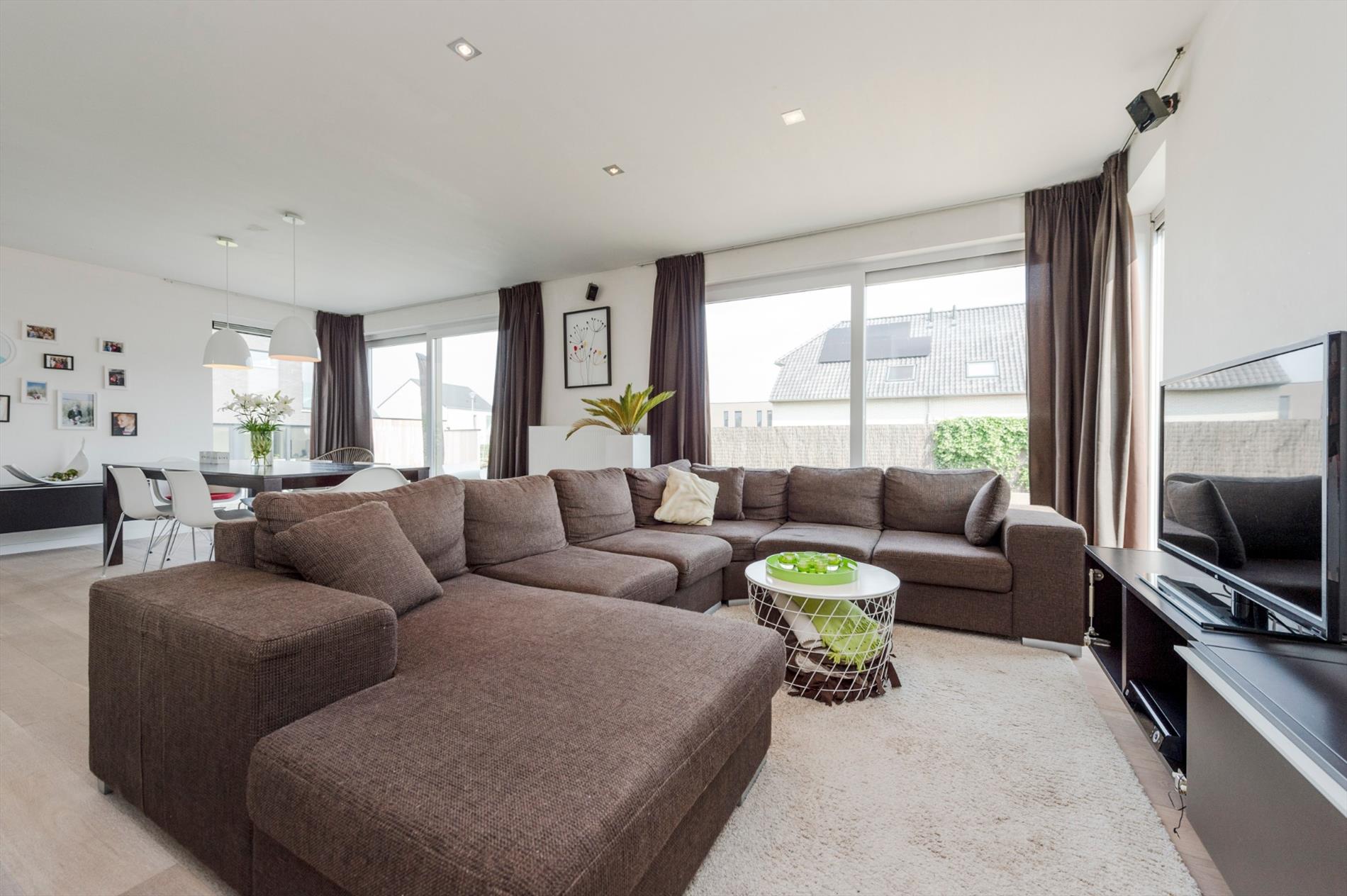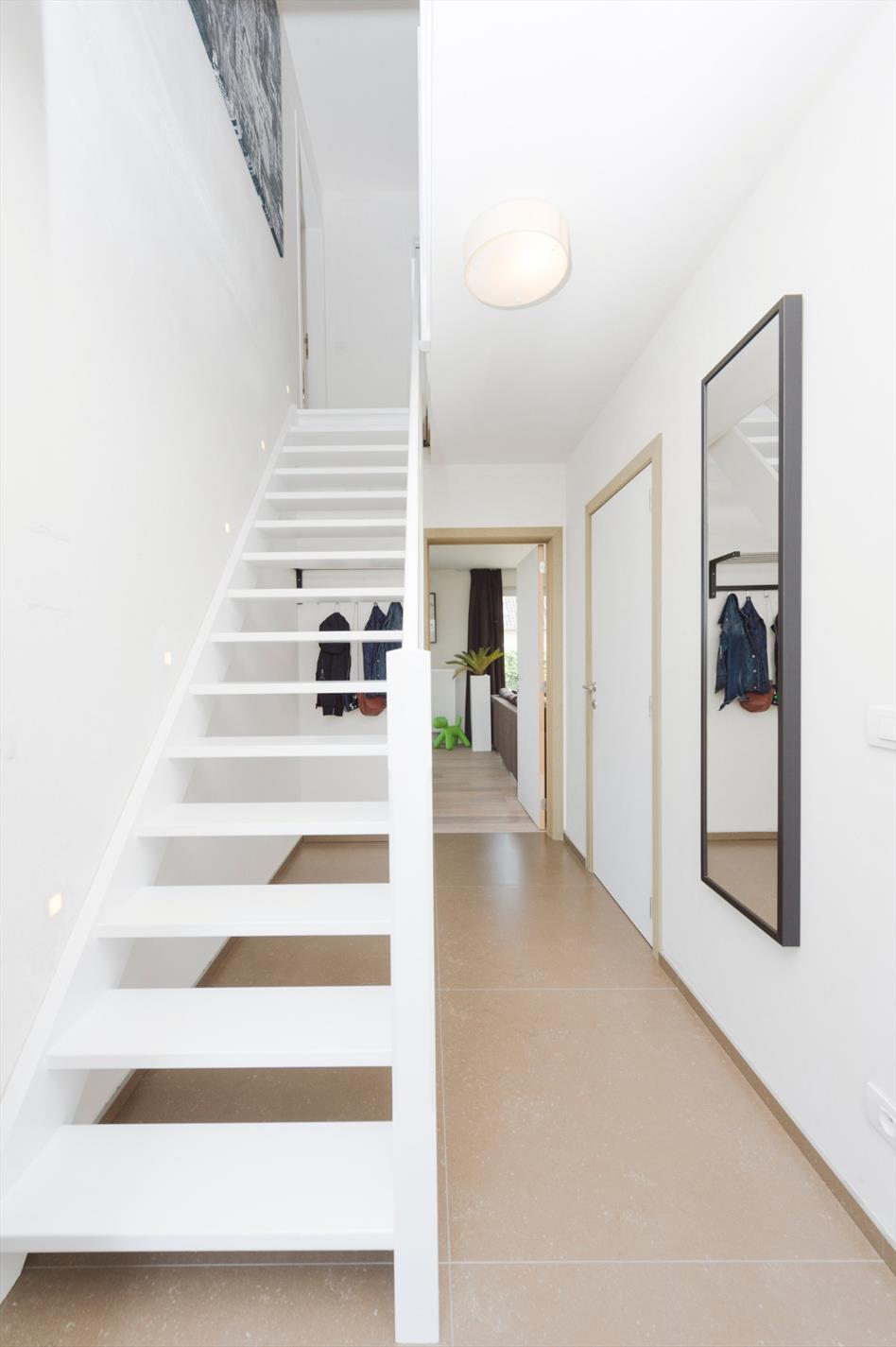Gelijkvloers: We komen binnen in een lichtrijke inkomhal met apart toilet en plaats voor een vestiairekast. Via de inkom komen we in de woonkamer met zithoek en eetplaats. De ruime woonkamer (32 m²) is voorzien van 2 grote ramen, die voor veel lichtinval zorgen en een mooi zicht op de tuin bieden. Tevens is er nog een bureauruimte voorzien. De open, ingerichte keuken is uitgerust met een keramische kookplaat, combi-oven, vaatwasmachine, dubbele spoelbak, koelkast en dampkap. Vervolgens is er nog een handige berging van 11m² waar er ook aansluiting is voor een wasmachine en droogkast.