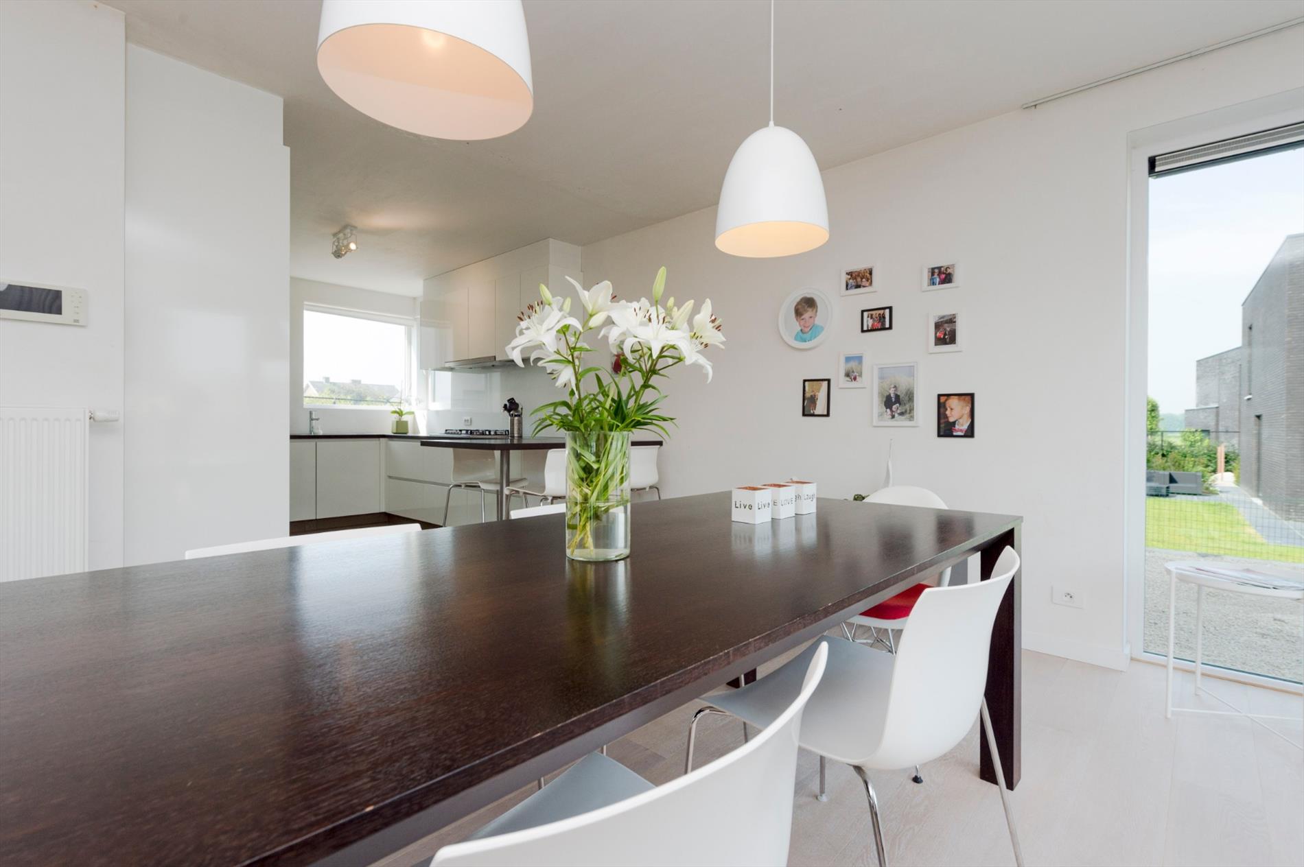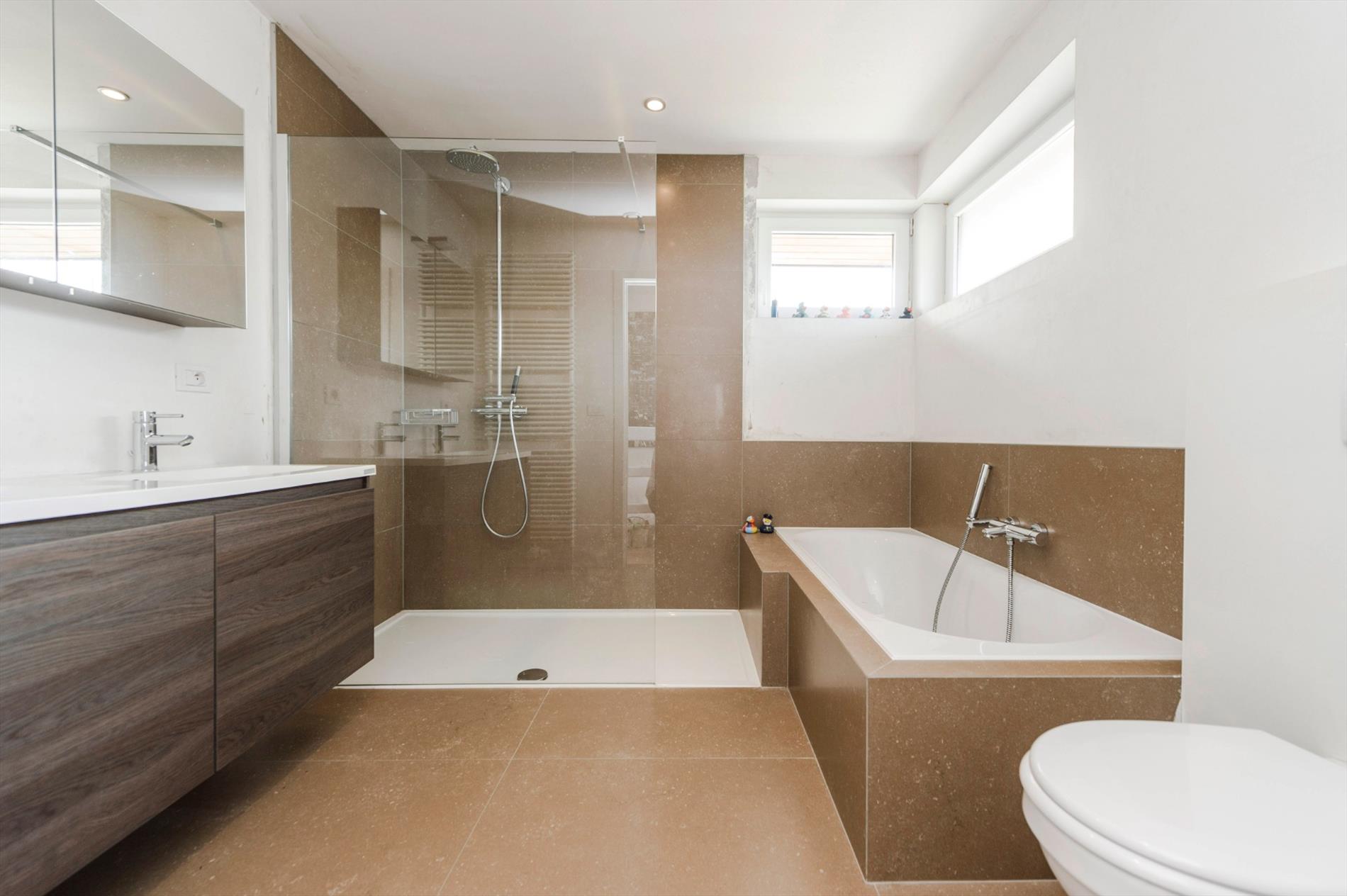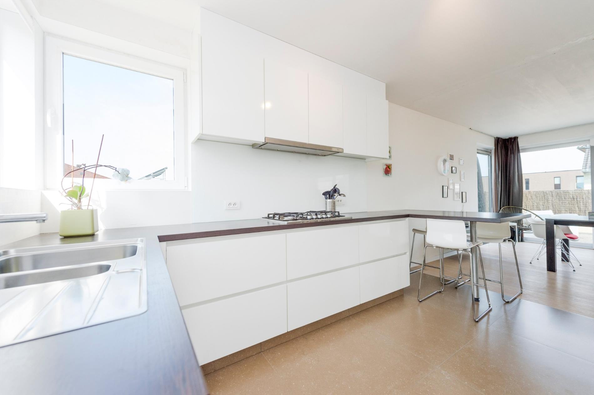Gelijkvloers: We komen binnen in een lichtrijke inkomhal met apart toilet en plaats voor een vestiairekast. Via de inkom komen we in de woonkamer met zithoek en eetplaats. De ruime woonkamer (32 m²) is voorzien van 2 grote ramen, die voor veel lichtinval zorgen en een mooi zicht op de tuin bieden. Tevens is er nog een bureauruimte voorzien. De open, ingerichte keuken is uitgerust met een keramische kookplaat, combi-oven, vaatwasmachine, dubbele spoelbak, koelkast en dampkap. Vervolgens is er nog een handige berging van 11m² waar er ook aansluiting is voor een wasmachine en droogkast.