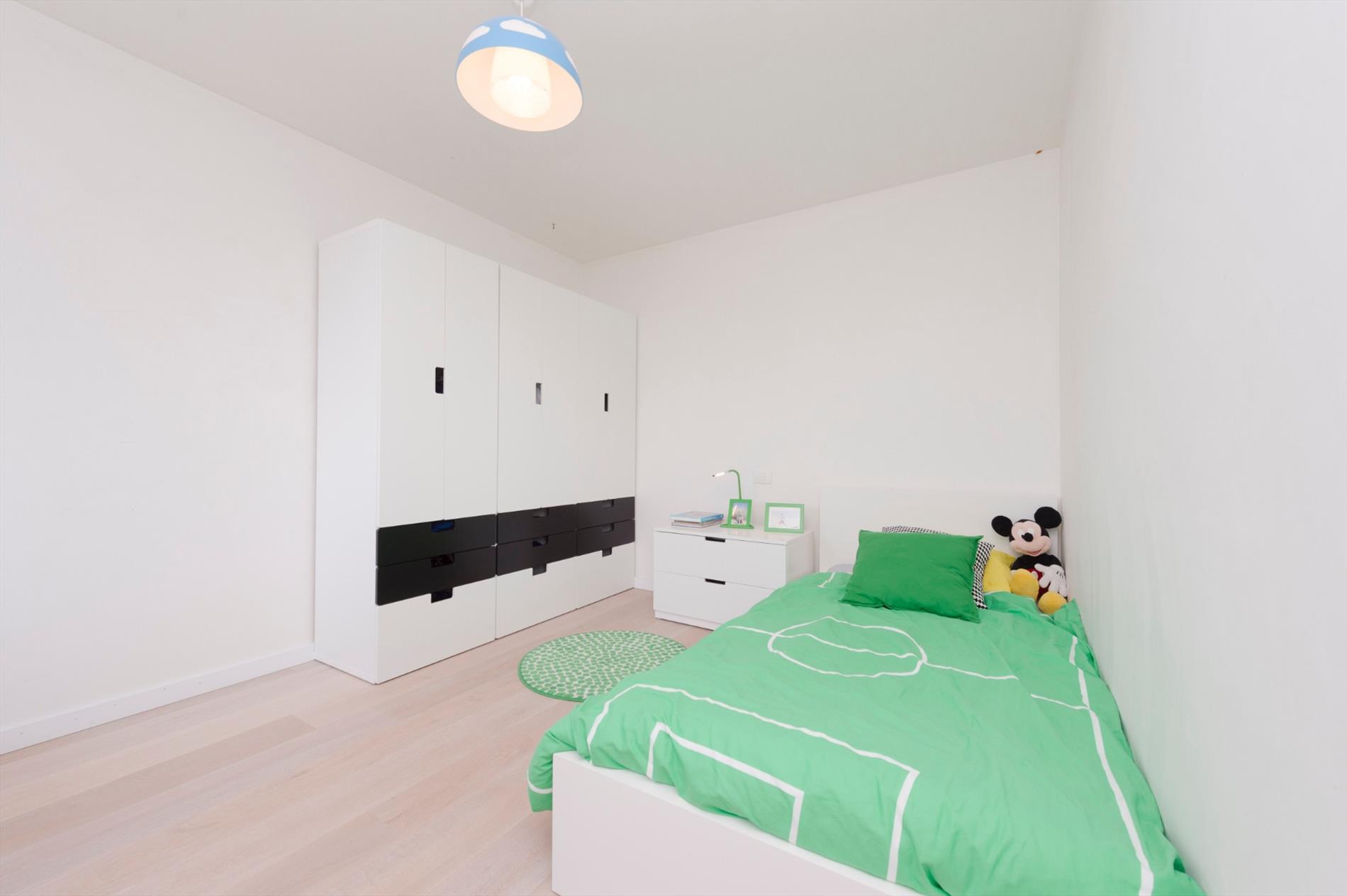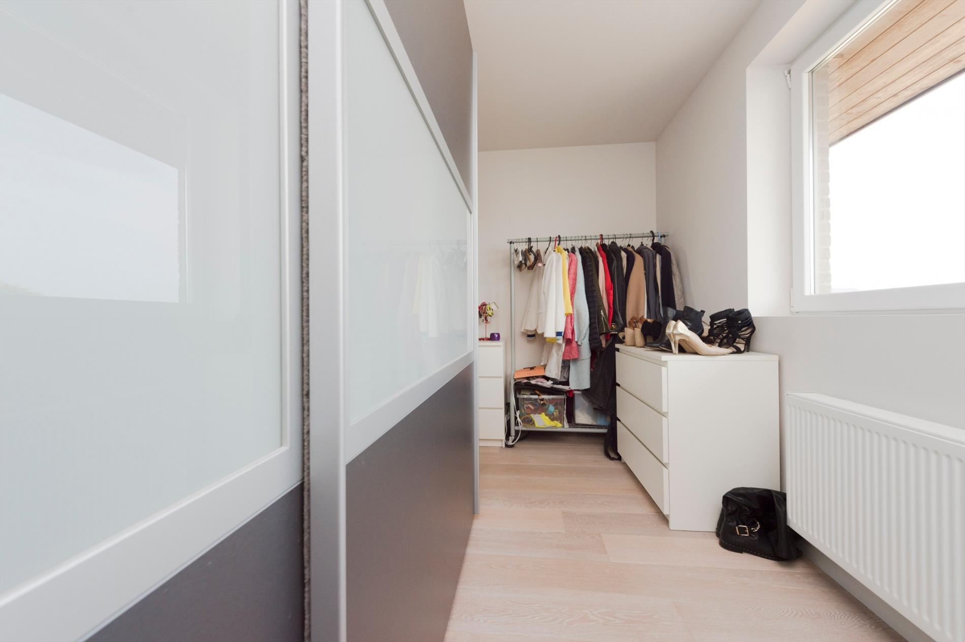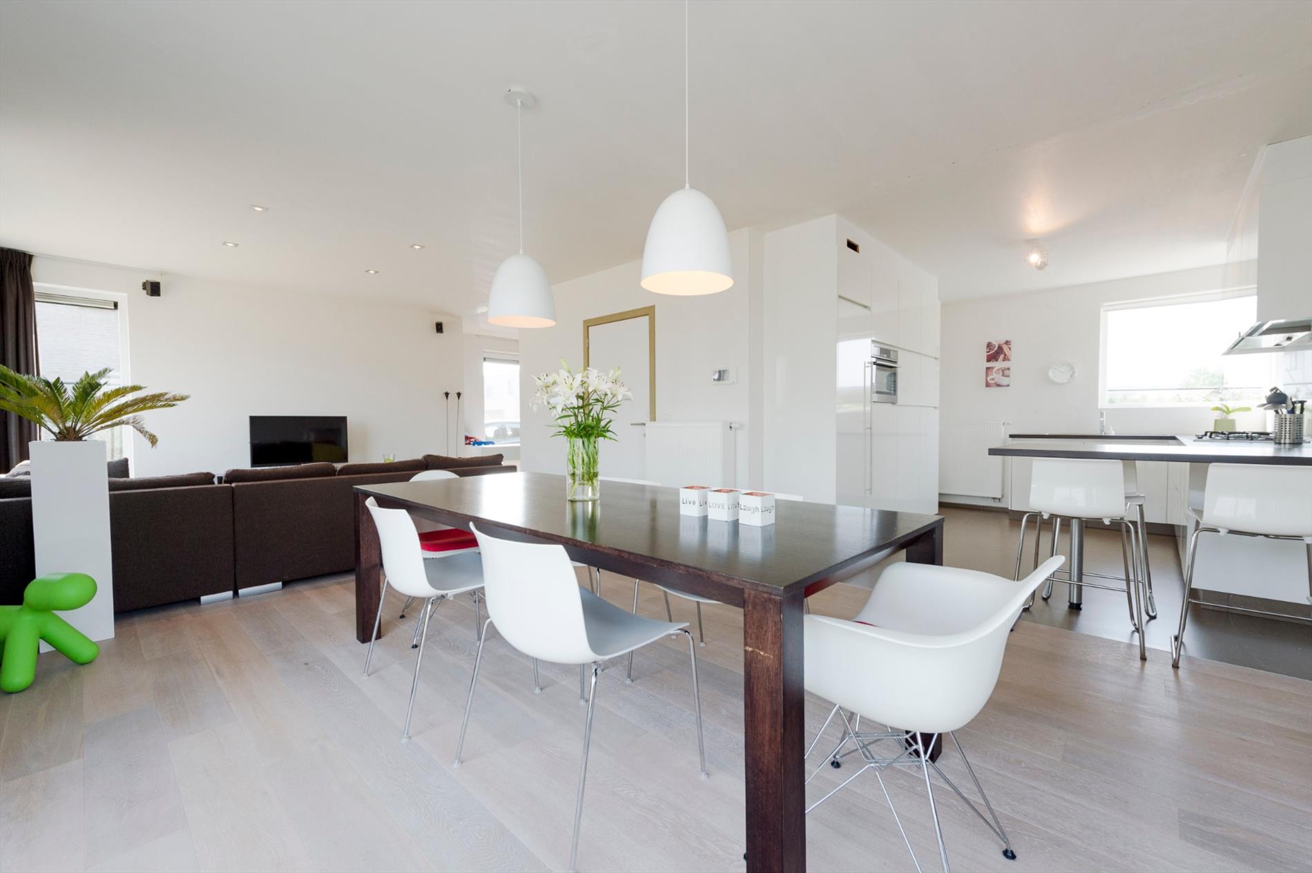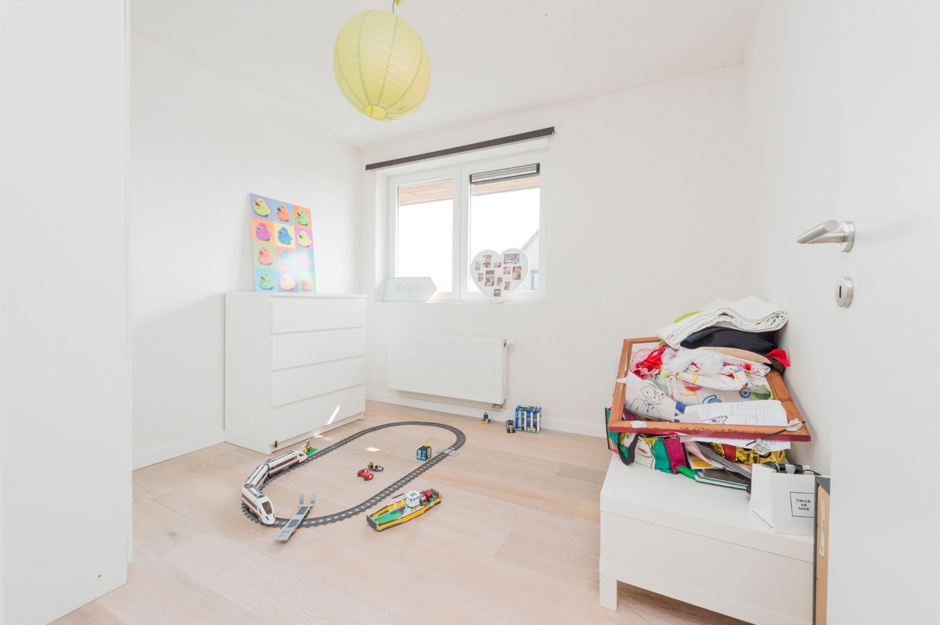 Gelijkvloers: We komen binnen in een lichtrijke inkomhal met apart toilet en plaats voor een vestiairekast. Via de inkom komen we in de woonkamer met zithoek en eetplaats. De ruime woonkamer (32 m²) is voorzien van 2 grote ramen, die voor veel lichtinval zorgen en een mooi zicht op de tuin bieden. Tevens is er nog een bureauruimte voorzien. De open, ingerichte keuken is uitgerust met een keramische kookplaat, combi-oven, vaatwasmachine, dubbele spoelbak, koelkast en dampkap. Vervolgens is er nog een handige berging van 11m² waar er ook aansluiting is voor een wasmachine en droogkast.