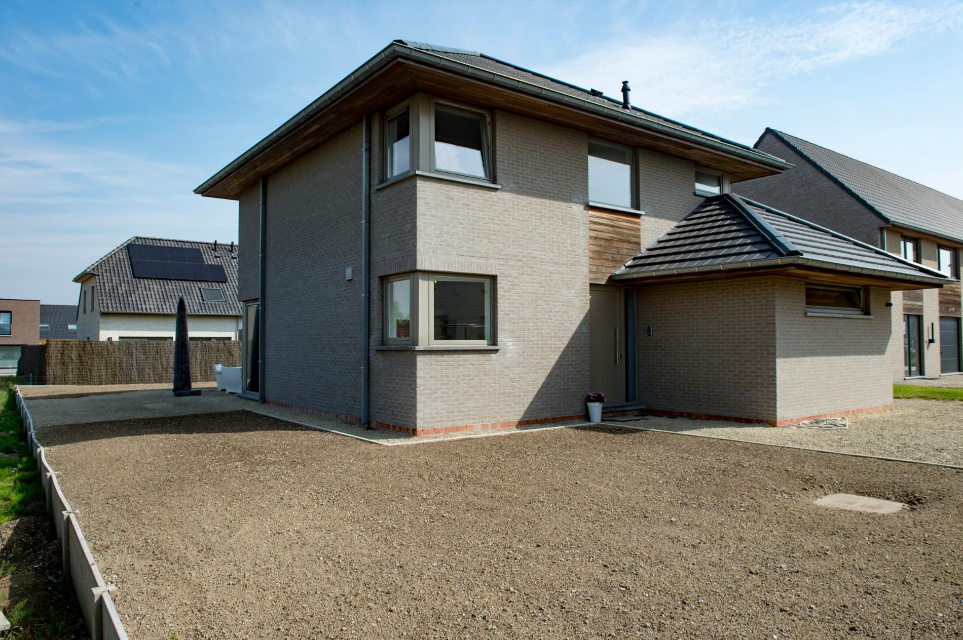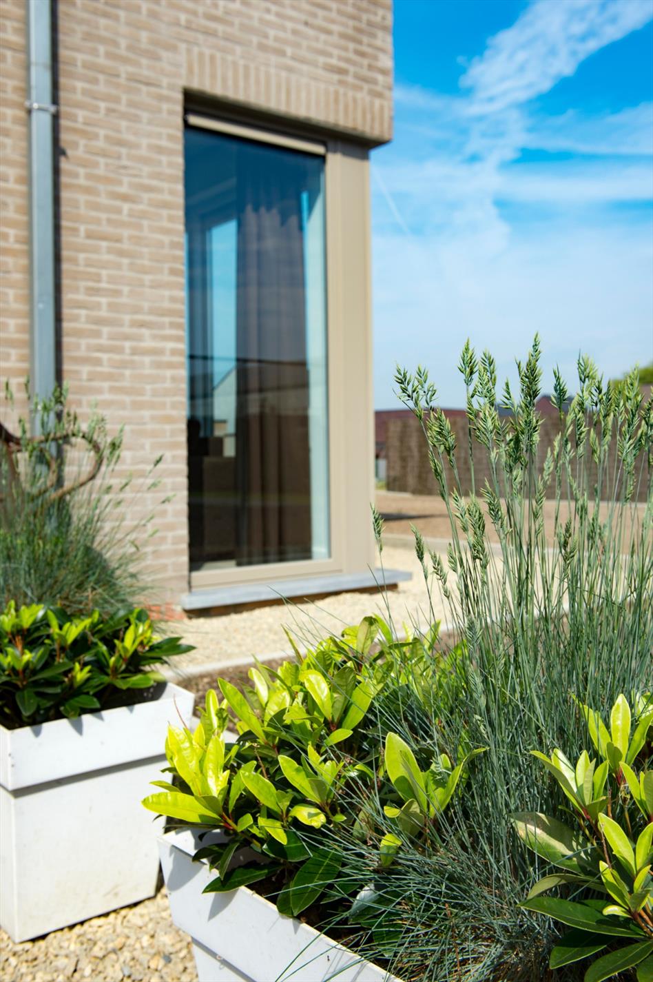Via de grote ramen in de woonkamer kan je gemakkelijk naar de tuin. De oprit en het terras zijn afgewerkt met kiezel. De oprit ligt naast de woning. Hier is er zeker voldoende plaats om meerdere wagens te parkeren.
