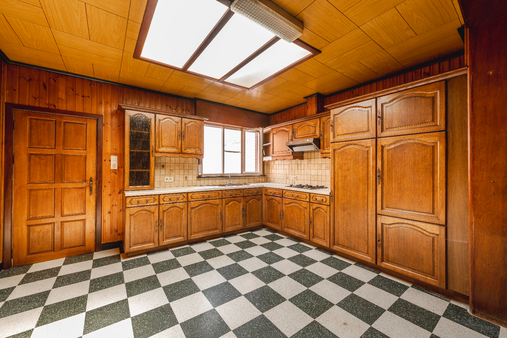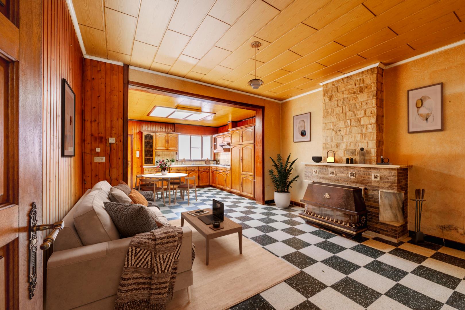 U komt binnen via de inkomhal met rechts directe toegang tot een bureau/berging of slaapkamer op het gelijkvloers. Terug in de inkomhal kan U rechtstreeks naar de ingerichte open keuken (kookplaat | dampkap | spoelbak | frigo) met eethoek en gezellige gaskachel.