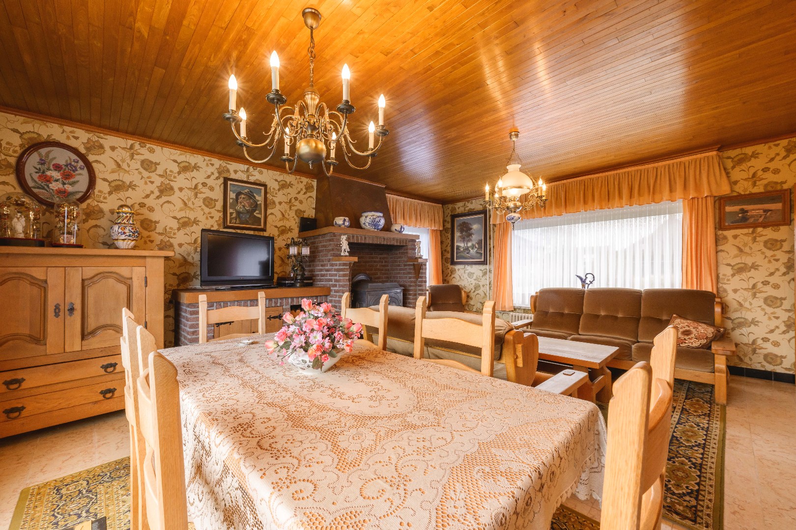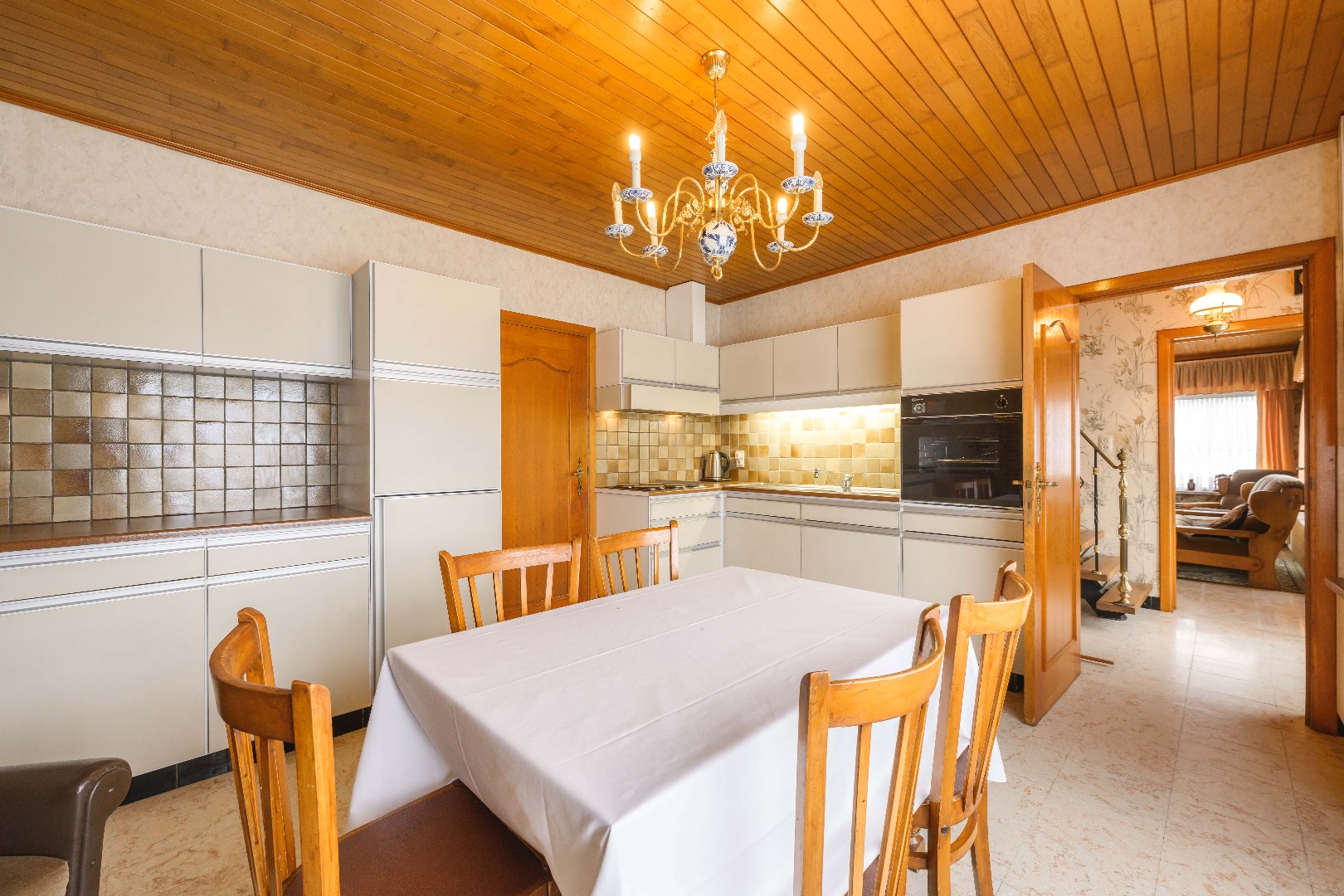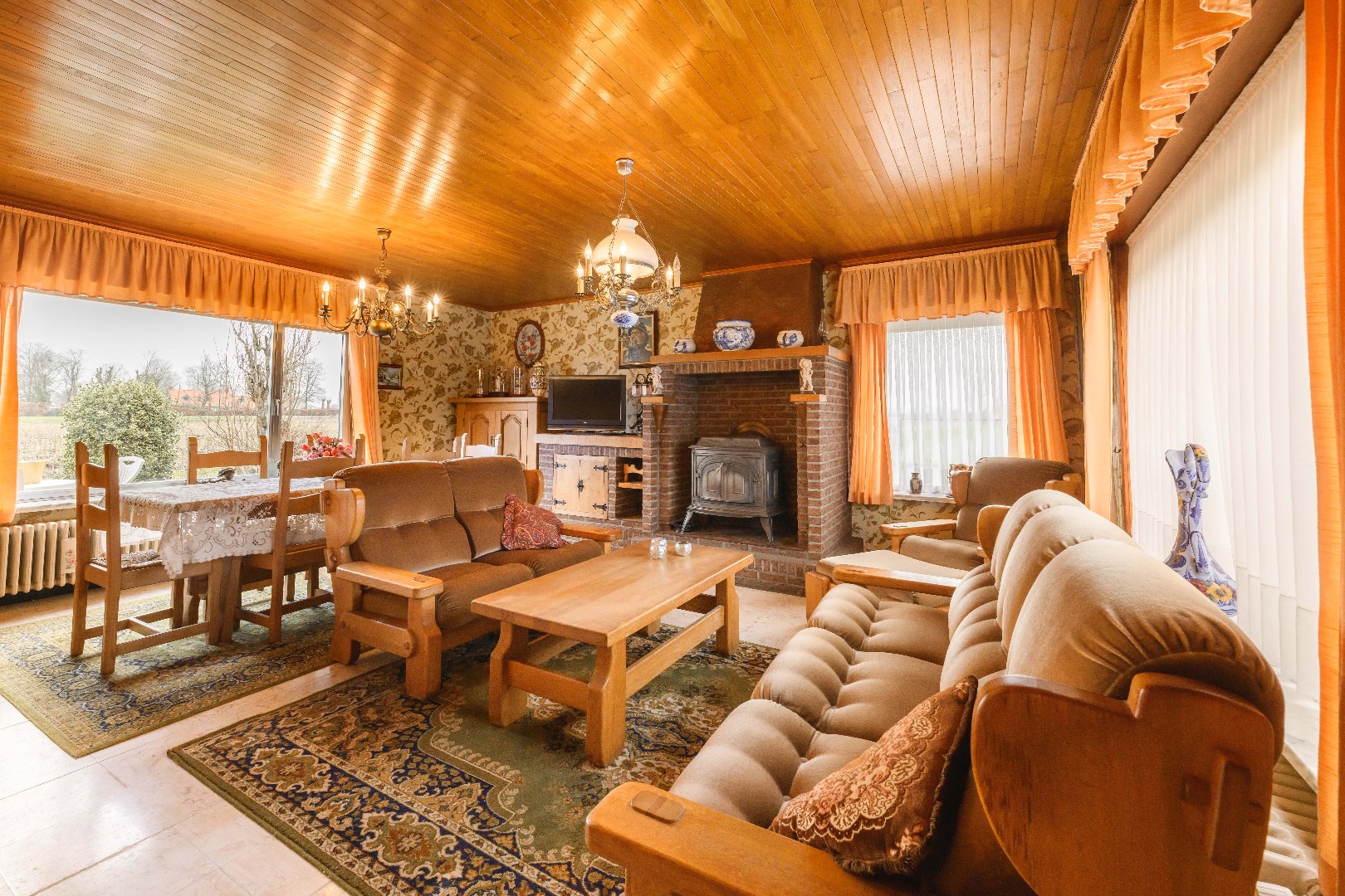 U komt binnen via de ruime inkomhal, waar je aan de rechterkant toegang hebt tot de lichtrijke leefruimte van 32 m². Hier vind je zowel een gezellige zit- en eethoek, alsook een gezellige houtkachel voor extra sfeer. De ingerichte keuken (20 m²) is voorzien van kookplaat, dampkap, spoelbak, oven en koelkast. Handig is de aansluitende koele berging (5m²). Later (1987) is de veranda (20 m²) aangebouwd, perfect om te genieten van de landelijke zichten.