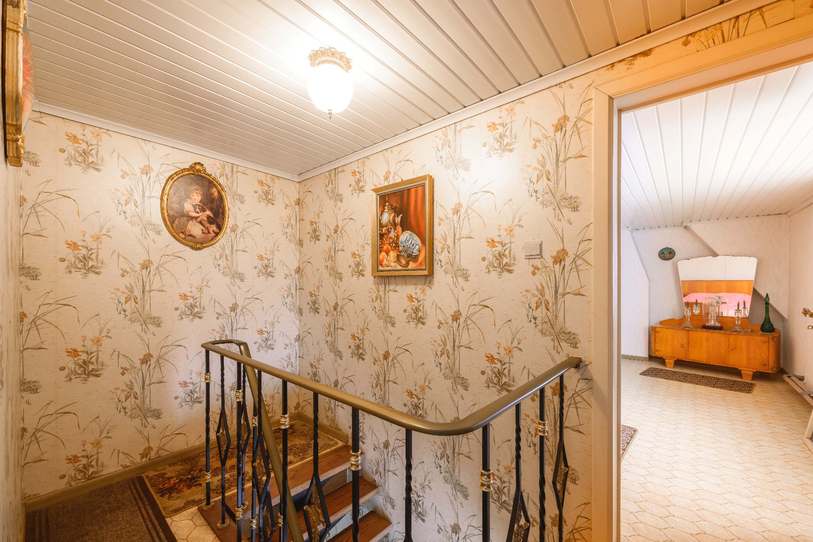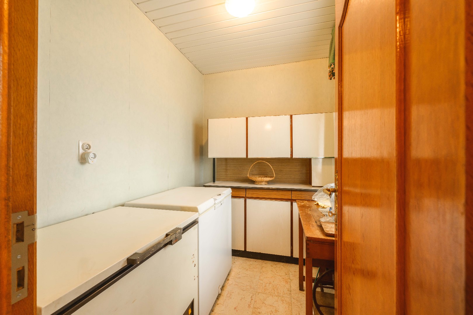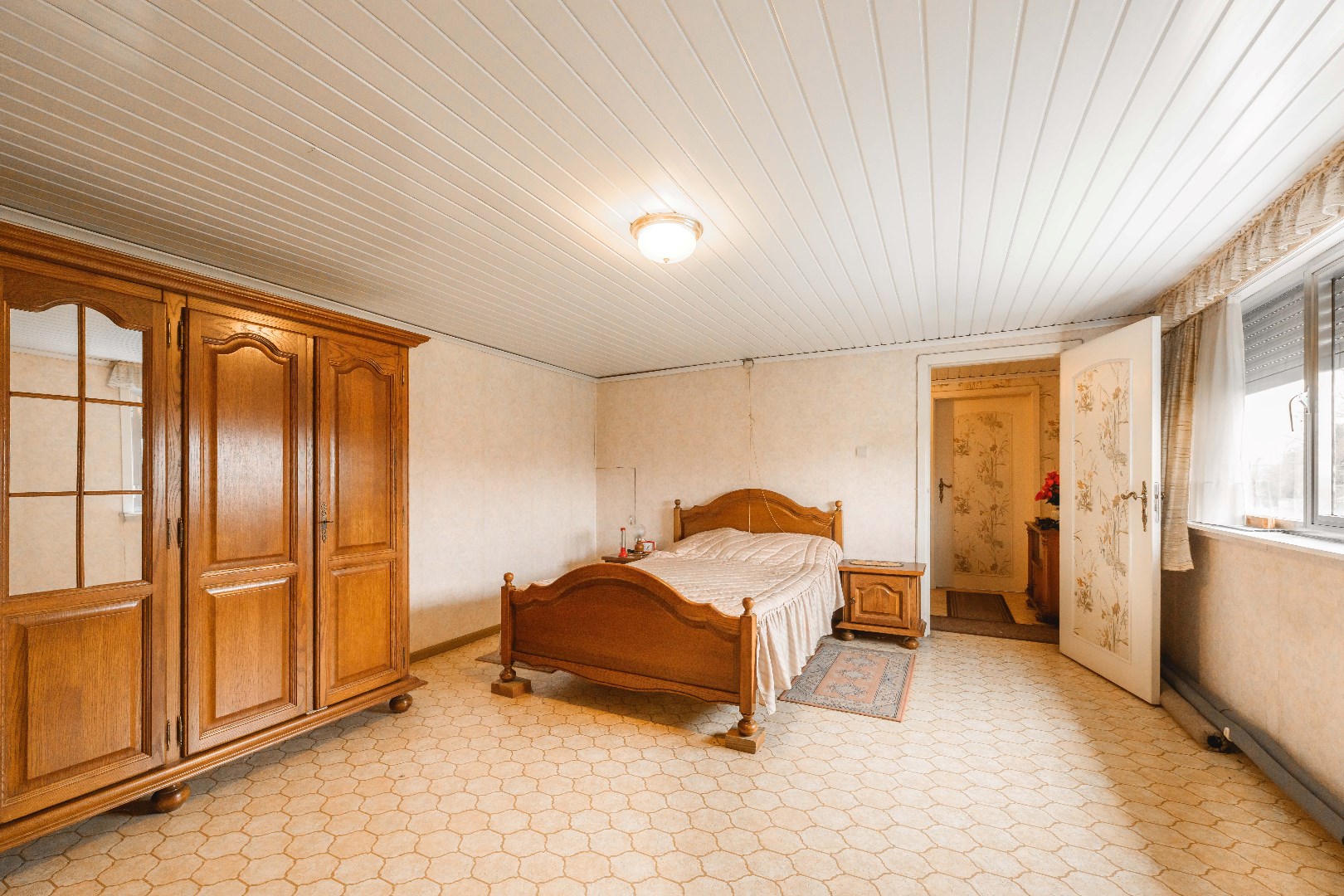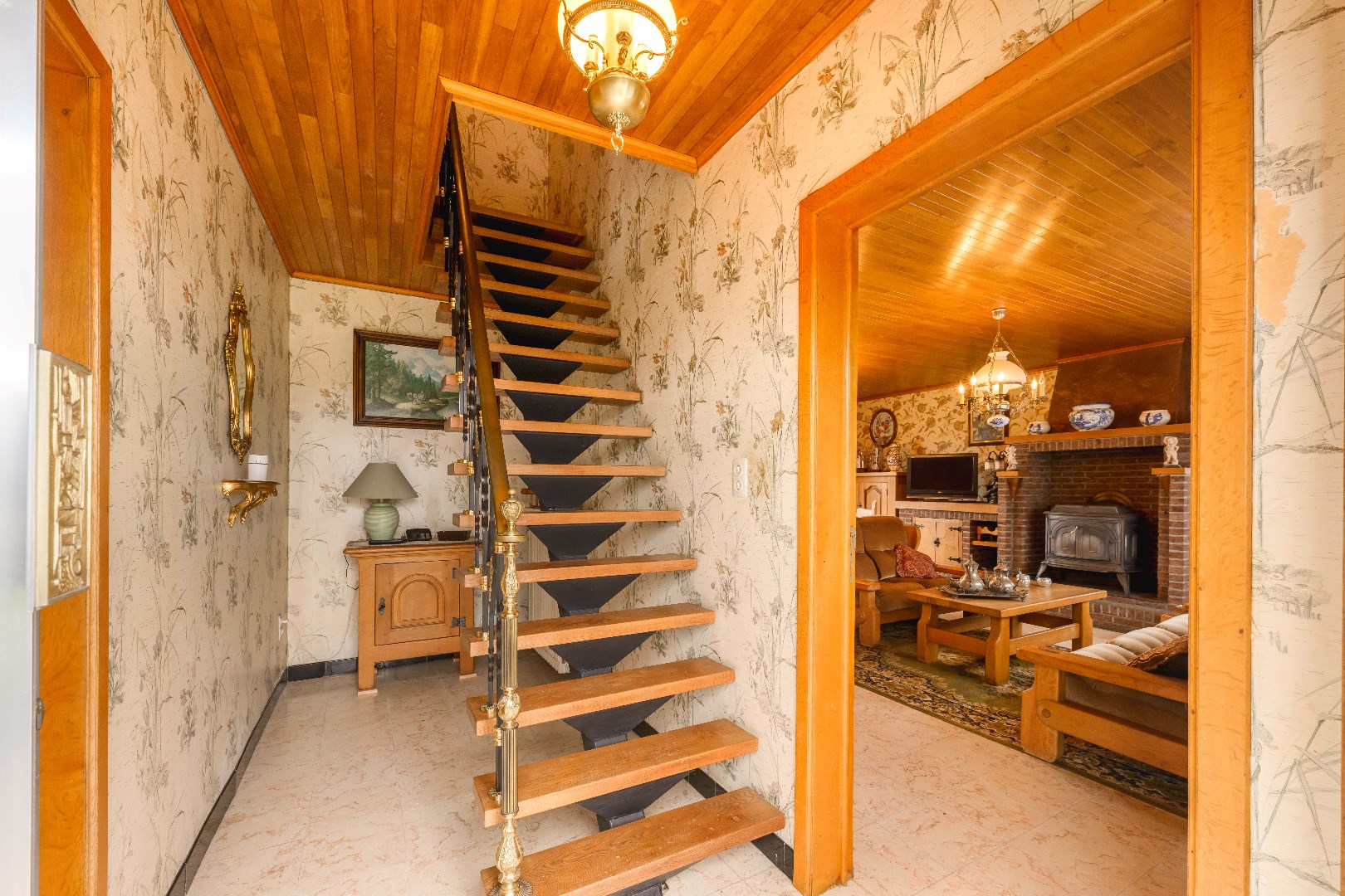 U komt binnen via de ruime inkomhal, waar je aan de rechterkant toegang hebt tot de lichtrijke leefruimte van 32 m². Hier vind je zowel een gezellige zit- en eethoek, alsook een gezellige houtkachel voor extra sfeer. De ingerichte keuken (20 m²) is voorzien van kookplaat, dampkap, spoelbak, oven en koelkast. Handig is de aansluitende koele berging (5m²). Later (1987) is de veranda (20 m²) aangebouwd, perfect om te genieten van de landelijke zichten.