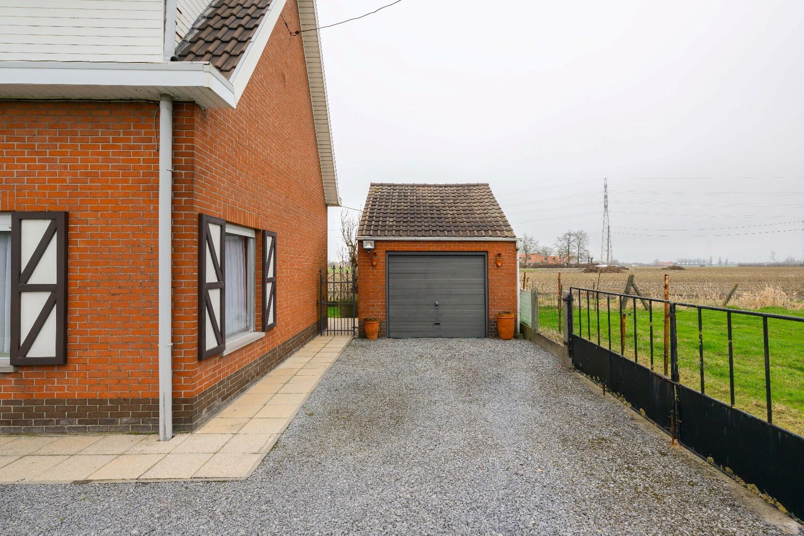 De oprit is afgesloten met een automatische schuifpoort.