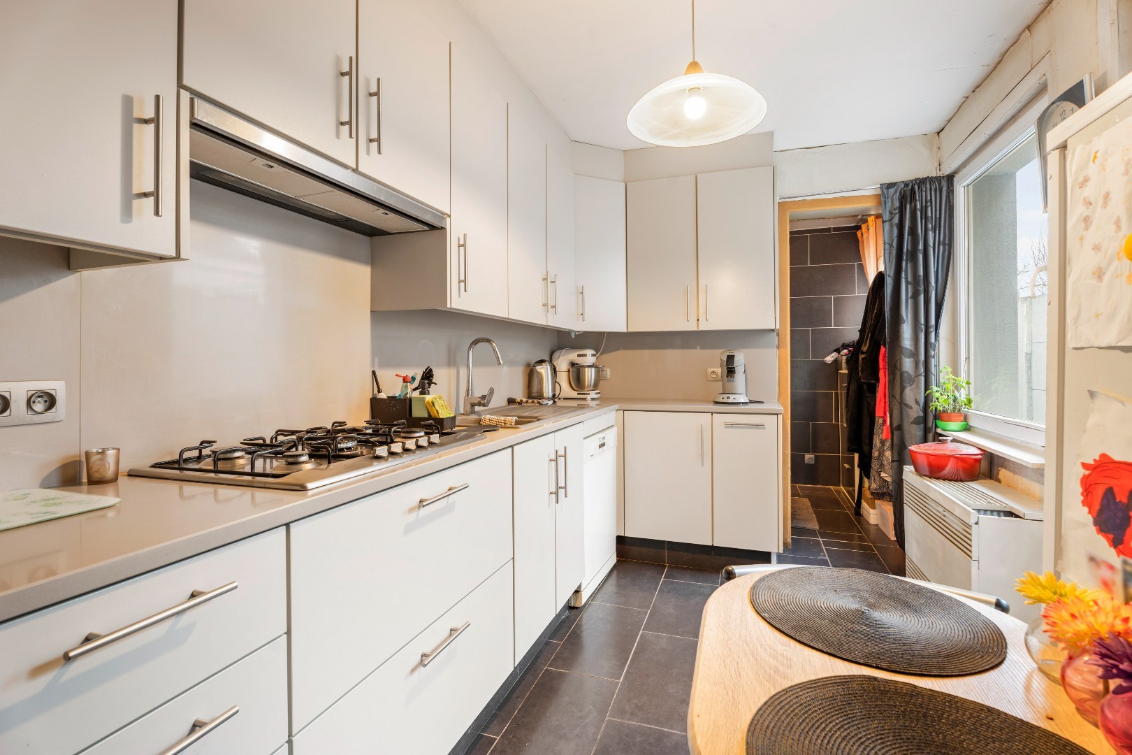 Aansluitend bevindt zich de volledig ingerichte keuken (2010) uitgerust met gasfornuis, dampkap, spoelbak, frigo, oven, microgolf en vaatwasser. Zowel vanuit de leefruimte als vanuit de keuken geniet u van een rechtstreekse toegang tot de tuin. Op het gelijkvloers vindt u bovendien de badkamer met lavabo en meubel, douche en toilet.