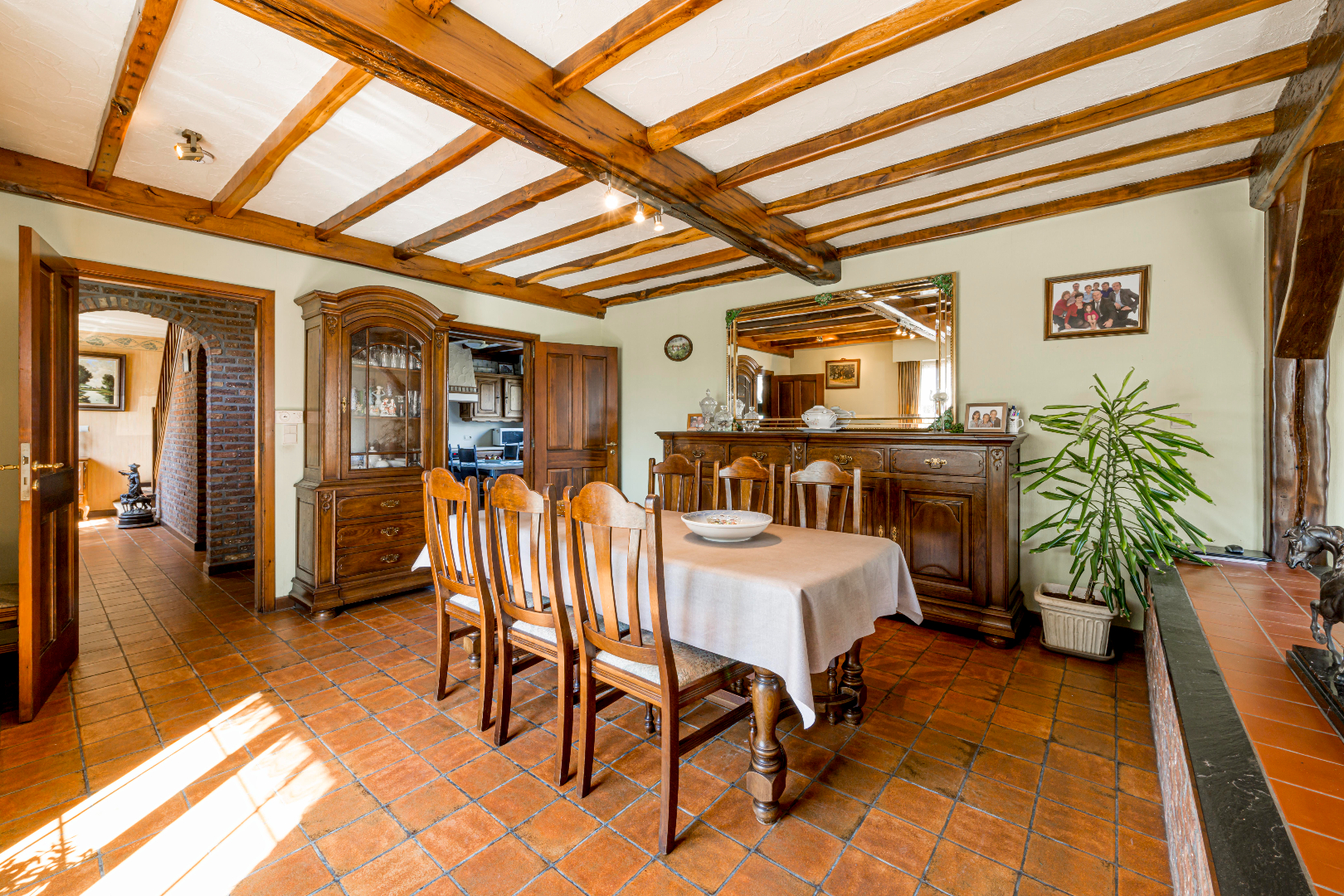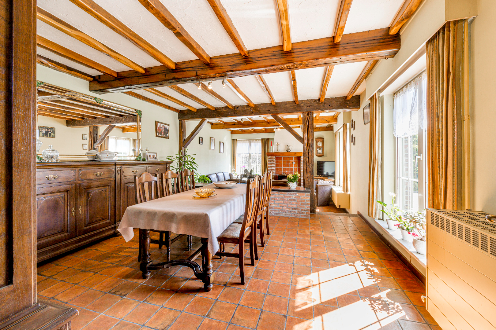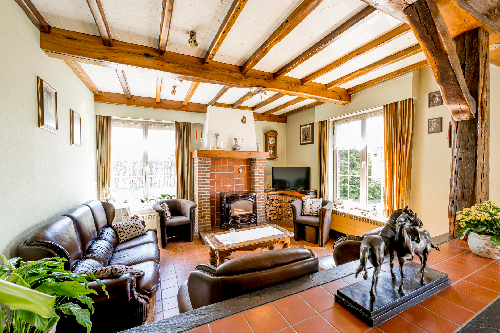 U komt binnen via de inkomhal met apart gastentoilet en vestiaire. Verder komt U terecht in de leefruimte (40,50 m²) die onder verdeeld is met een niveauverschil tussen eet- en zithoek. De gezellige zithoek is voorzien van een houtkachel. Verder is er de gesloten ingerichte leefkeuken 14,50 m² (kookplaat | dampkap | dubbele spoelbak | oven | frigo) met toegang tot de veranda. Aansluitend aan de keuken is er zowel een praktische koele berging alsook naar de inpandig garage met aansluiting voor wasmachine en droogkast en een tweede toilet die praktisch bereikbaar is via de achterinkom.