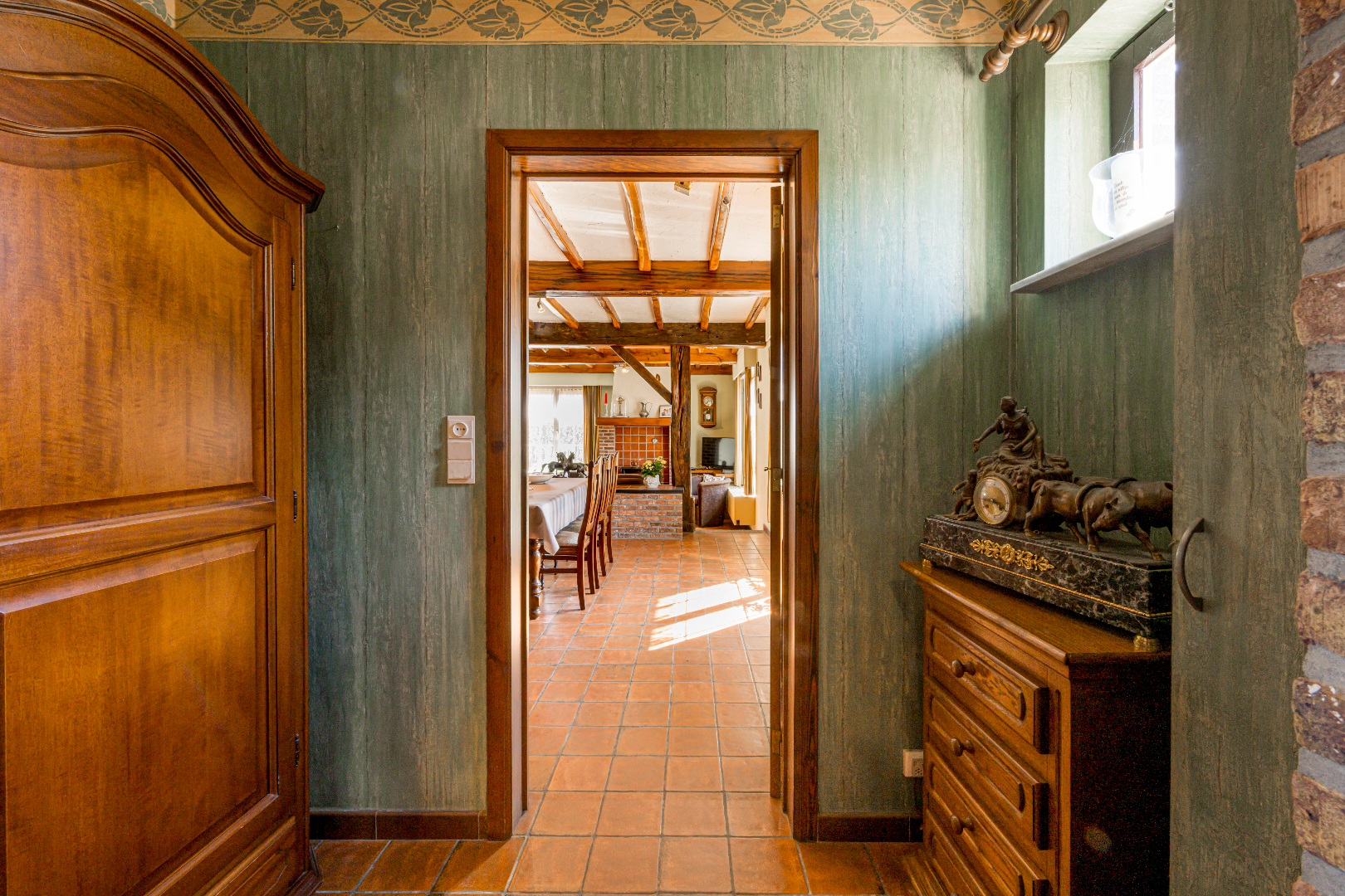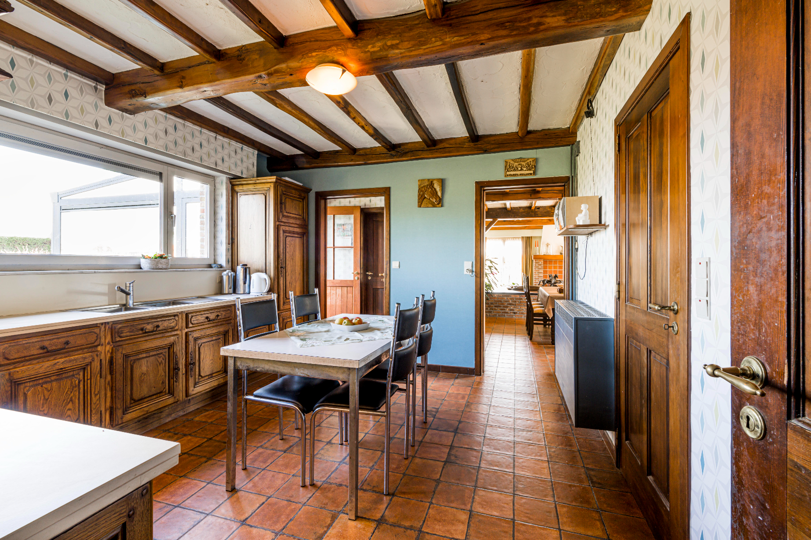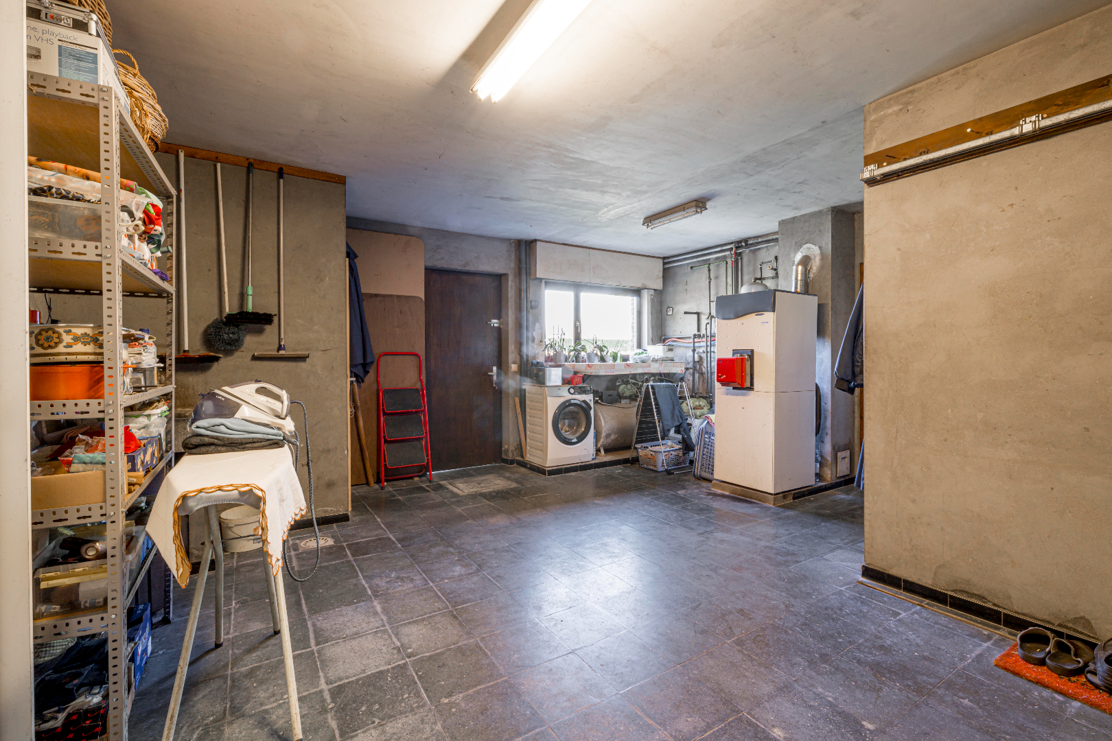 U komt binnen via de inkomhal met apart gastentoilet en vestiaire. Verder komt U terecht in de leefruimte (40,50 m²) die onder verdeeld is met een niveauverschil tussen eet- en zithoek. De gezellige zithoek is voorzien van een houtkachel. Verder is er de gesloten ingerichte leefkeuken 14,50 m² (kookplaat | dampkap | dubbele spoelbak | oven | frigo) met toegang tot de veranda. Aansluitend aan de keuken is er zowel een praktische koele berging alsook naar de inpandig garage met aansluiting voor wasmachine en droogkast en een tweede toilet die praktisch bereikbaar is via de achterinkom.