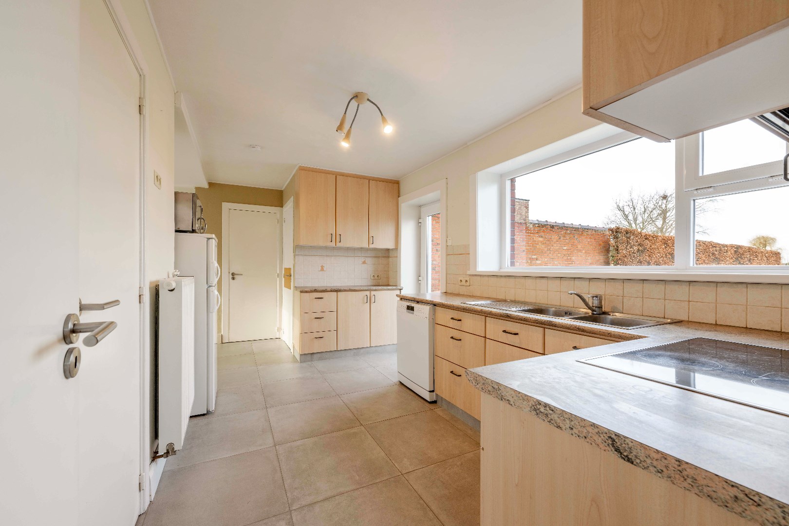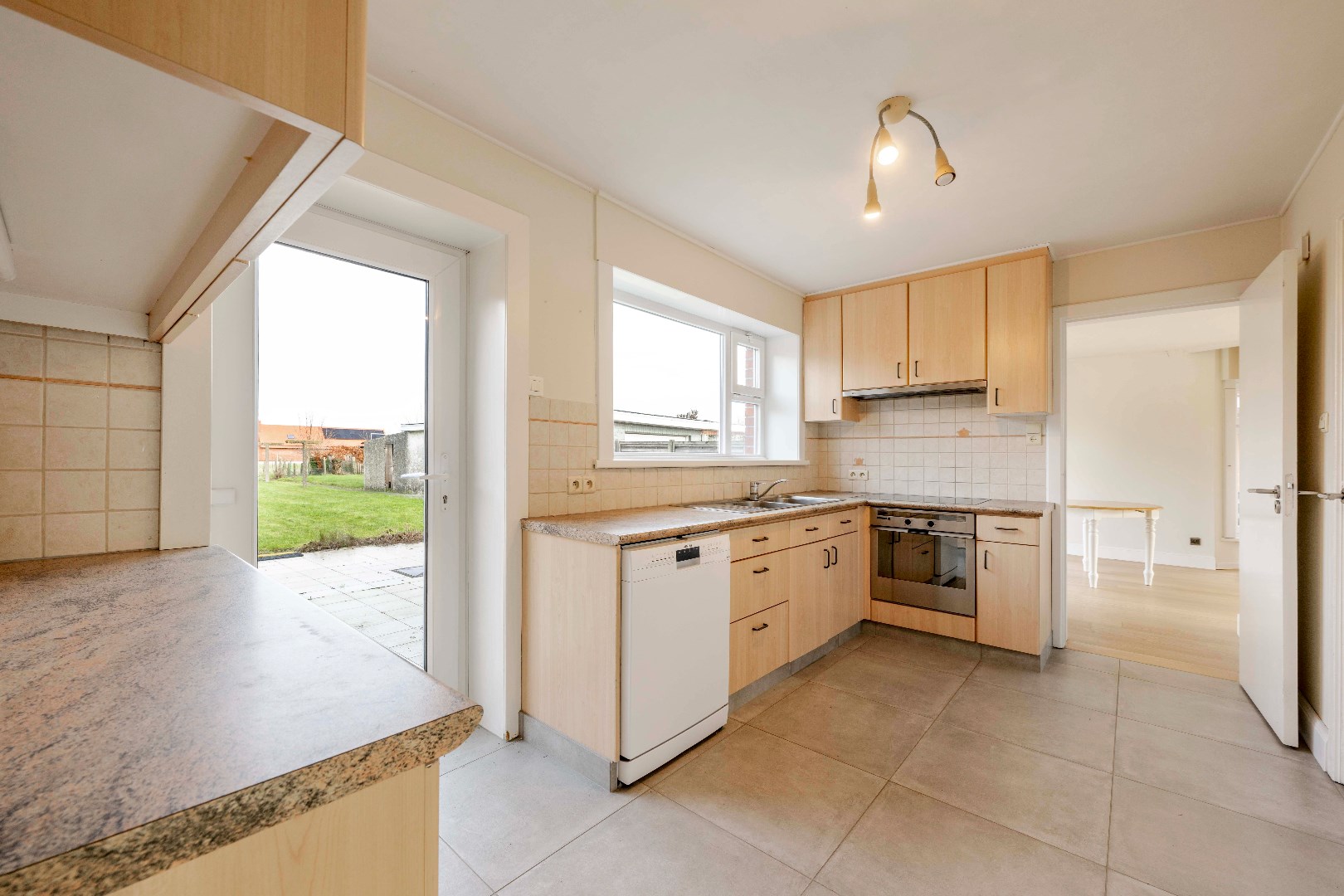 Vervolgens komt U terecht in de gesloten keuken (10,50 m²) met aansluitende eetkamer (16 m²) met zicht alsook directe toegang tot de tuin. De keuken is voorzien van een dubbele spoelbak | oven | frigo | microgolf | keramische kookplaat met dampkap. Handig is de aansluitende droge kelder en de 2 aparte bergingen.