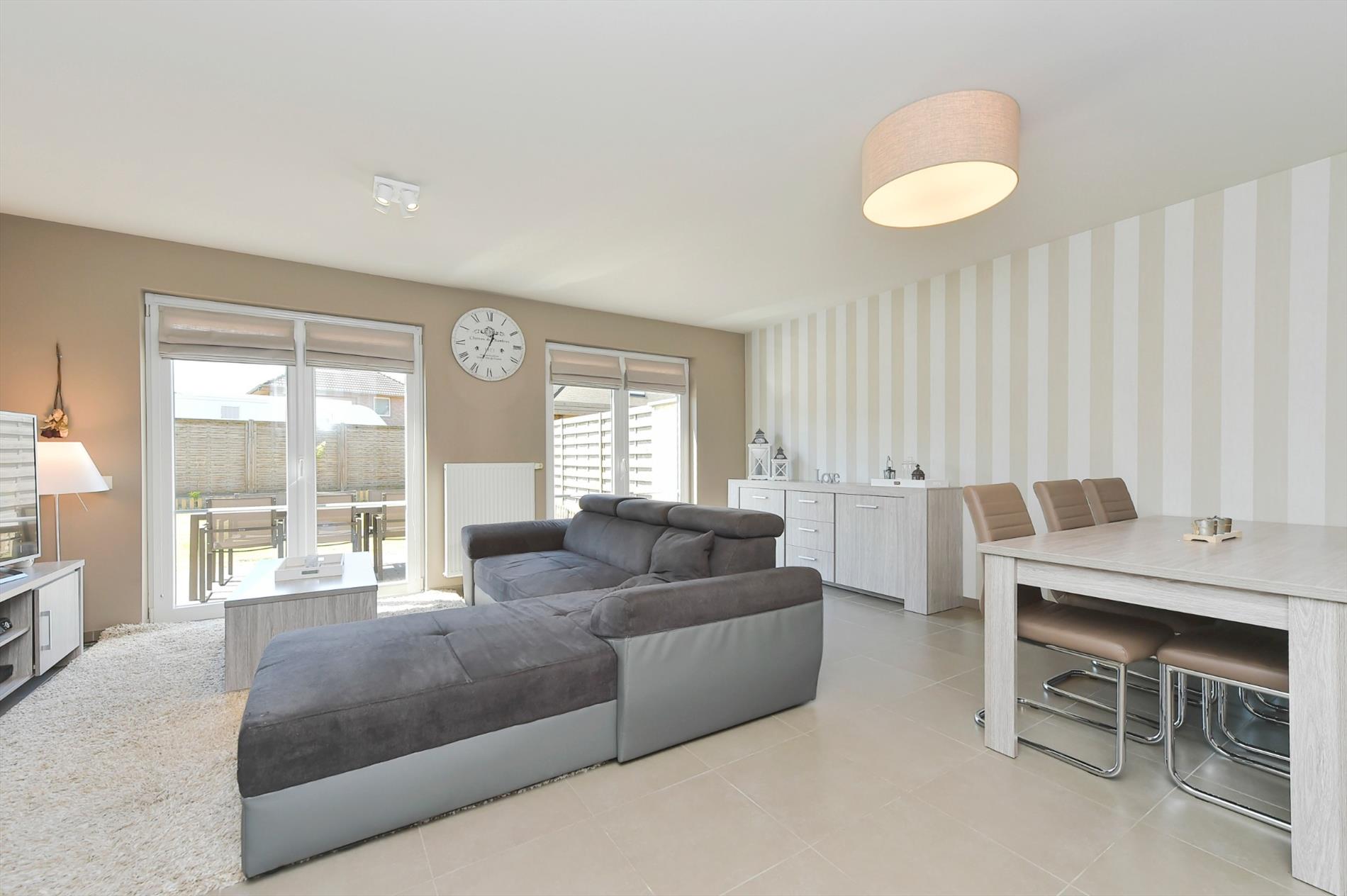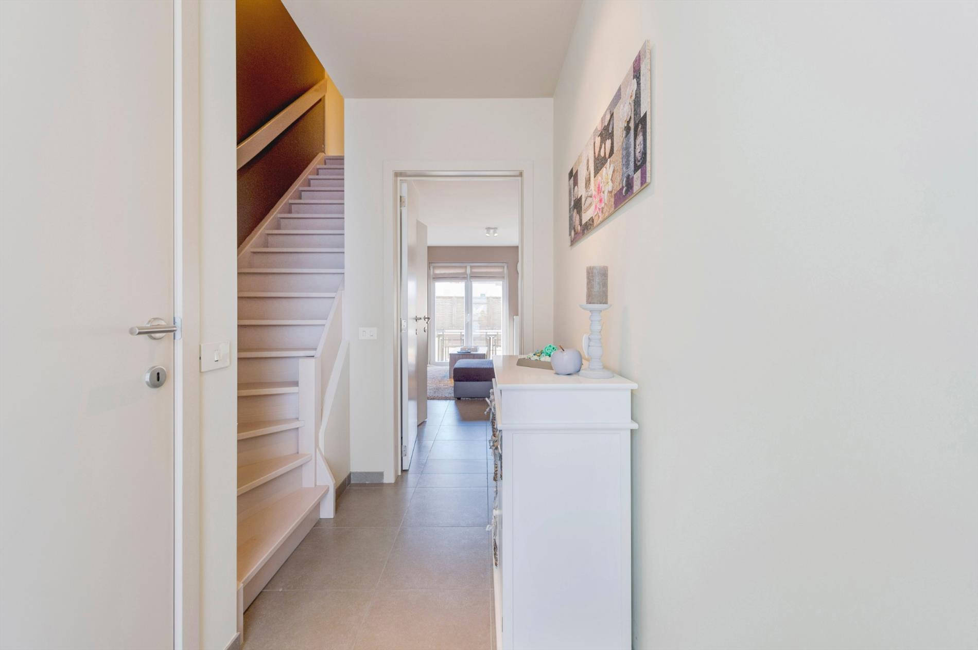 Inkom eveneens traphal met apart bezoekerstoilet. Via de inkom komen we in de L-vormige en heel ruime living met open ingerichte keuken. Directe toegang tot het zuidgericht terras en perfect afgewerkte tuin.