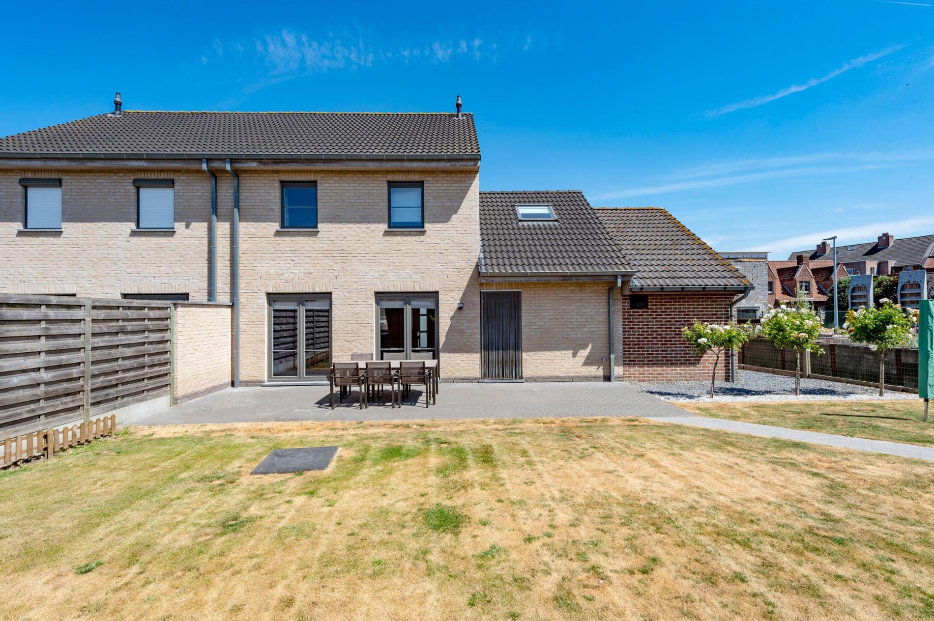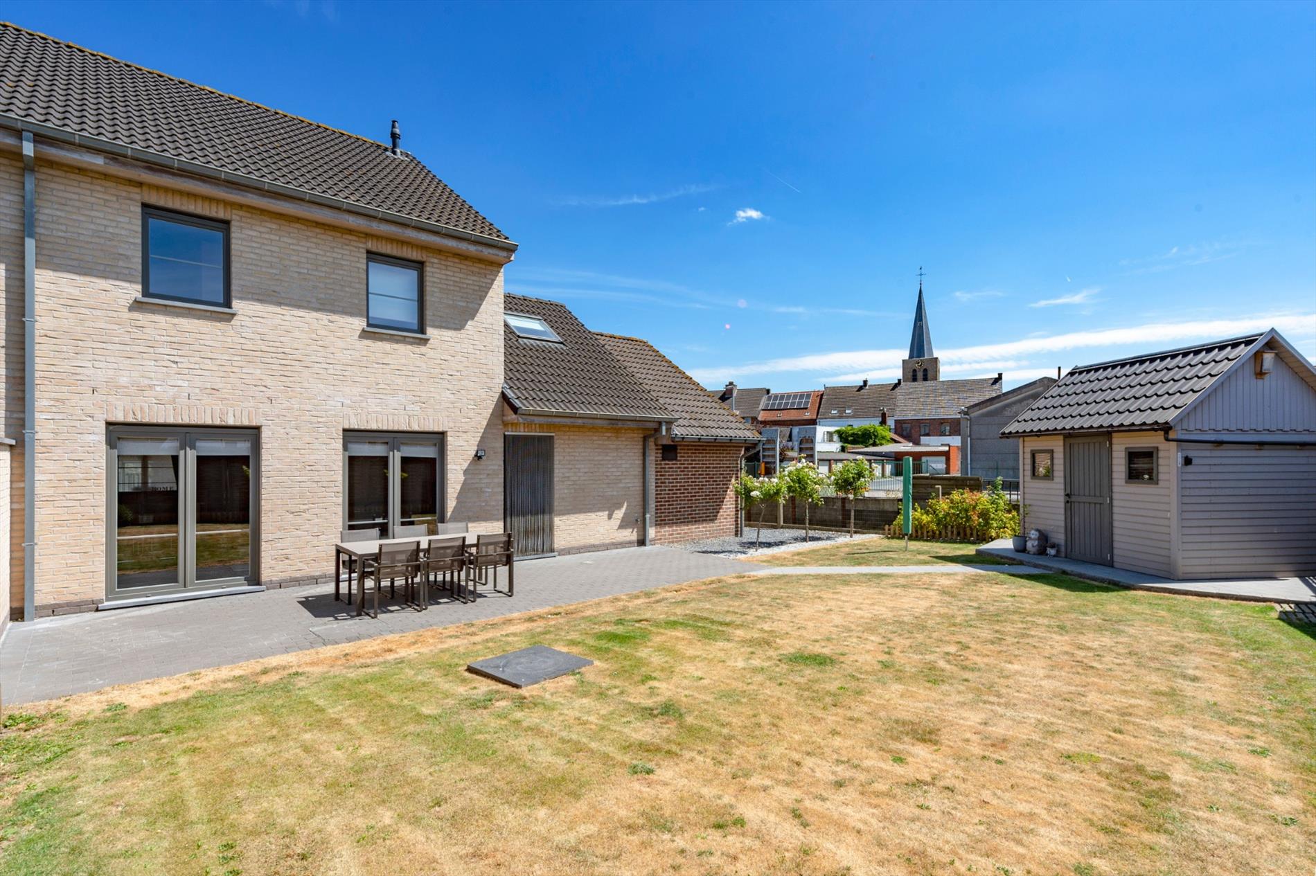 De tuin is volledig afgewerkt alsook voorzien van terras en tuinhuis. De eigendom is volledig afgesloten en ingevolge kindvriendelijk.